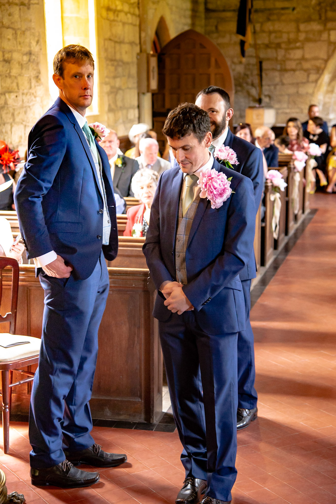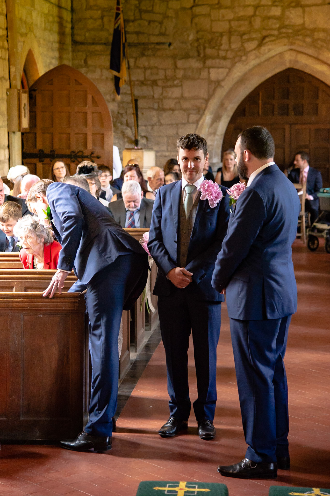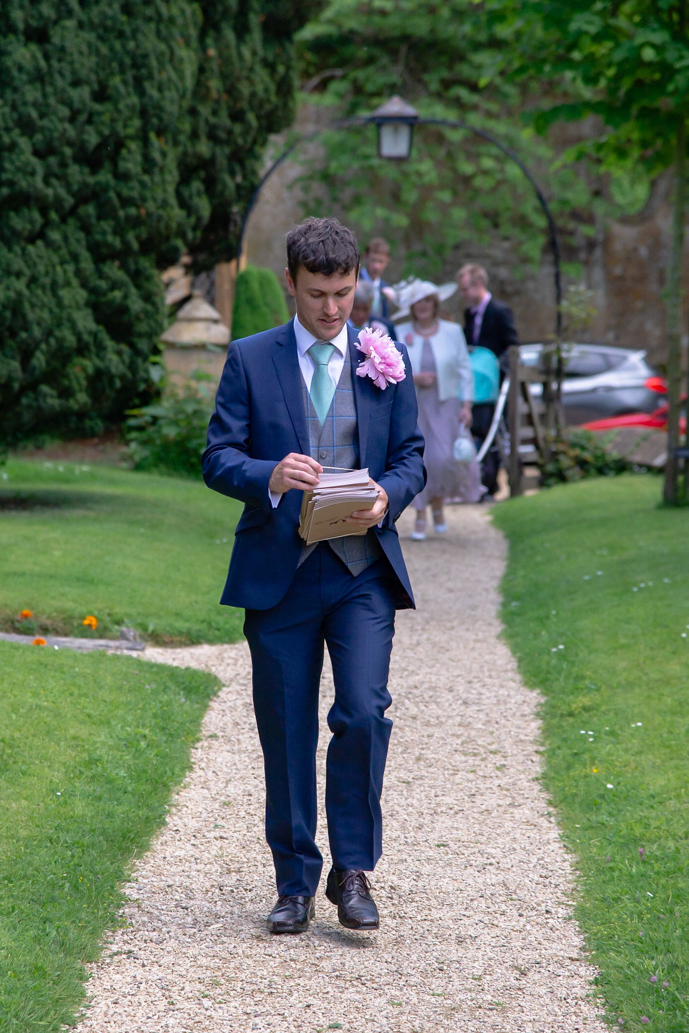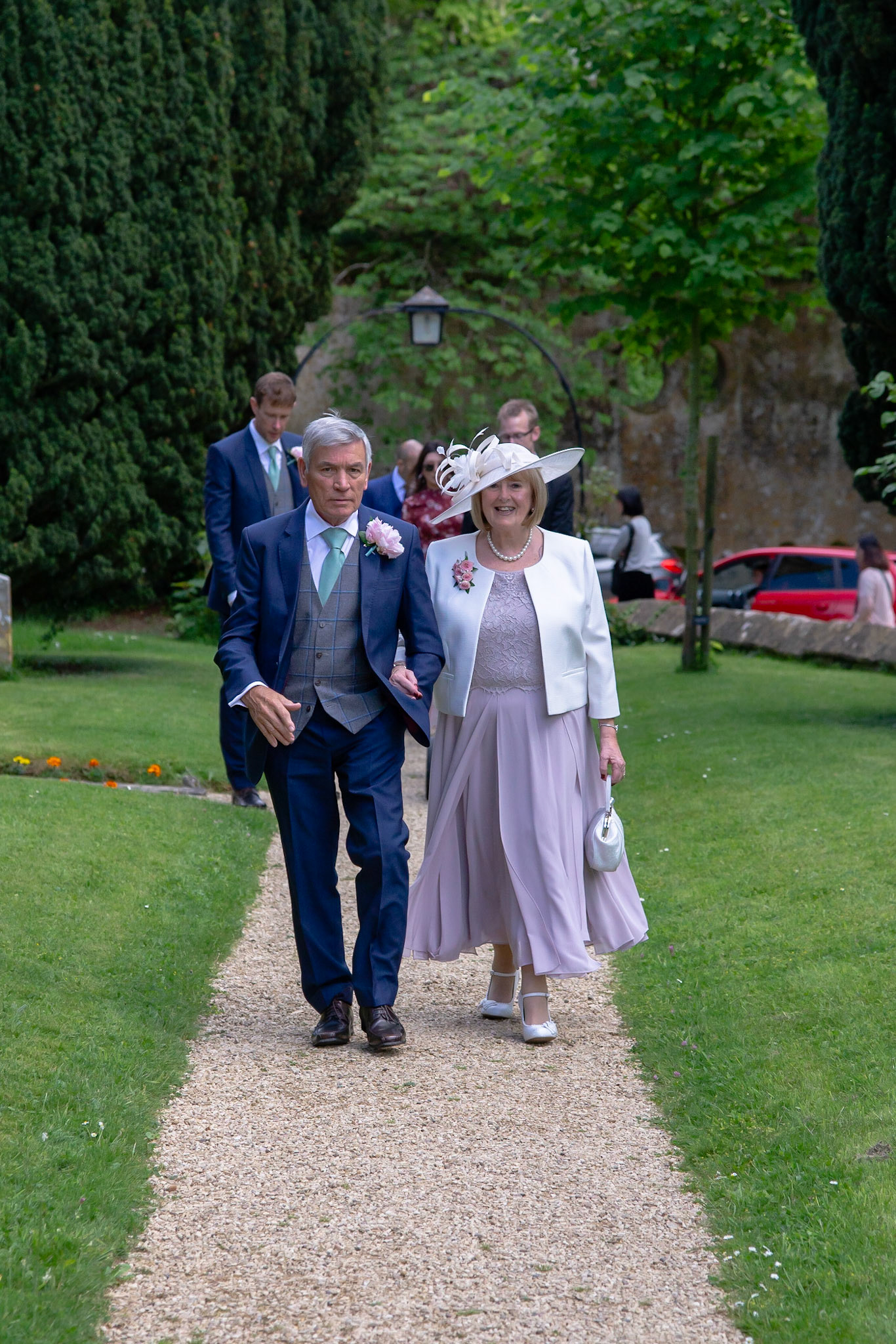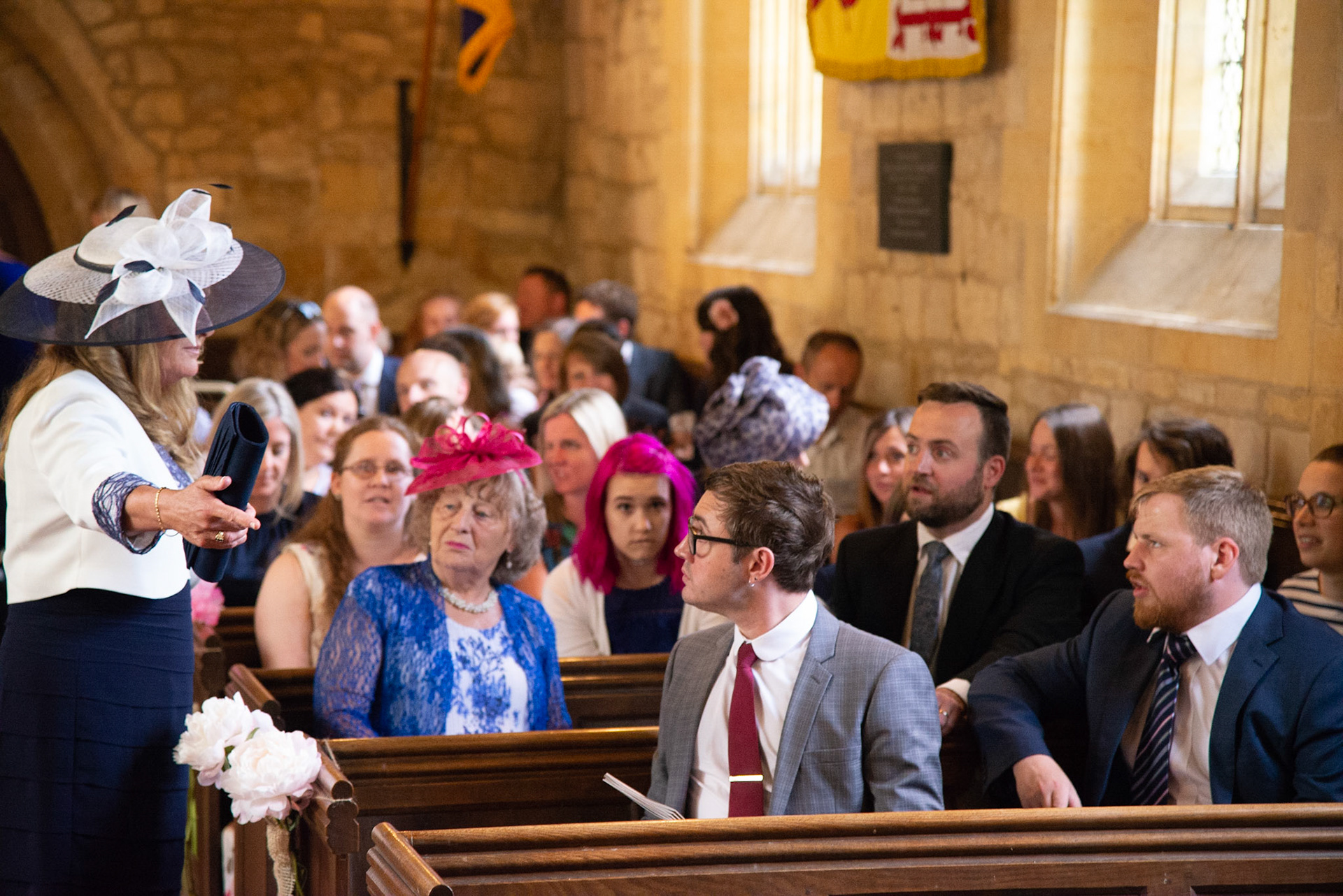 Photos of the guests arriving at the church, Matt in the church and Naomi arriving in the car.