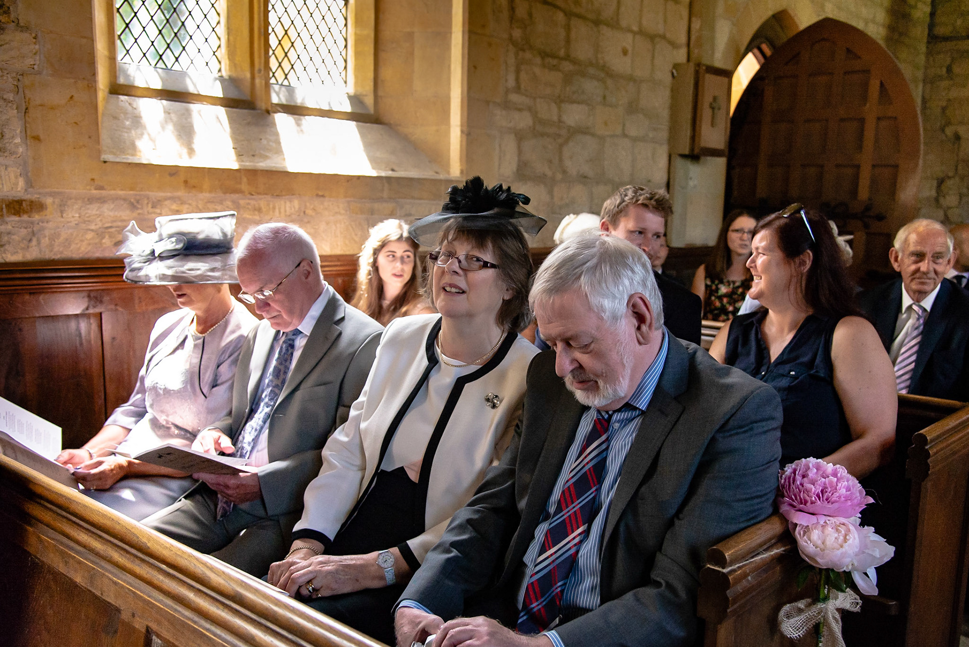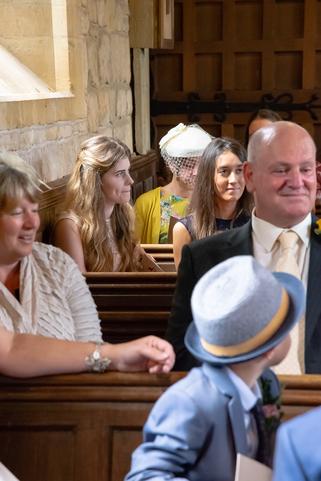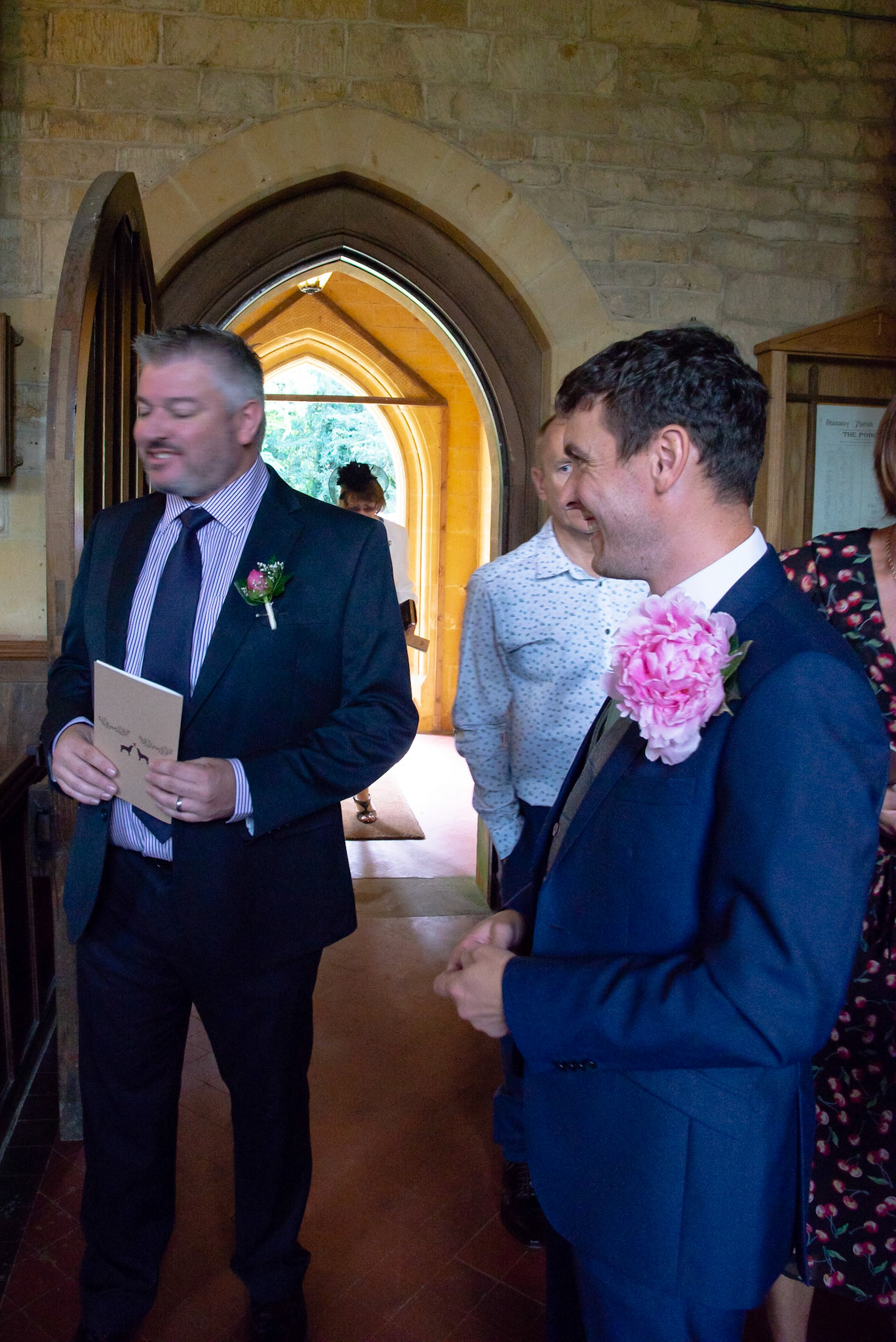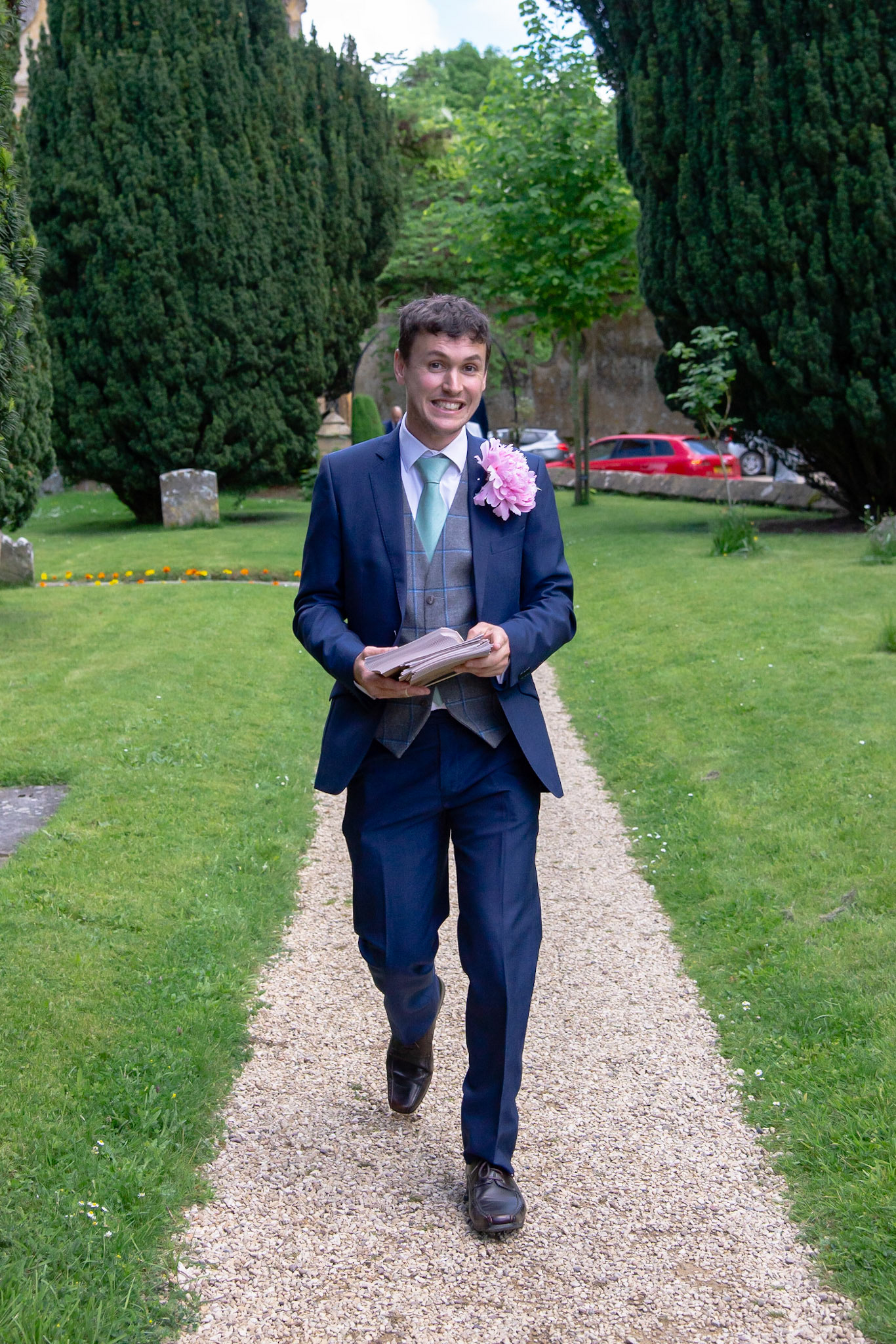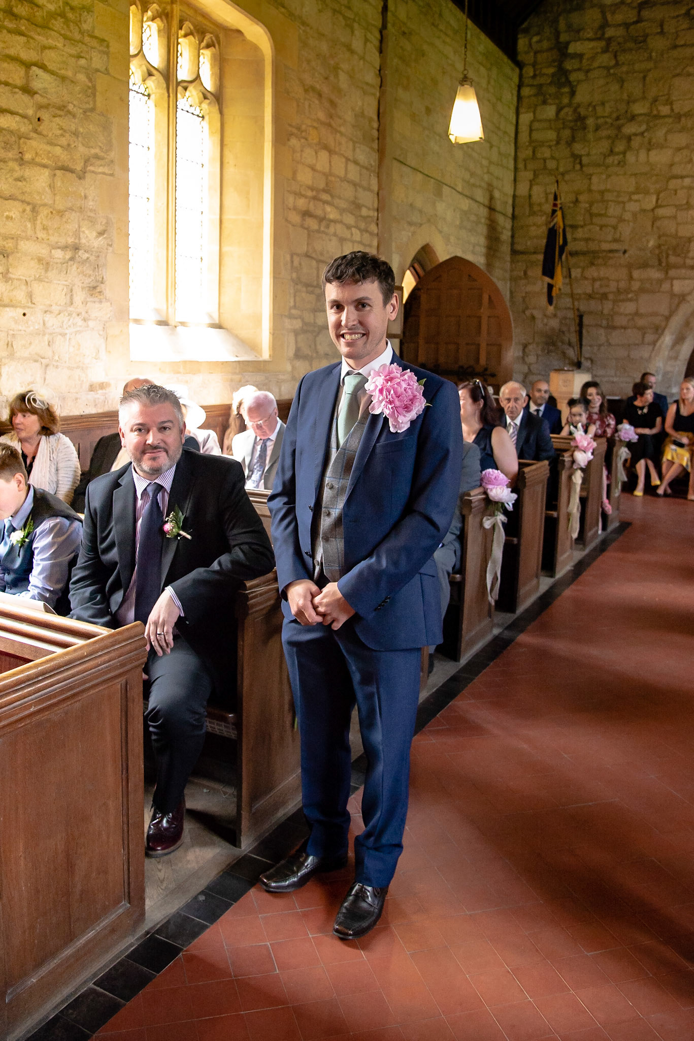 Photos of the guests arriving at the church, Matt in the church and Naomi arriving in the car.