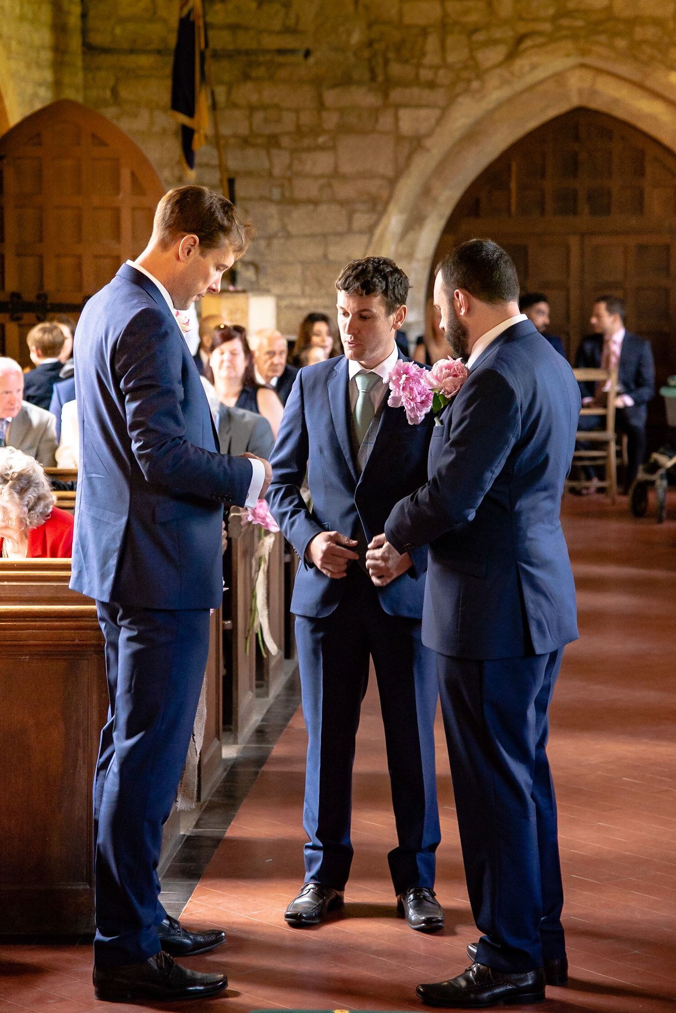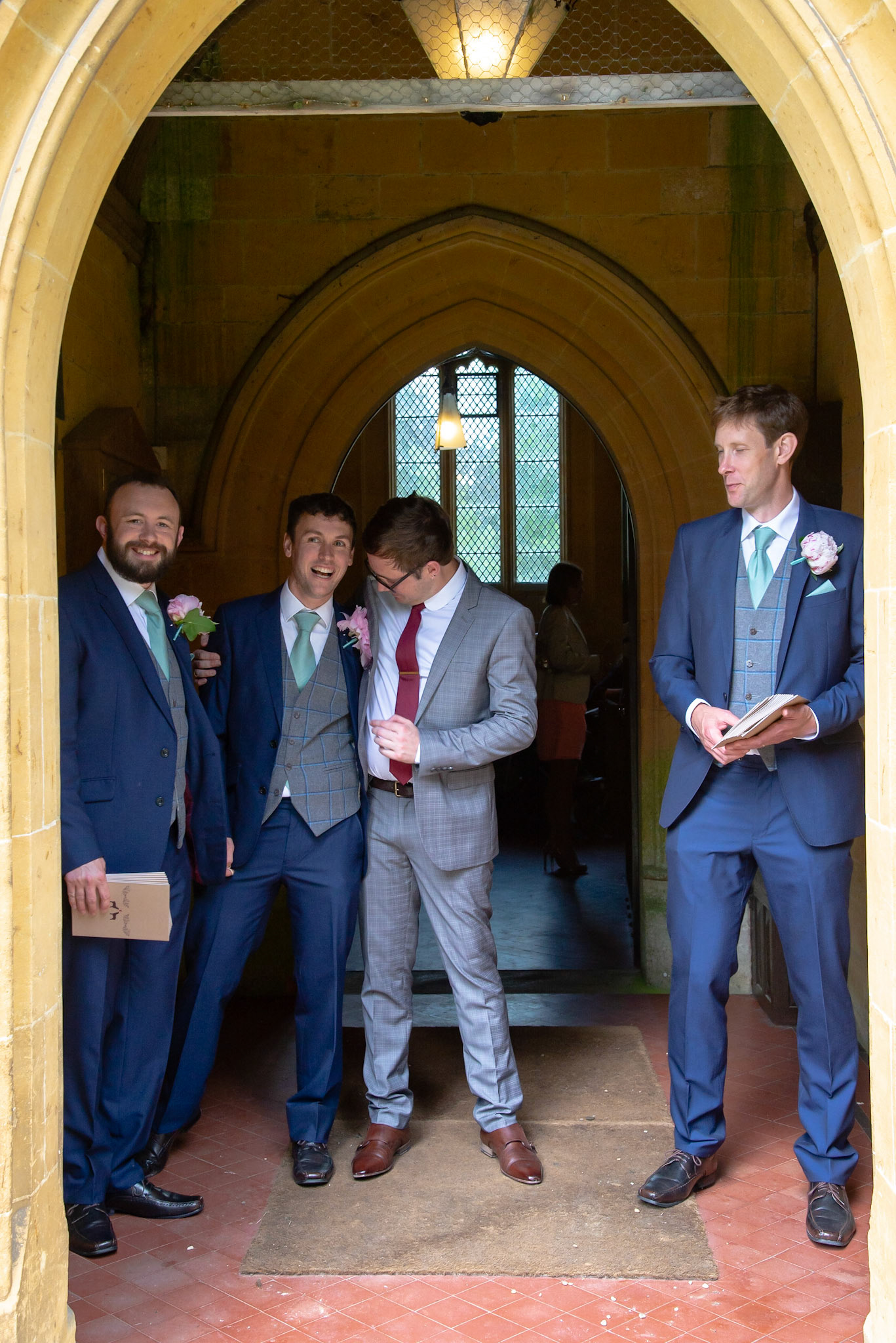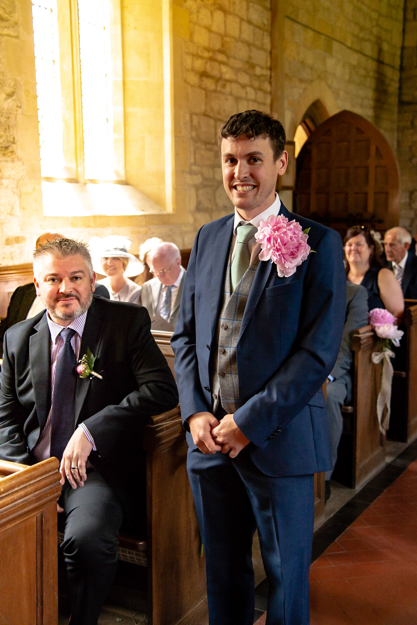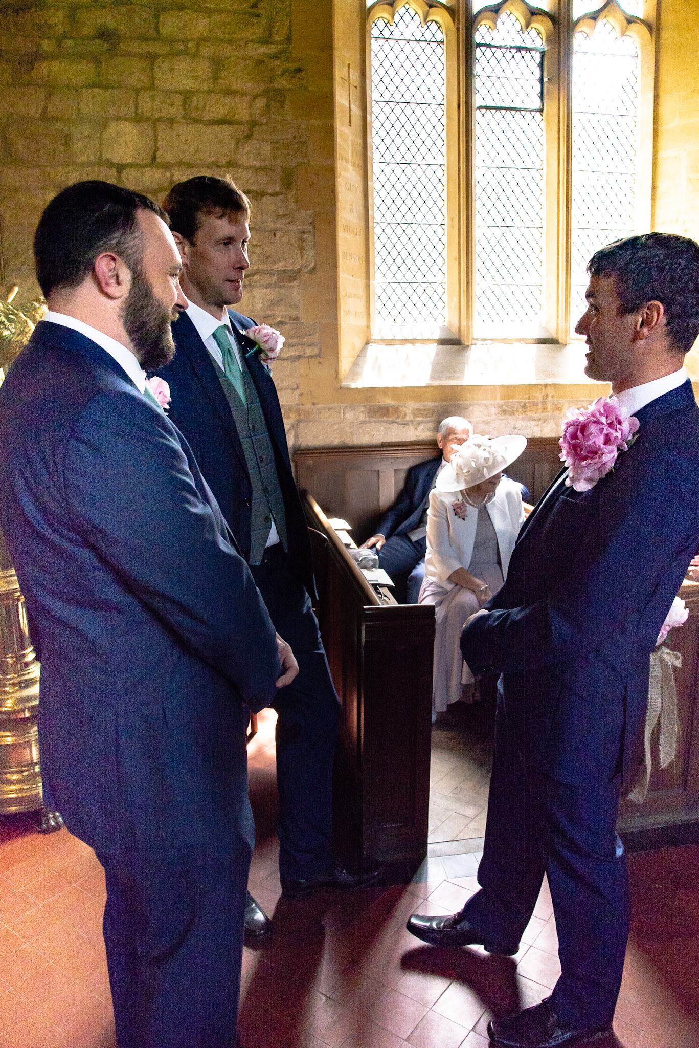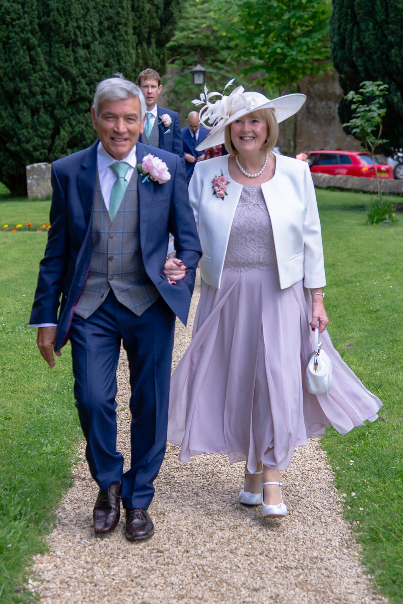 Photos of the guests arriving at the church, Matt in the church and Naomi arriving in the car.