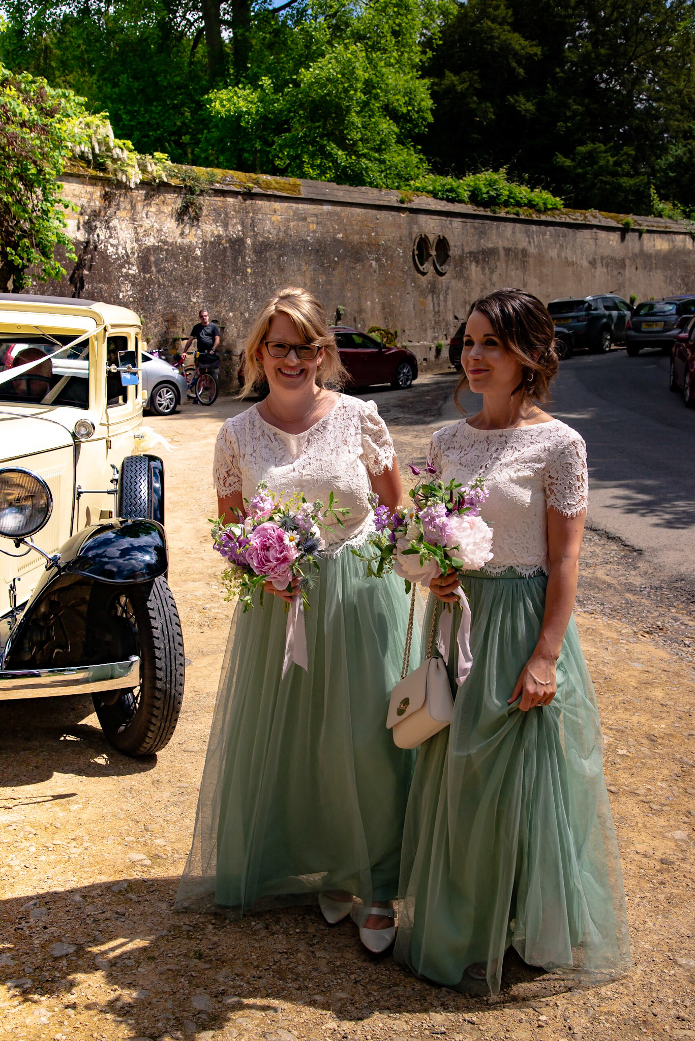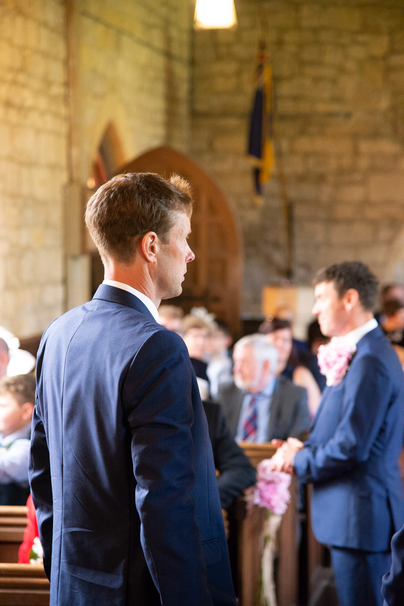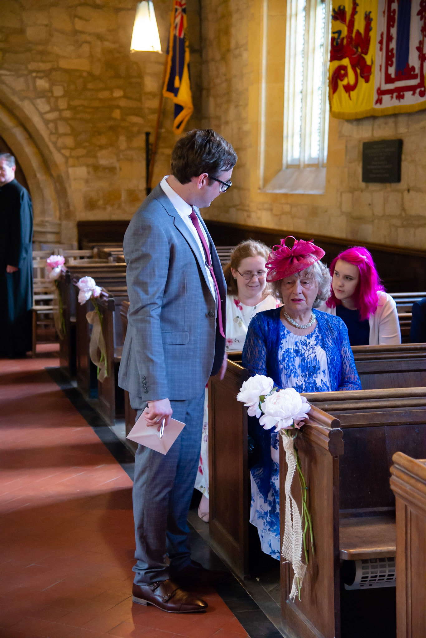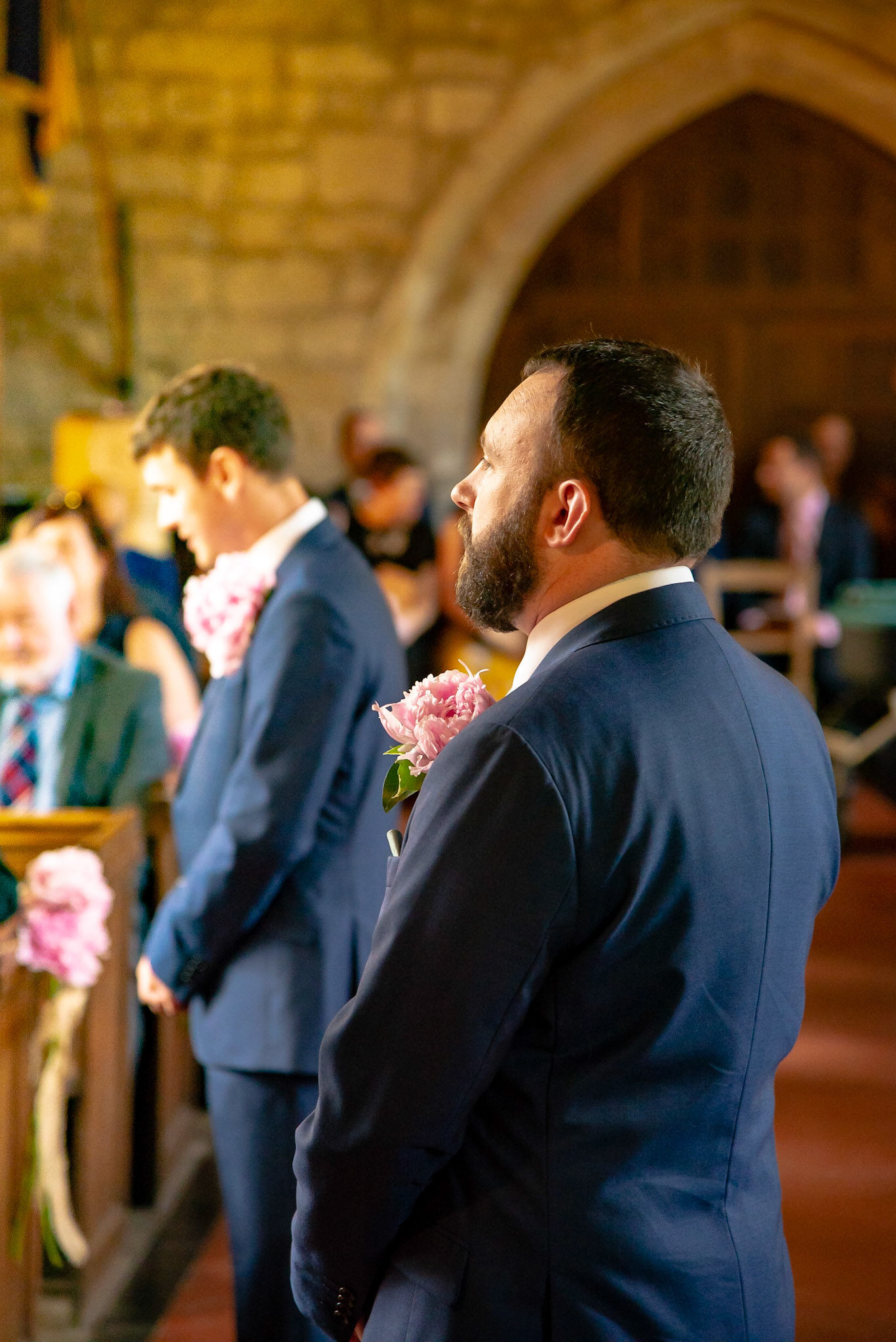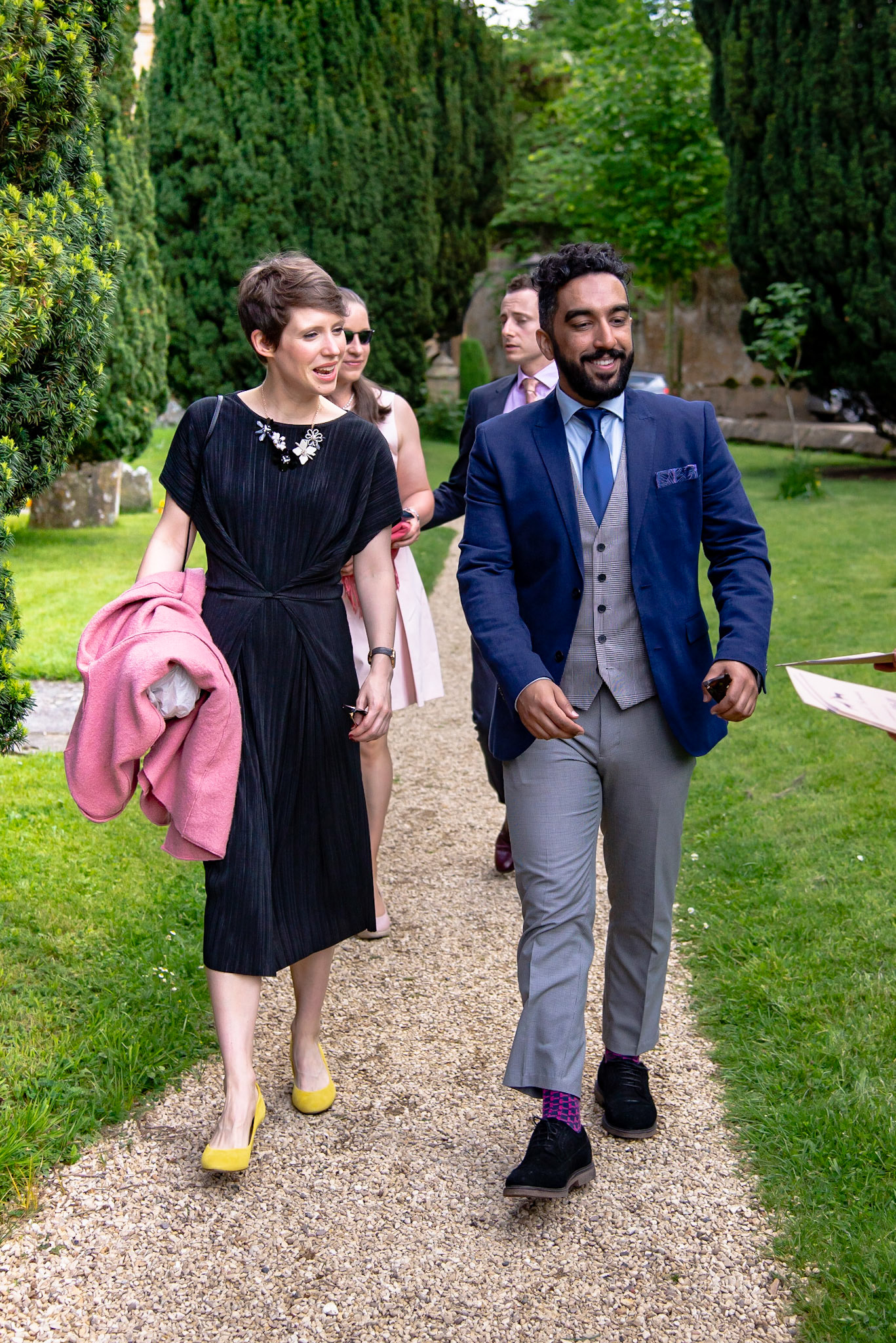 Photos of the guests arriving at the church, Matt in the church and Naomi arriving in the car.