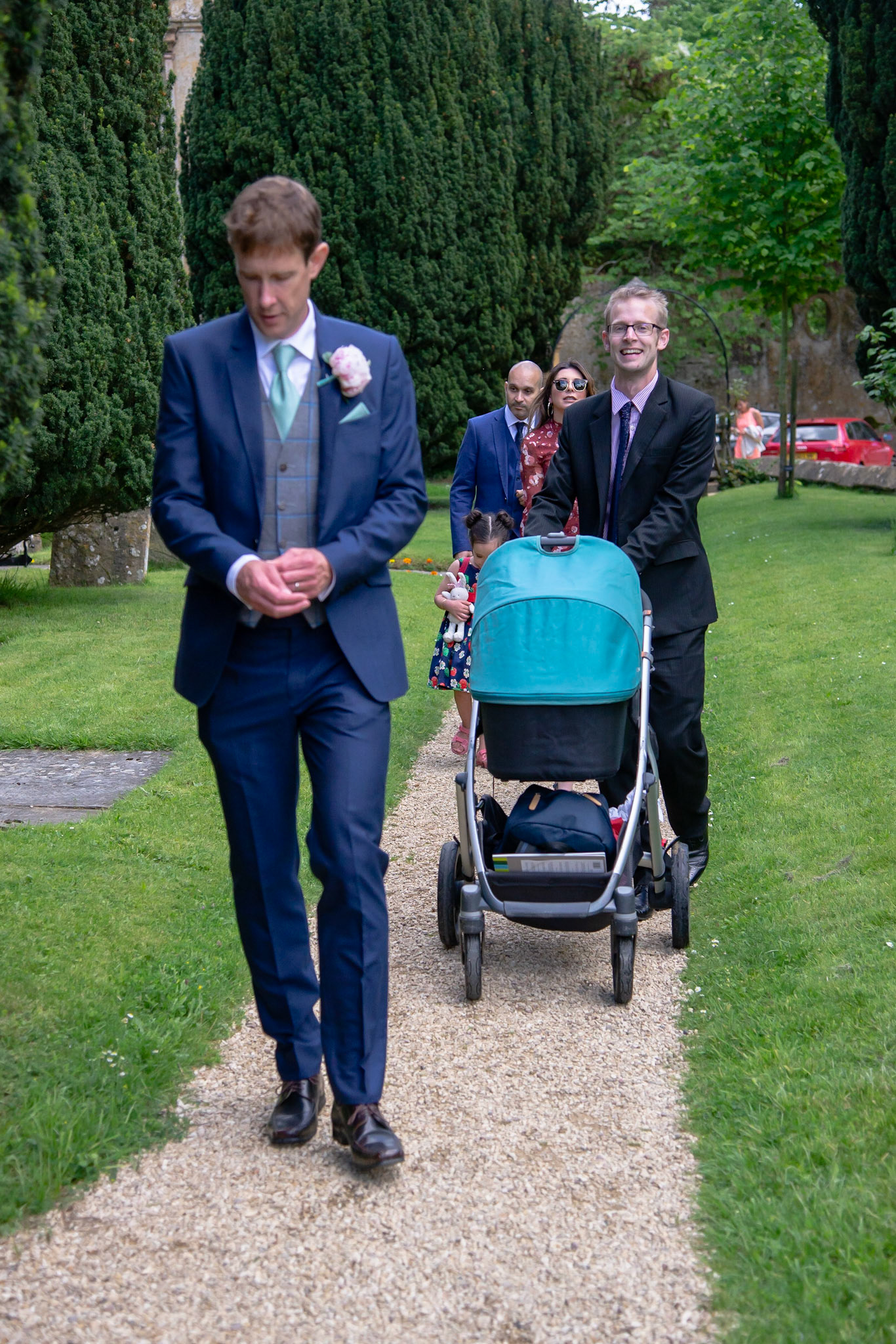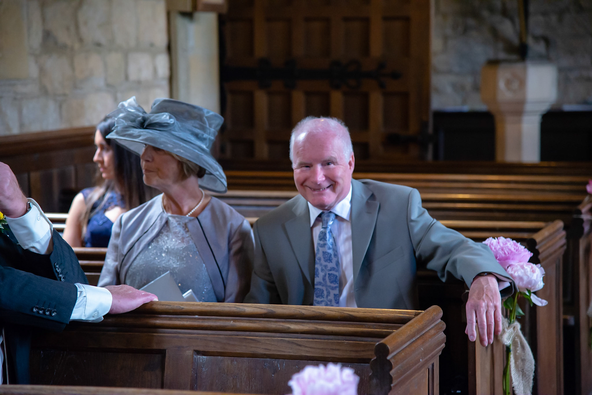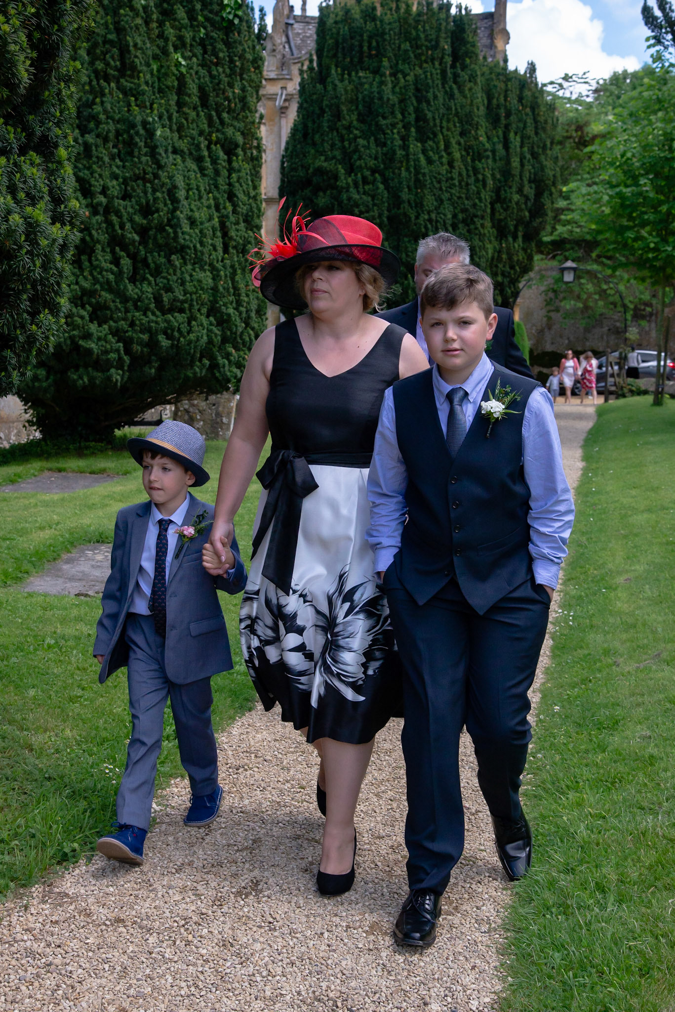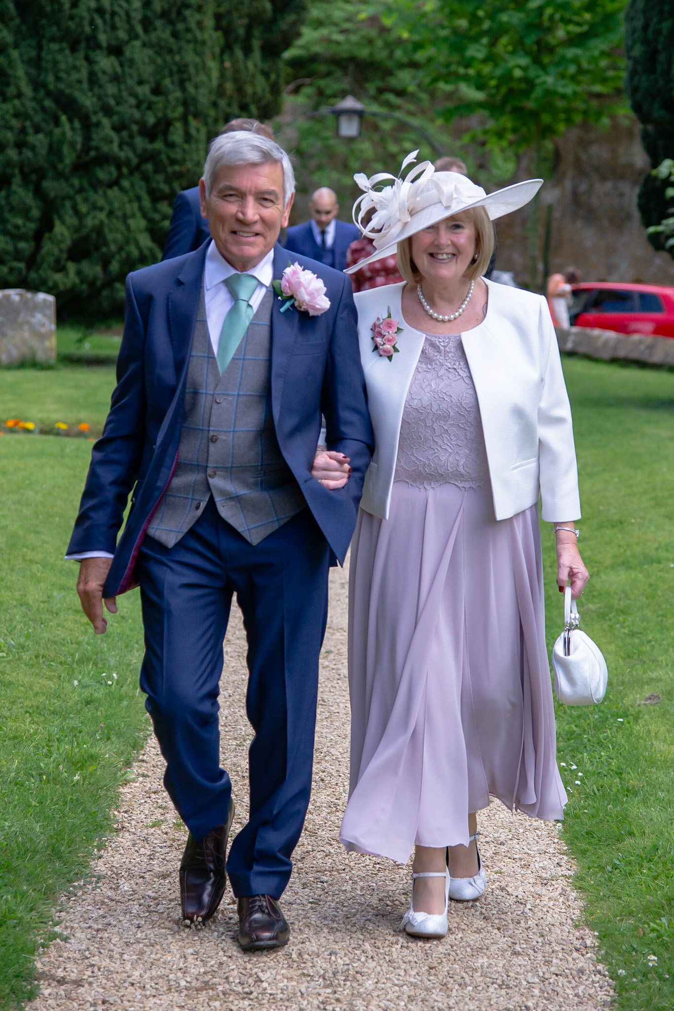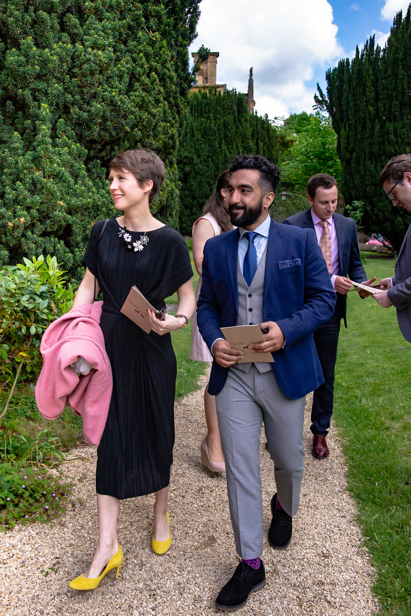 Photos of the guests arriving at the church, Matt in the church and Naomi arriving in the car.