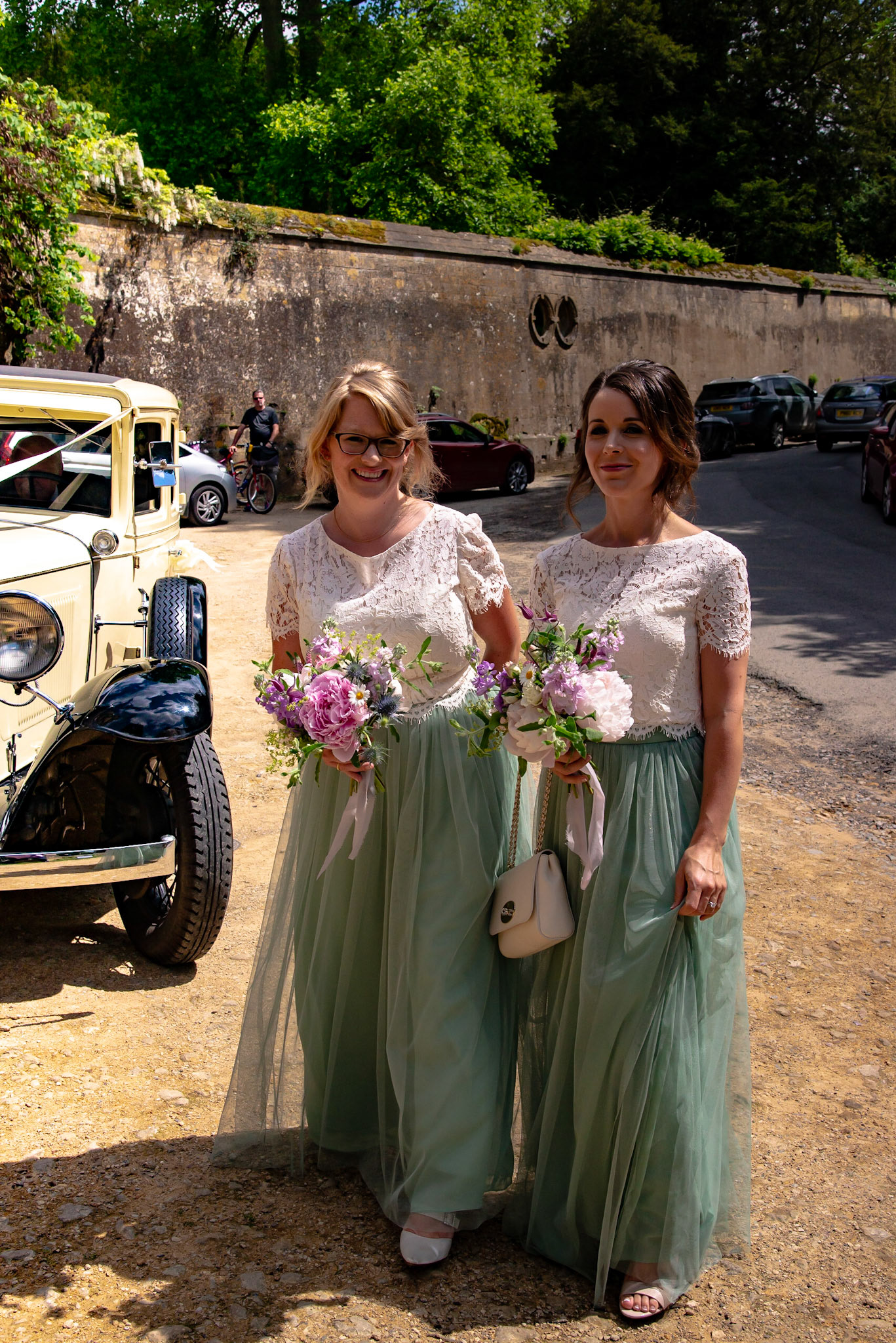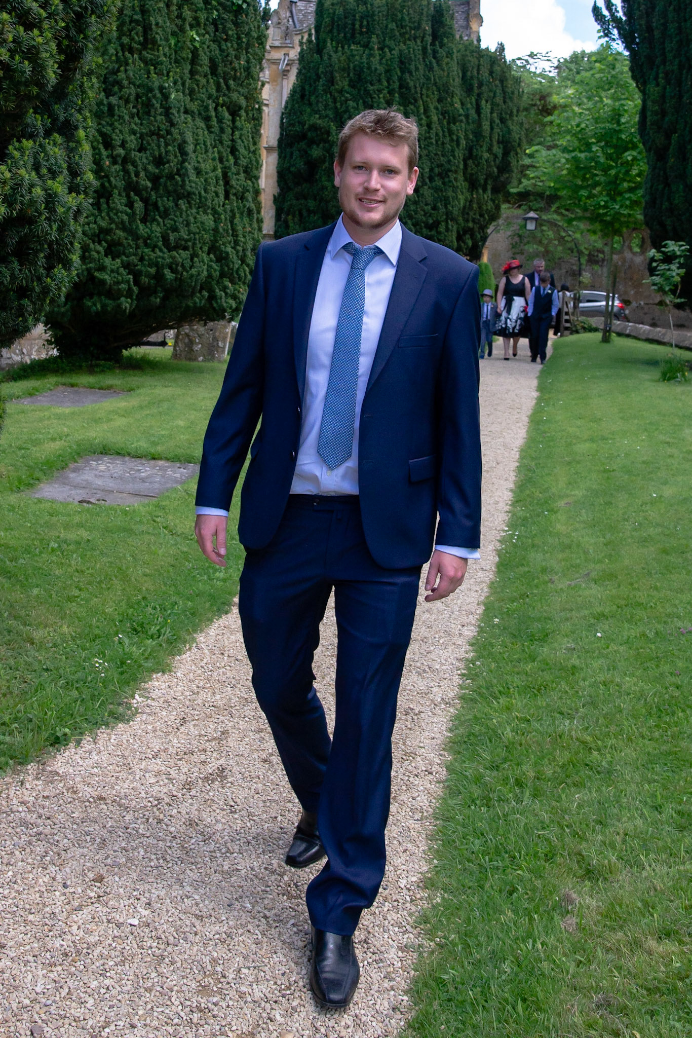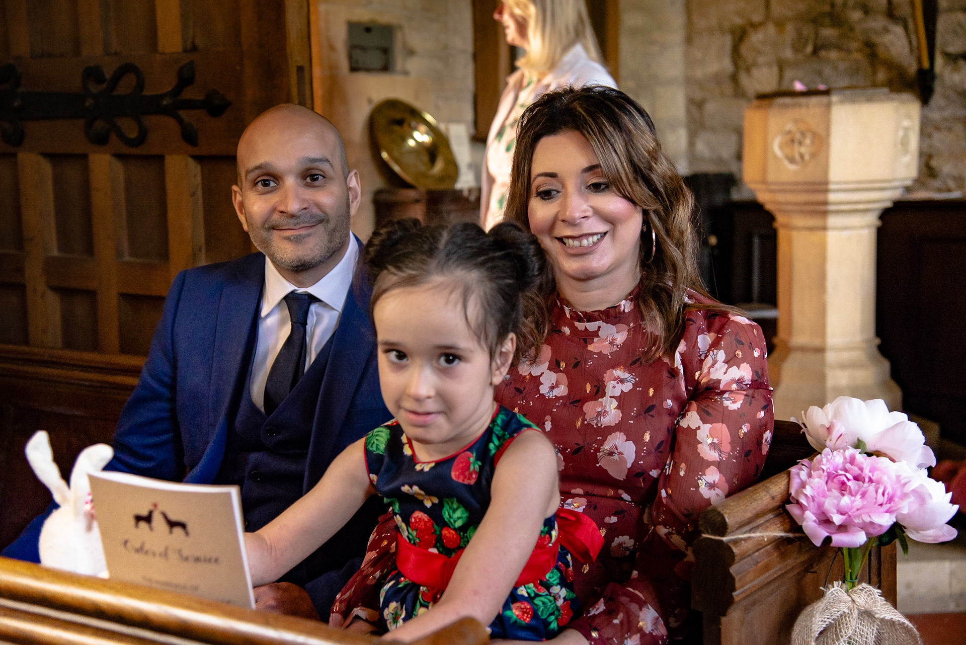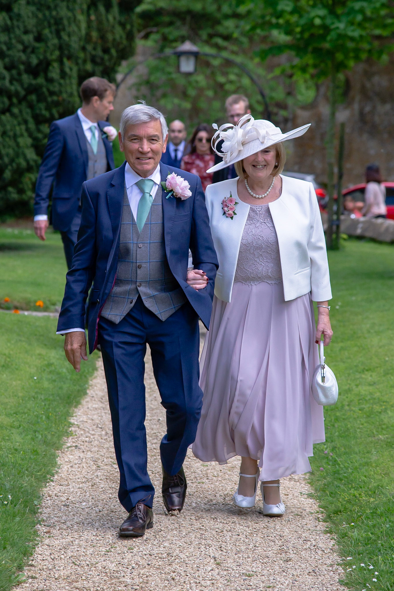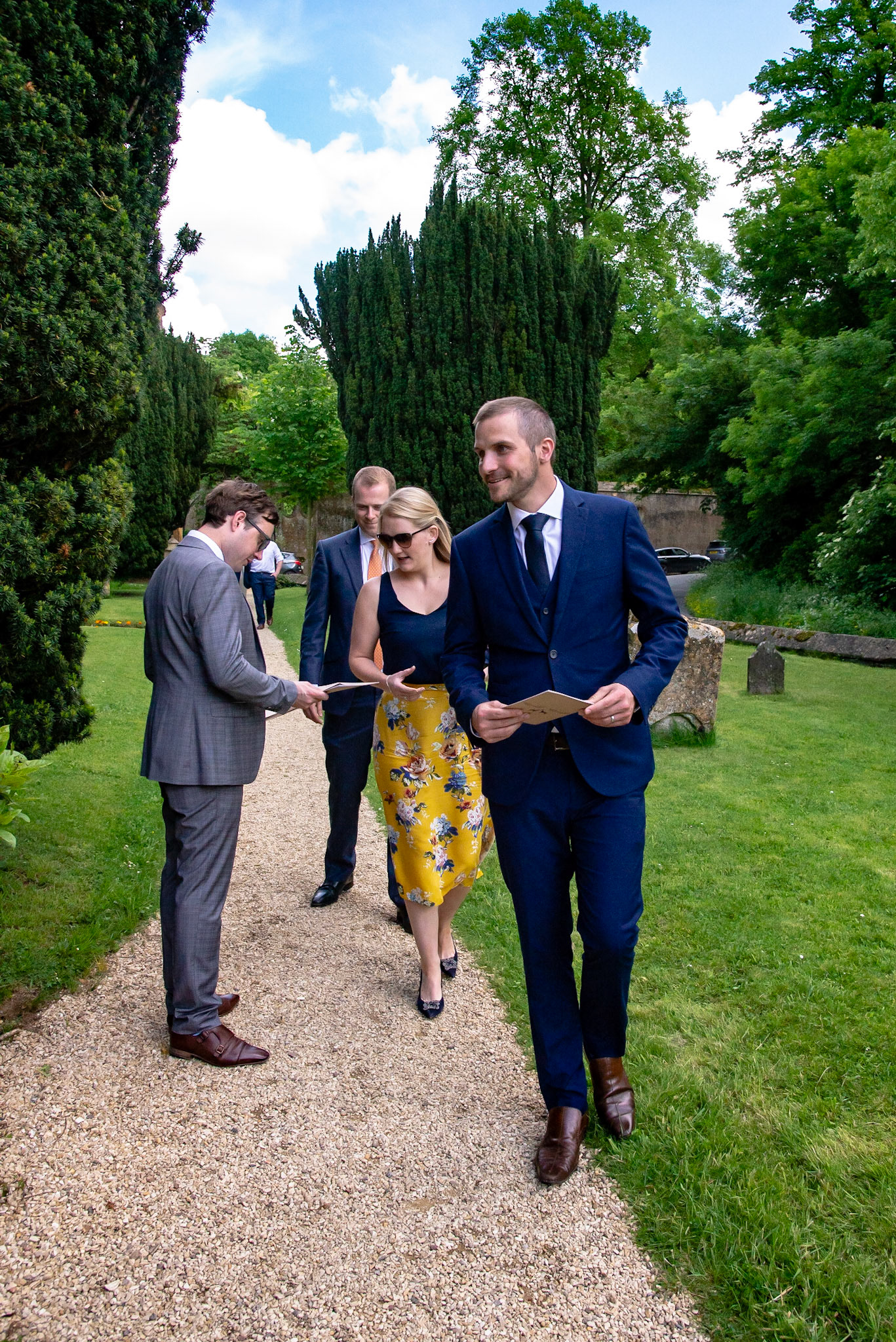 Photos of the guests arriving at the church, Matt in the church and Naomi arriving in the car.