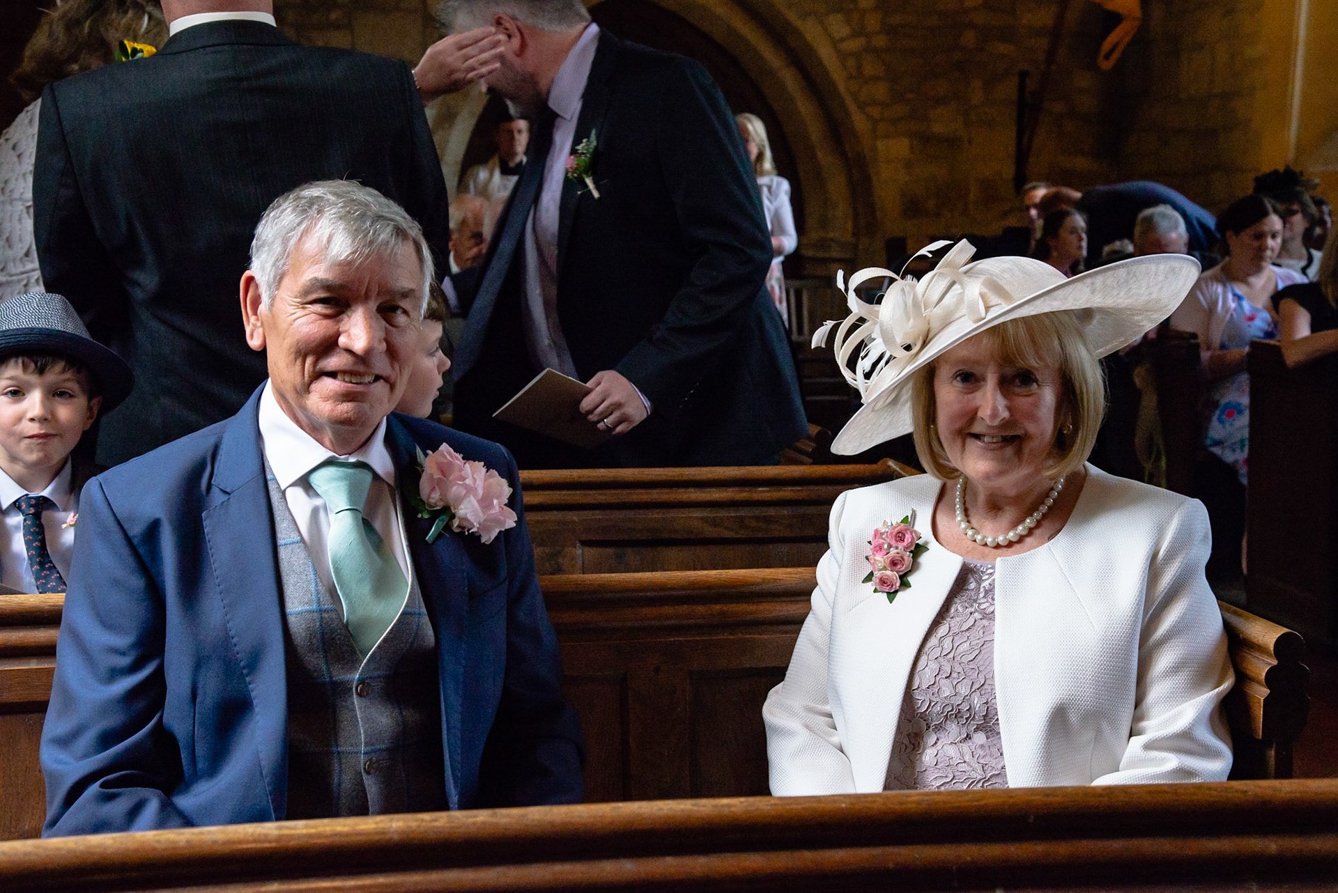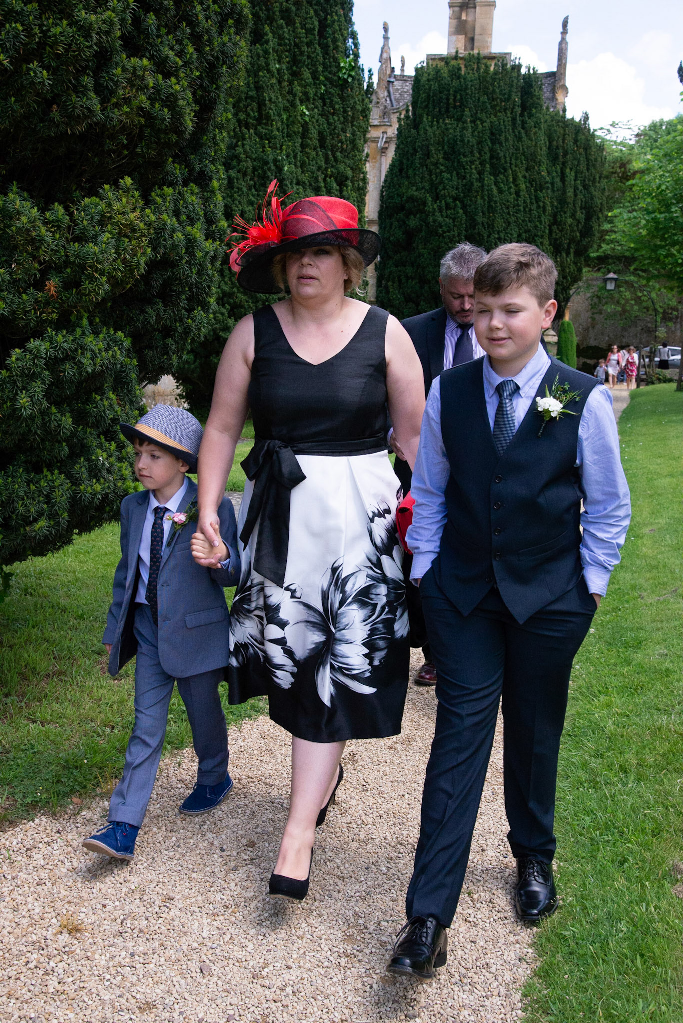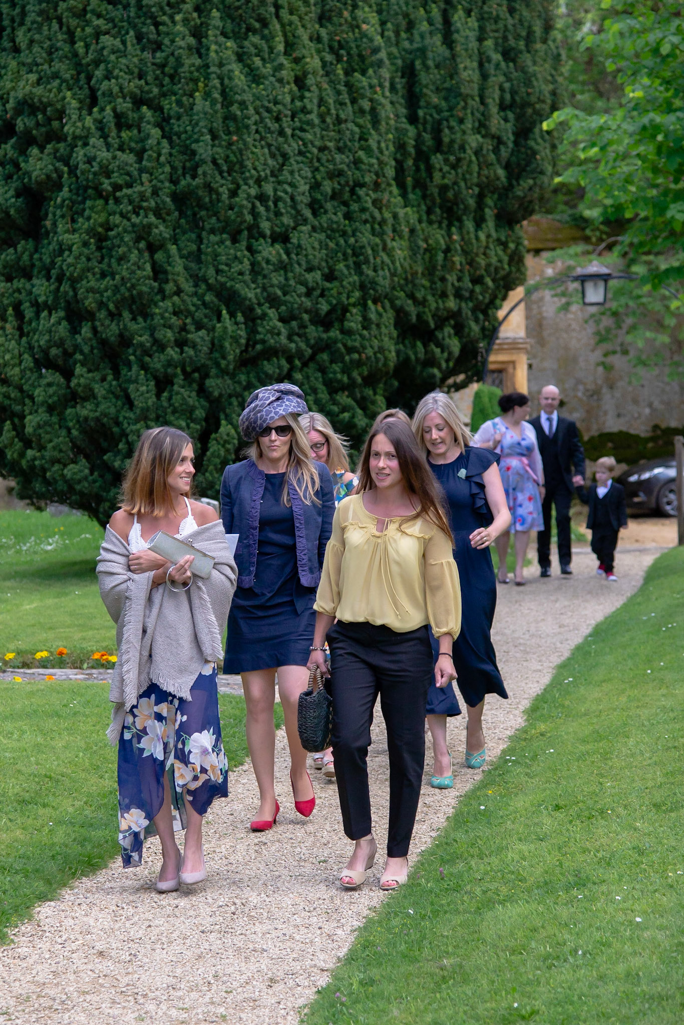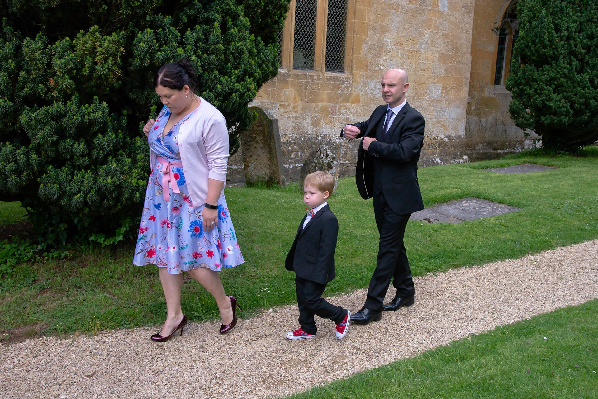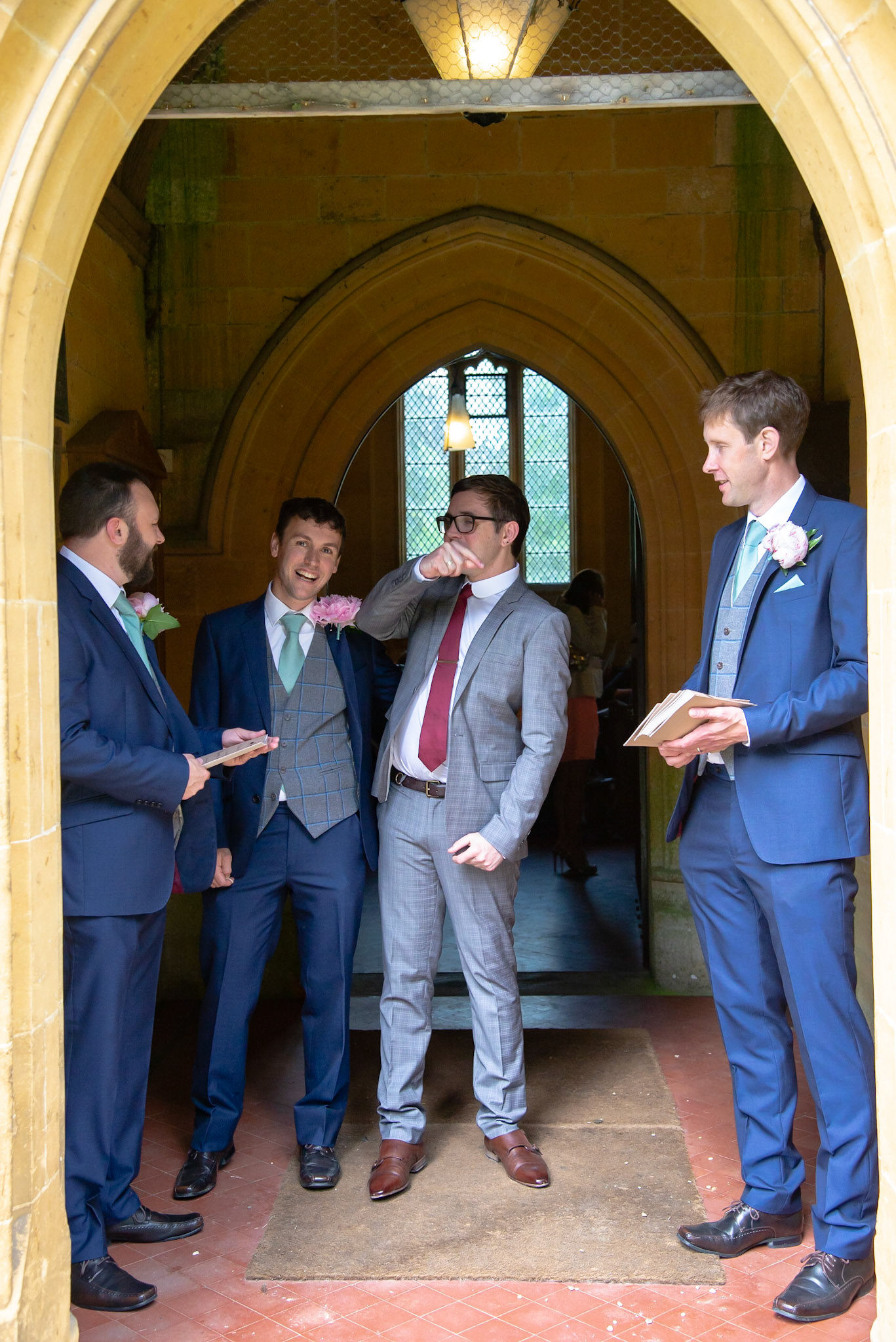 Photos of the guests arriving at the church, Matt in the church and Naomi arriving in the car.