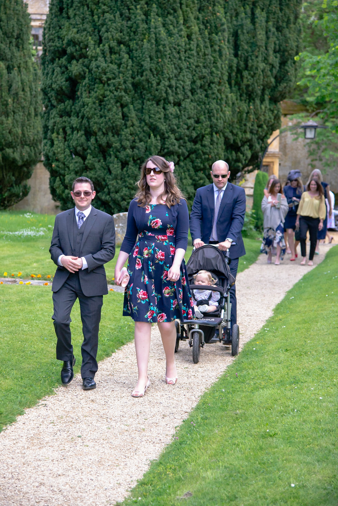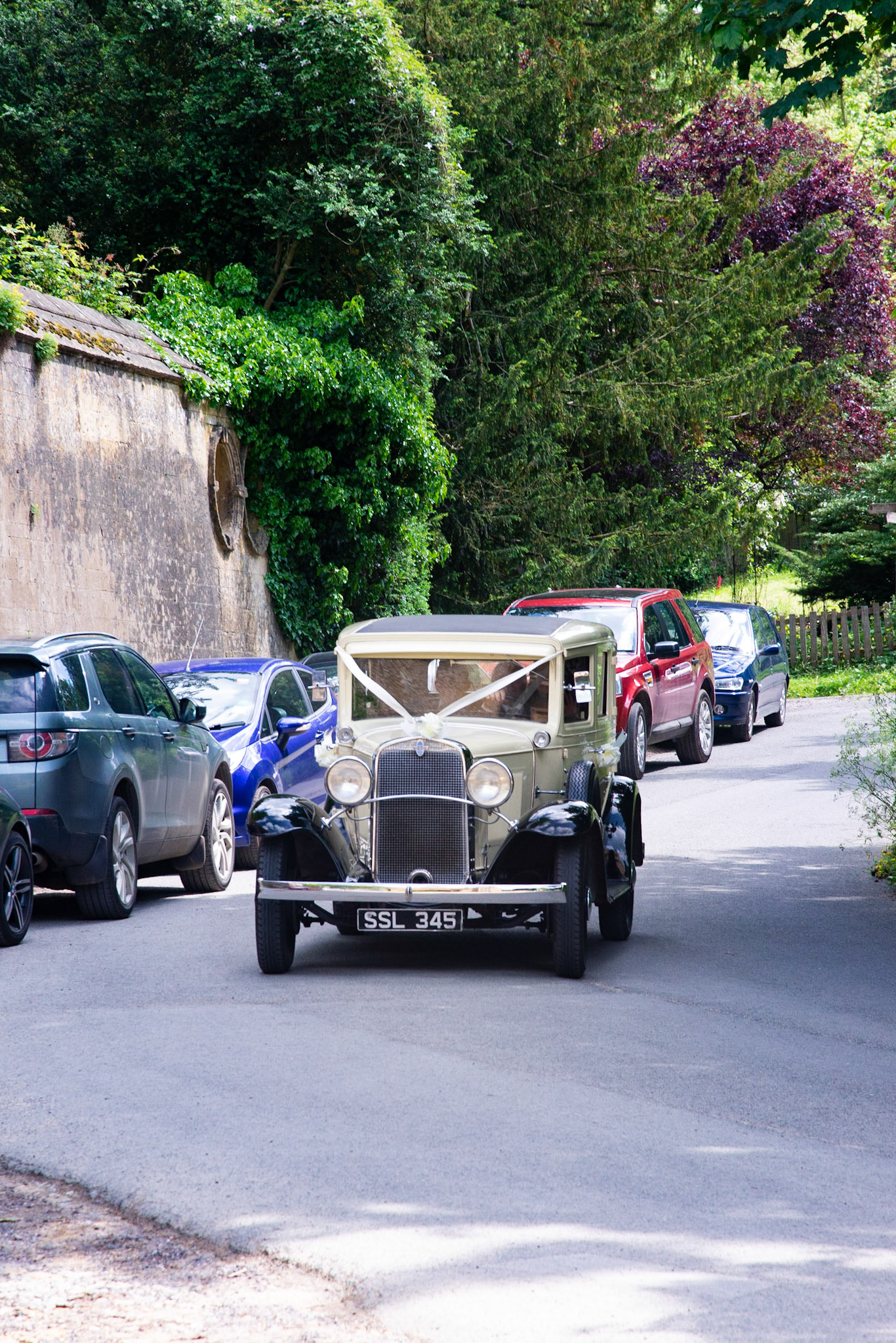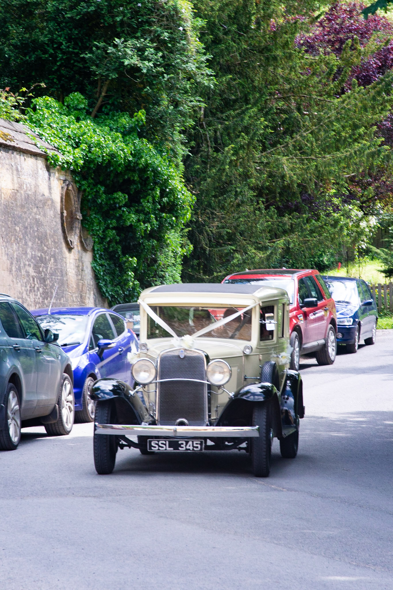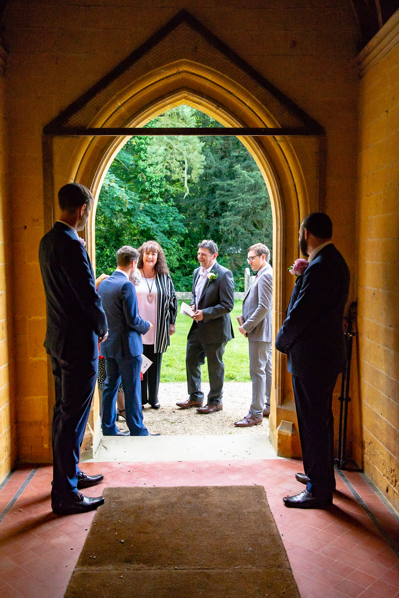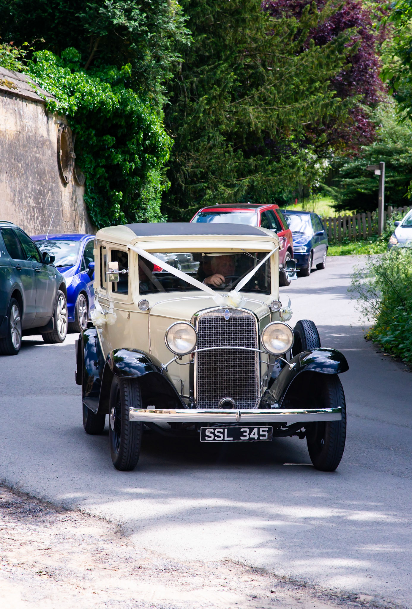 Photos of the guests arriving at the church, Matt in the church and Naomi arriving in the car.
