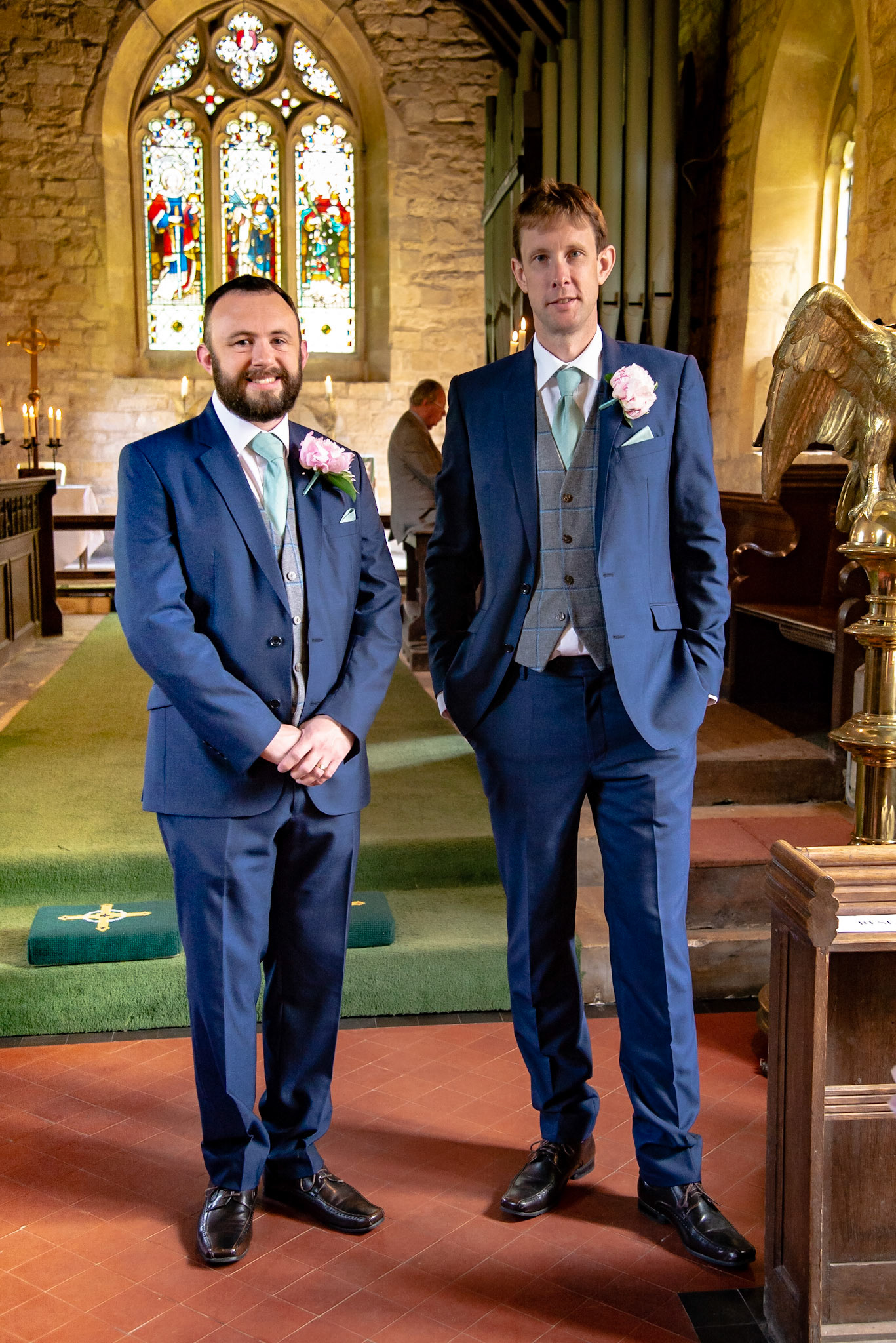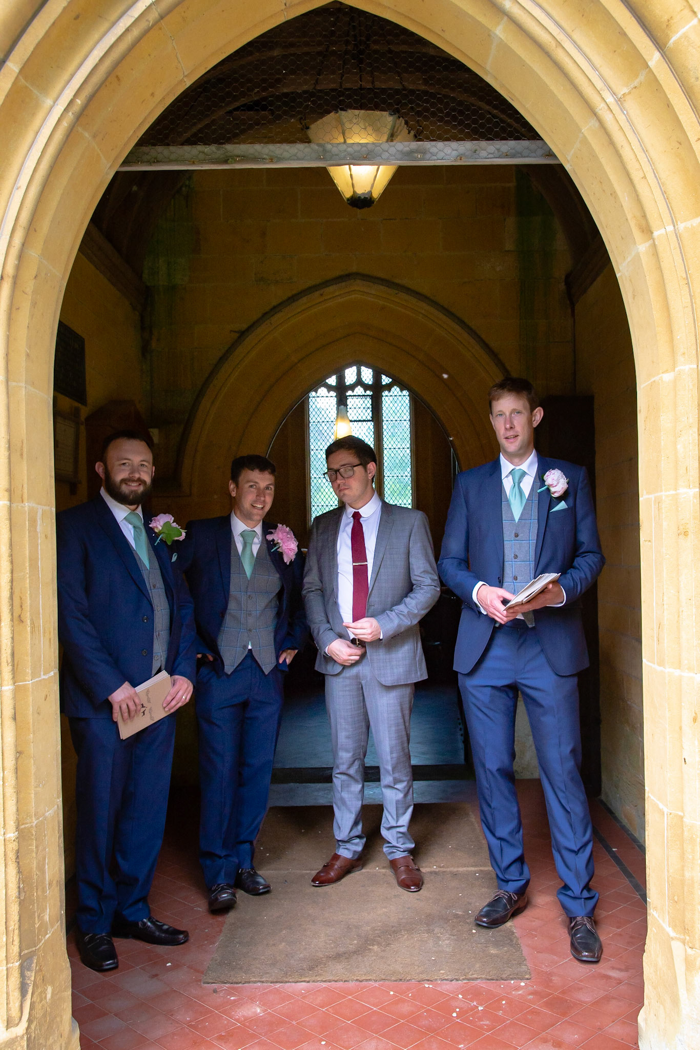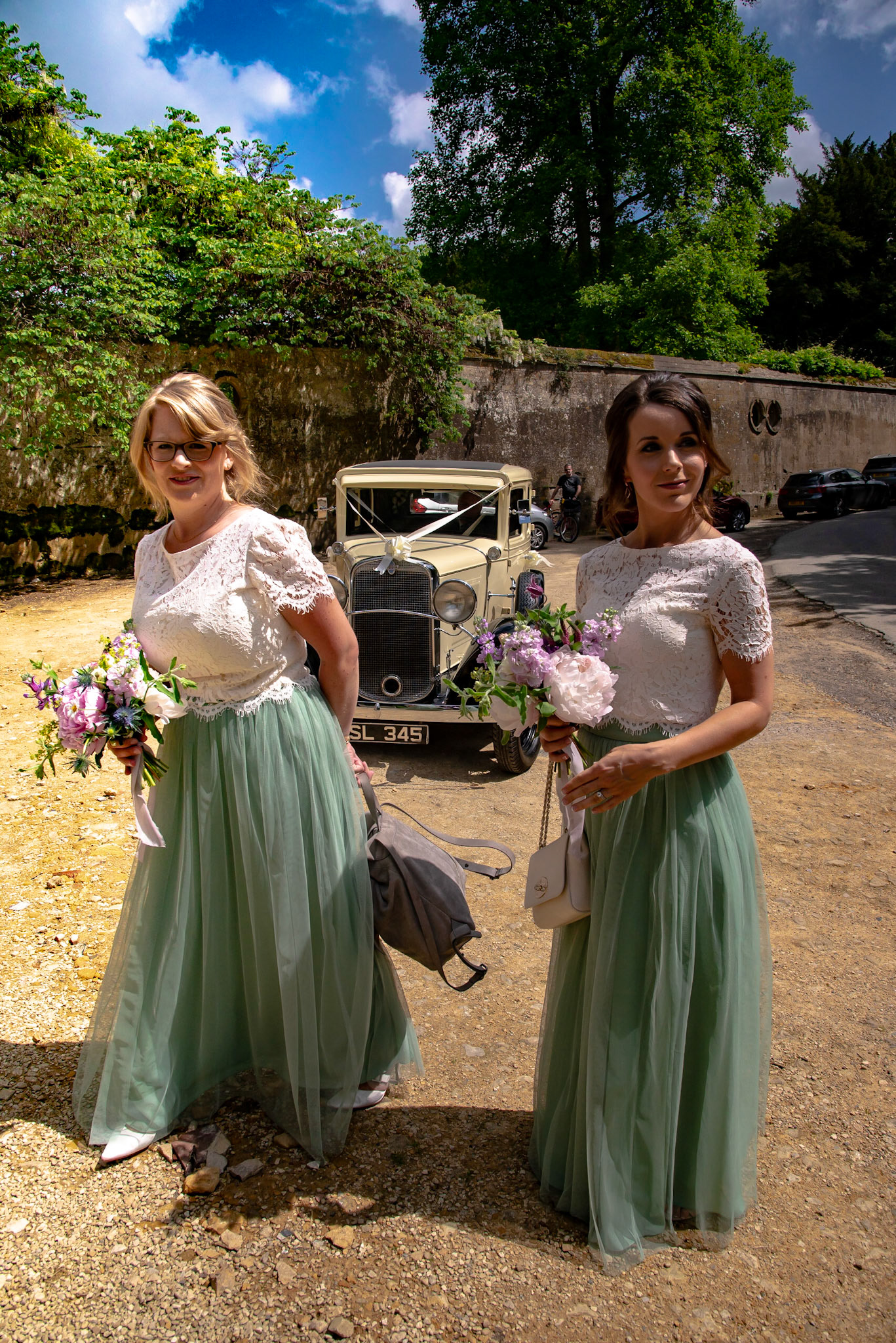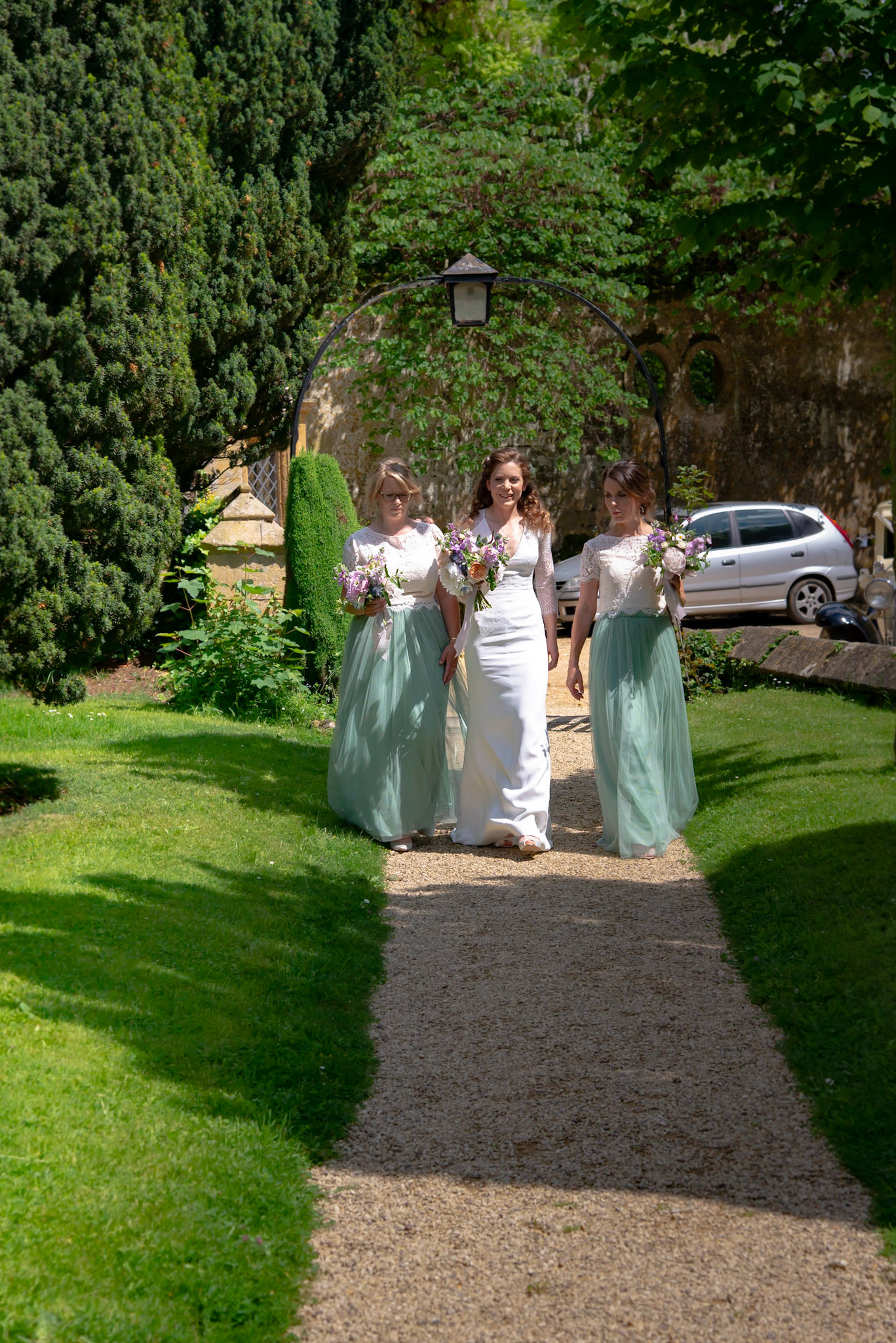 Photos of the guests arriving at the church, Matt in the church and Naomi arriving in the car.