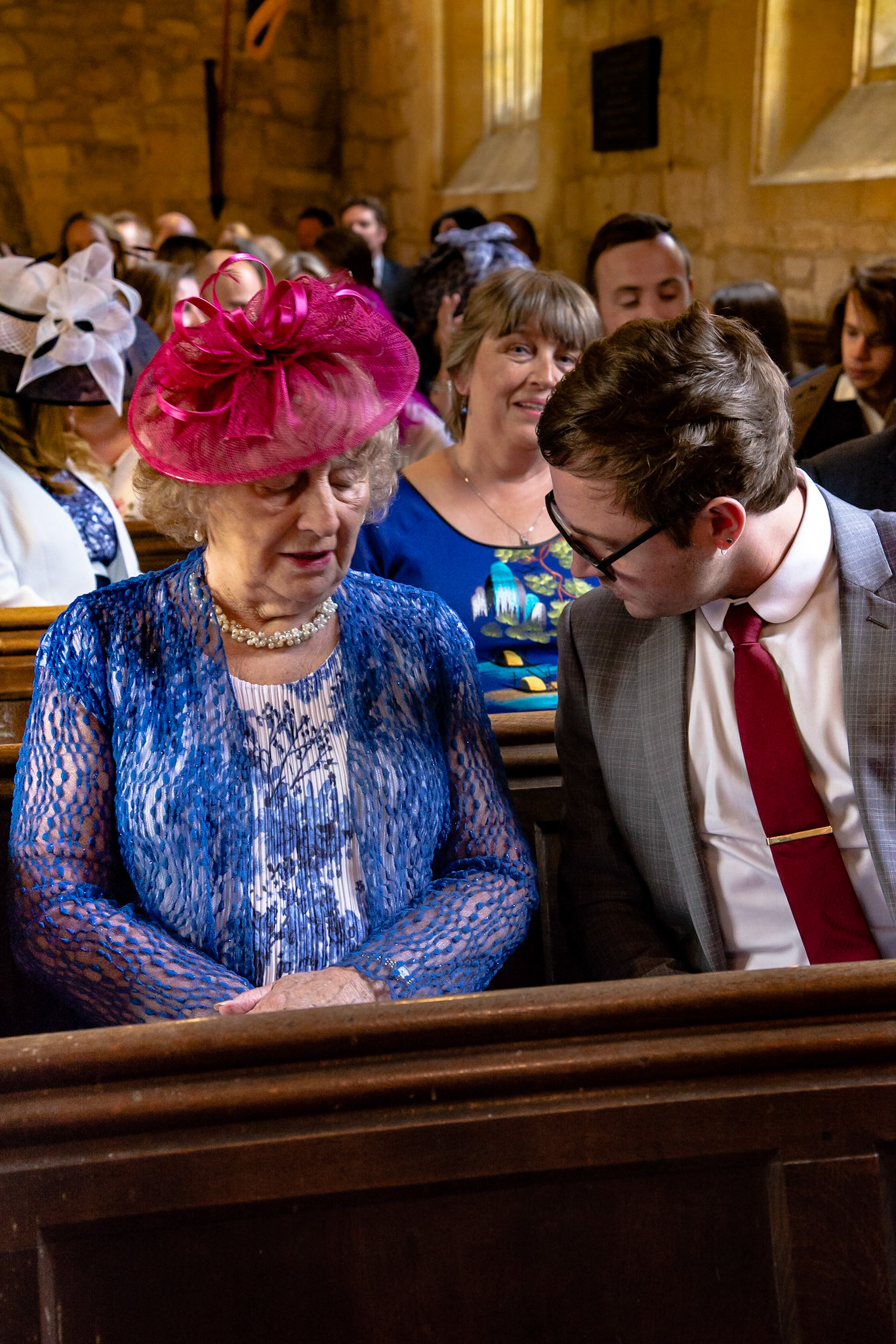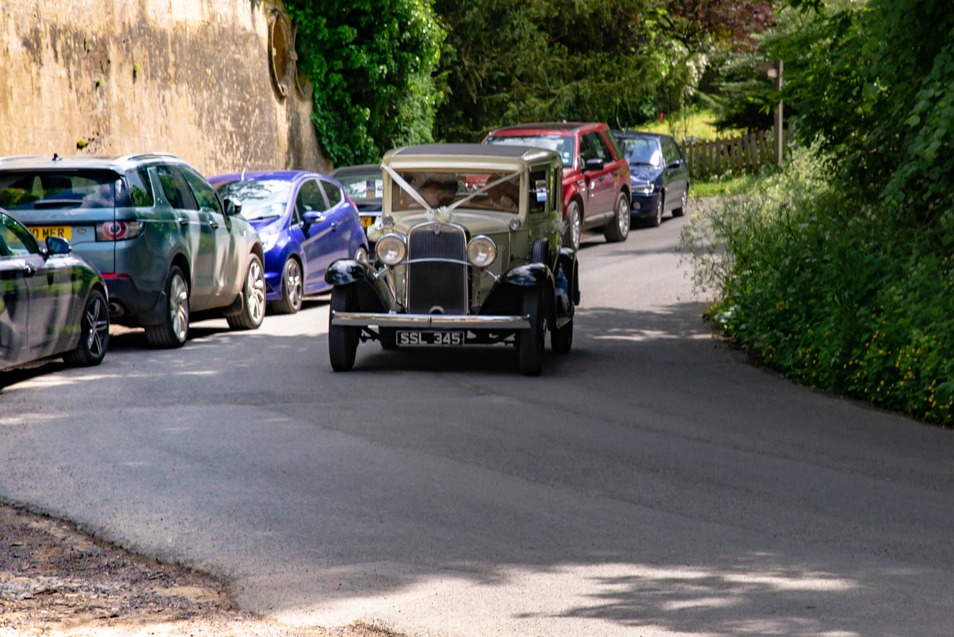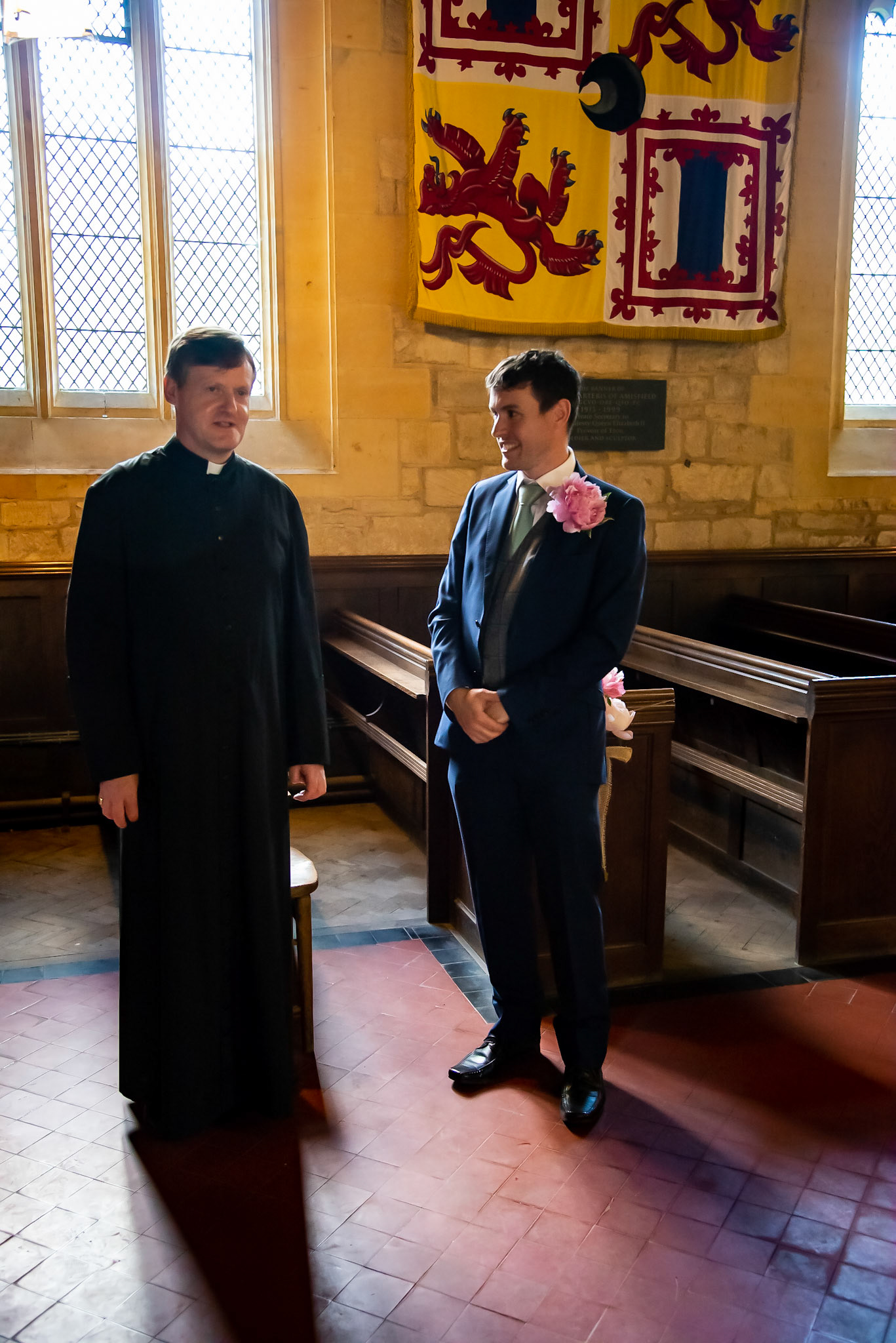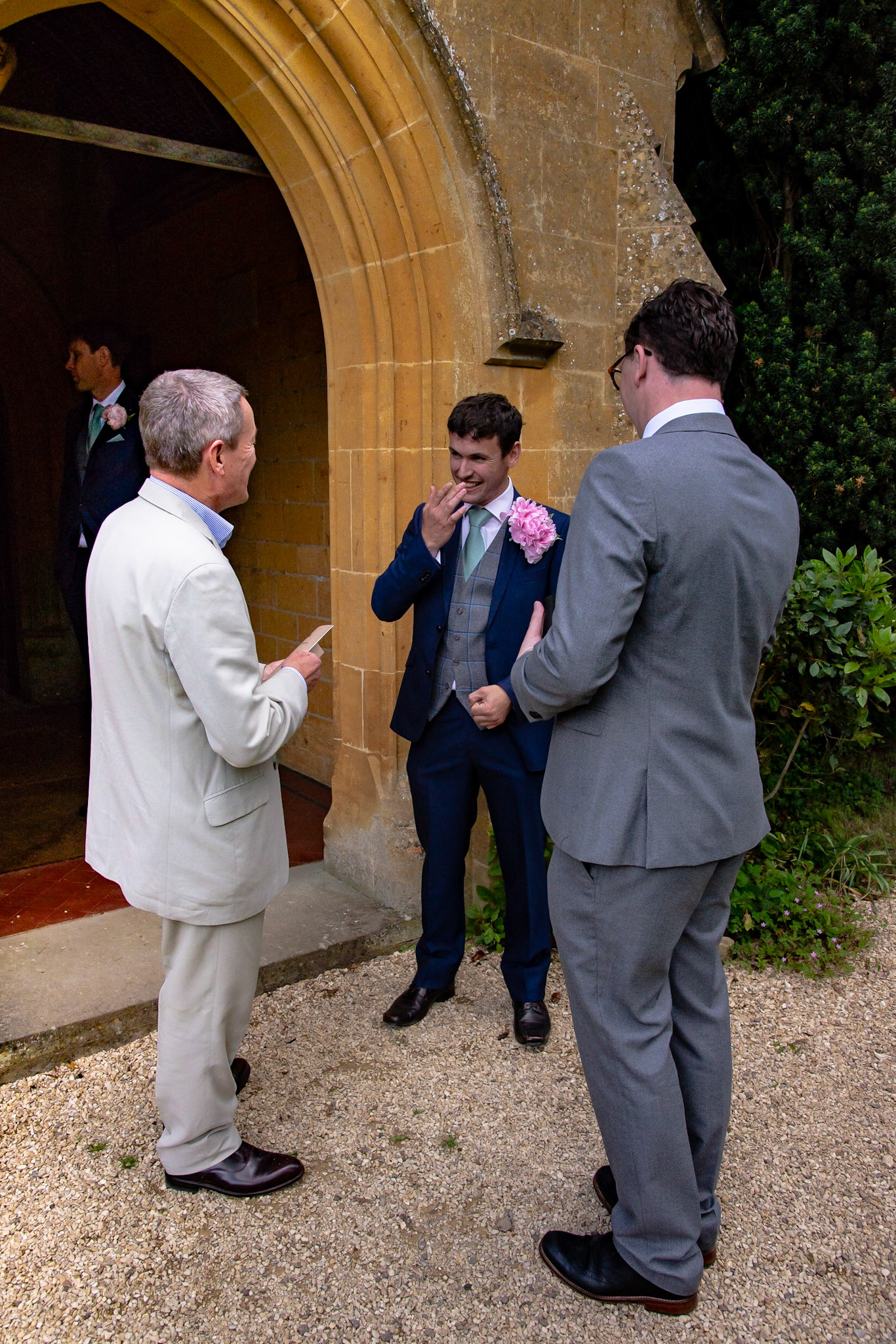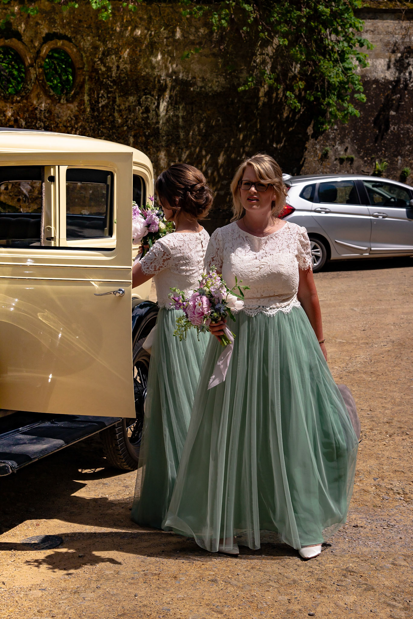 Photos of the guests arriving at the church, Matt in the church and Naomi arriving in the car.