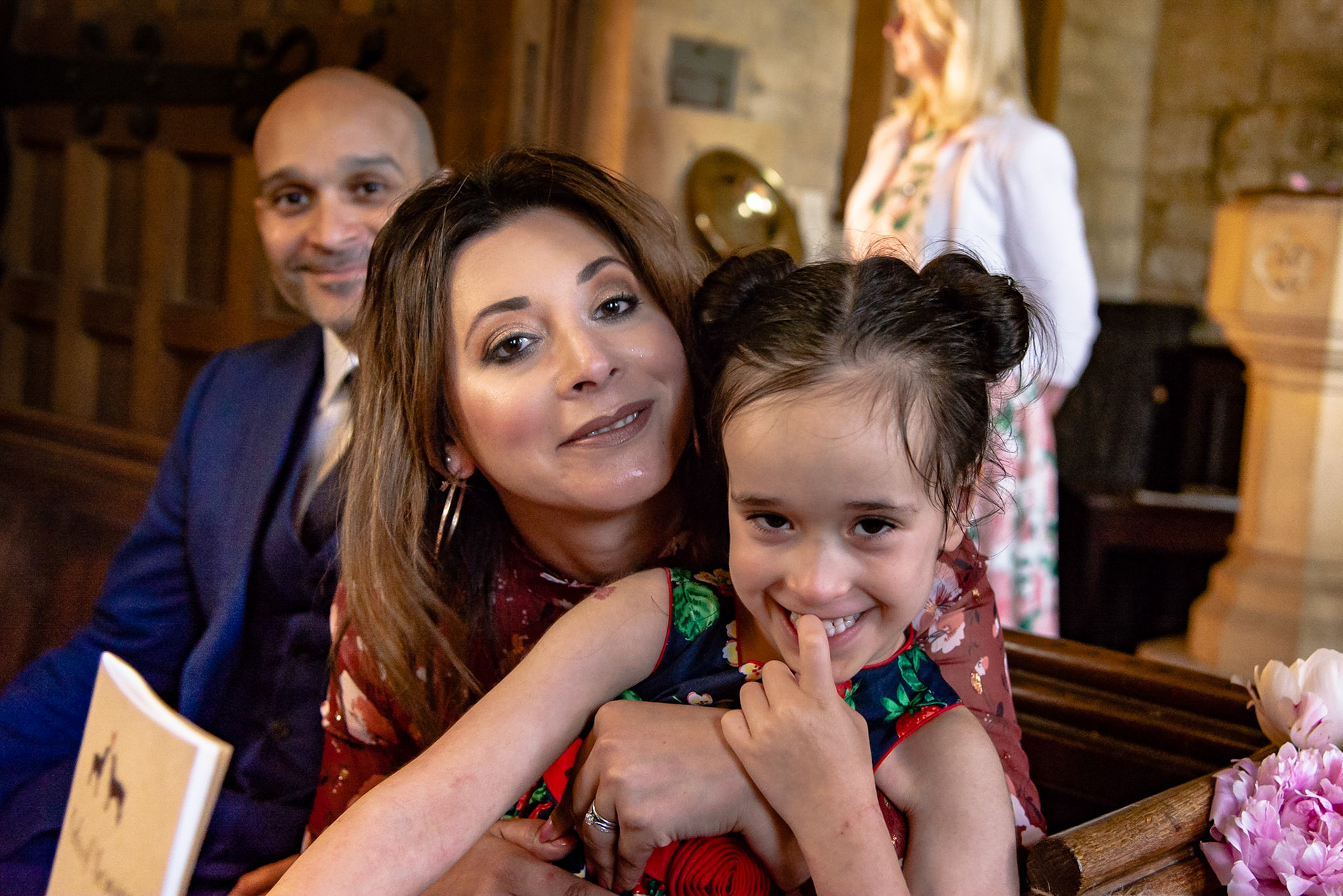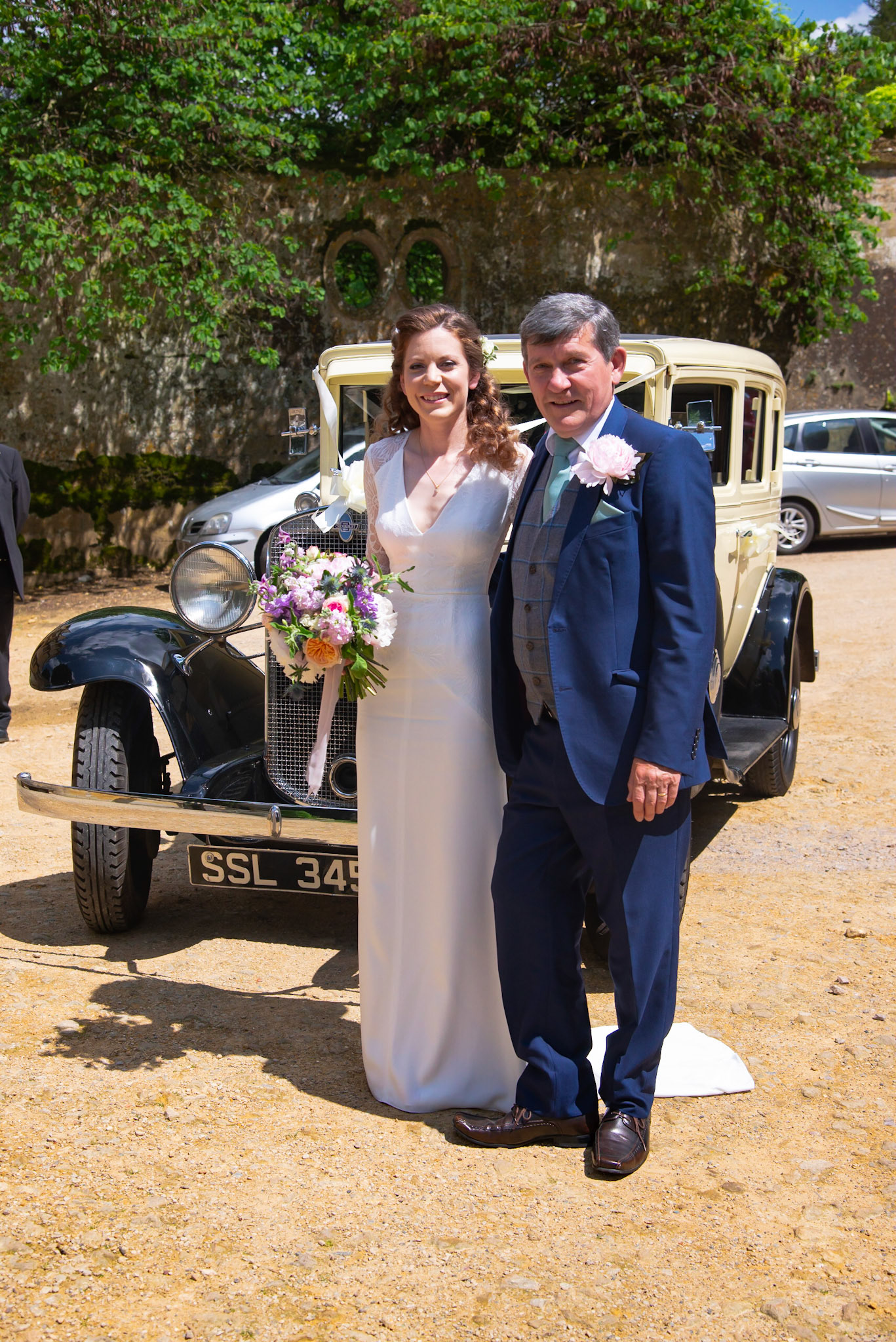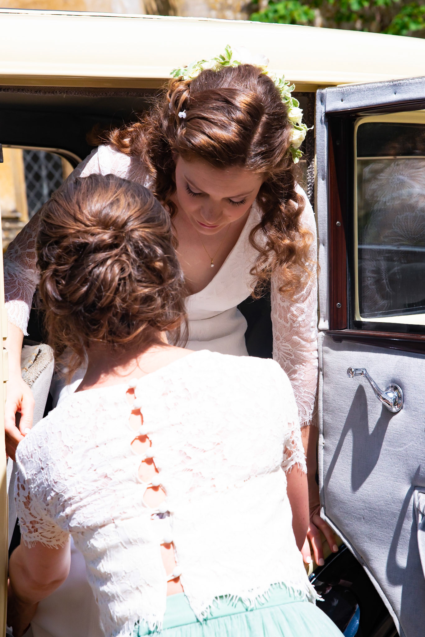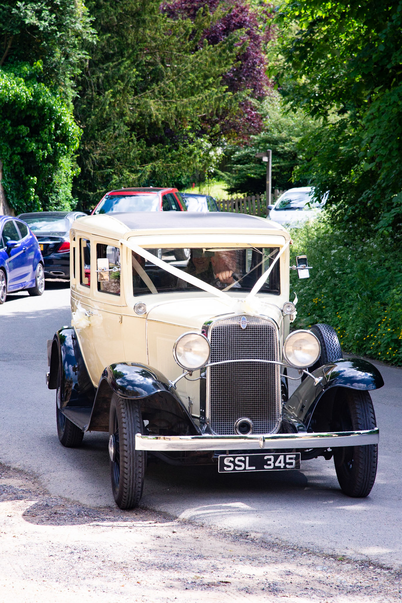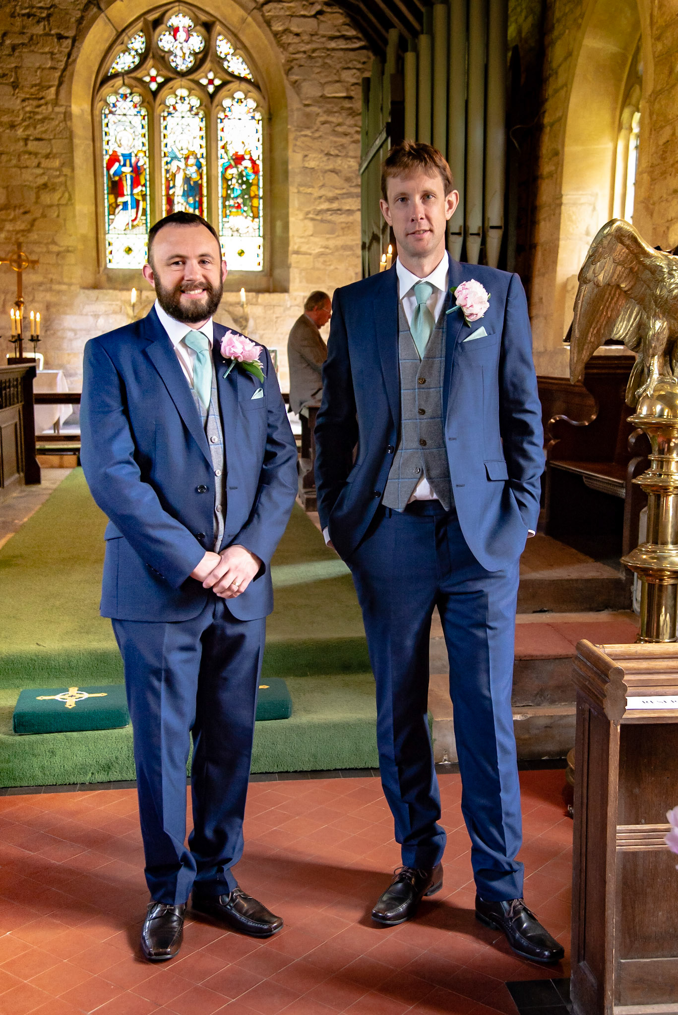 Photos of the guests arriving at the church, Matt in the church and Naomi arriving in the car.