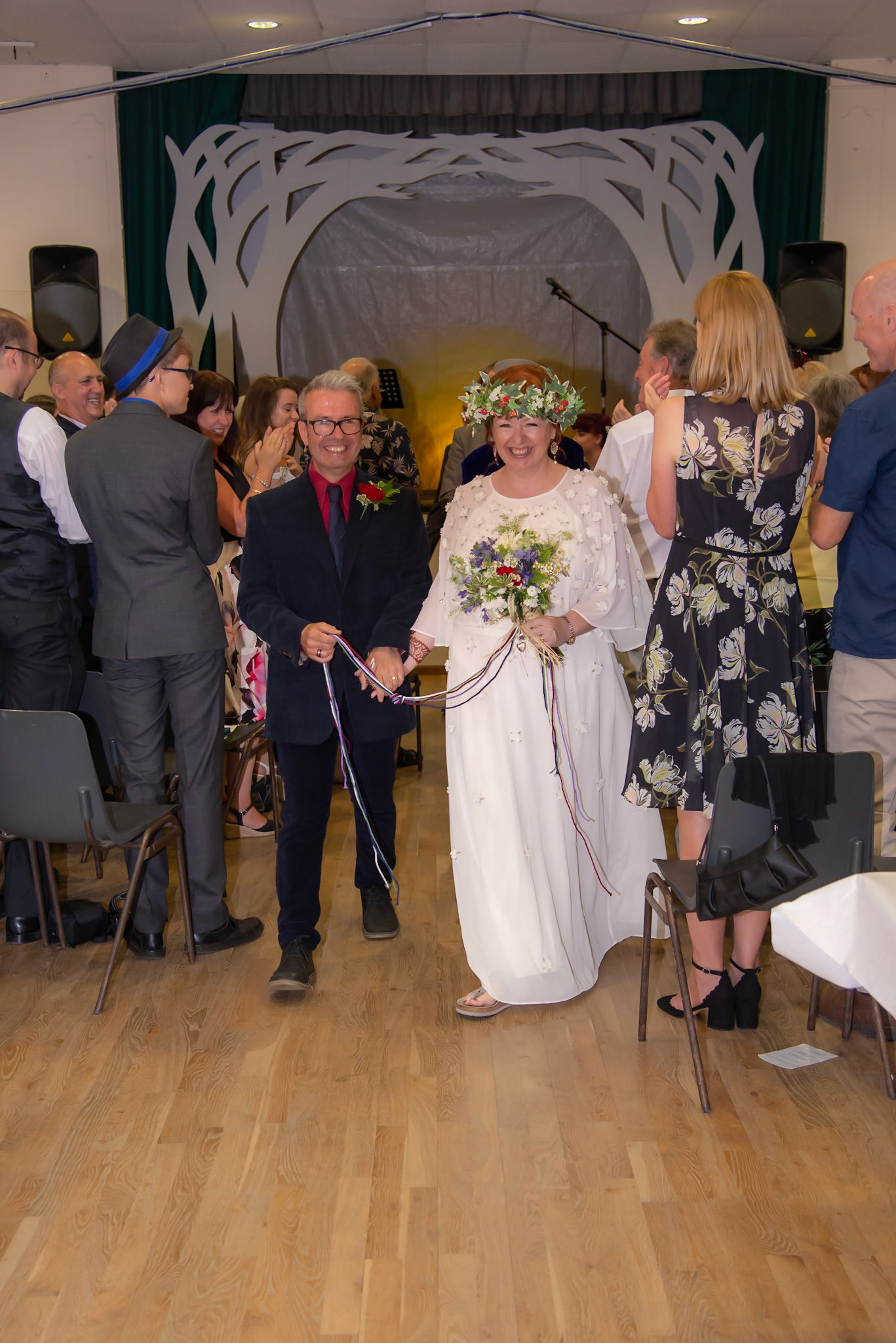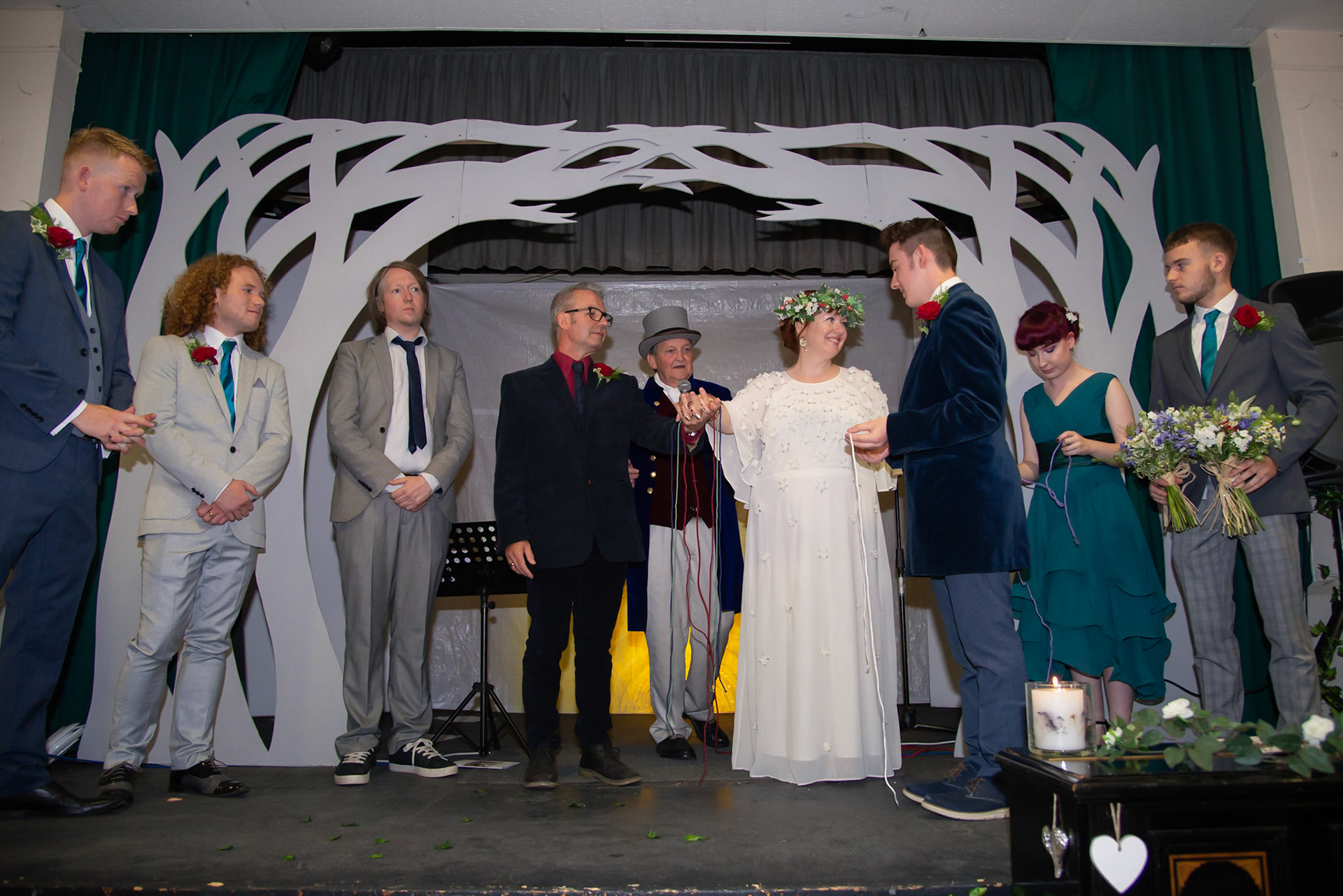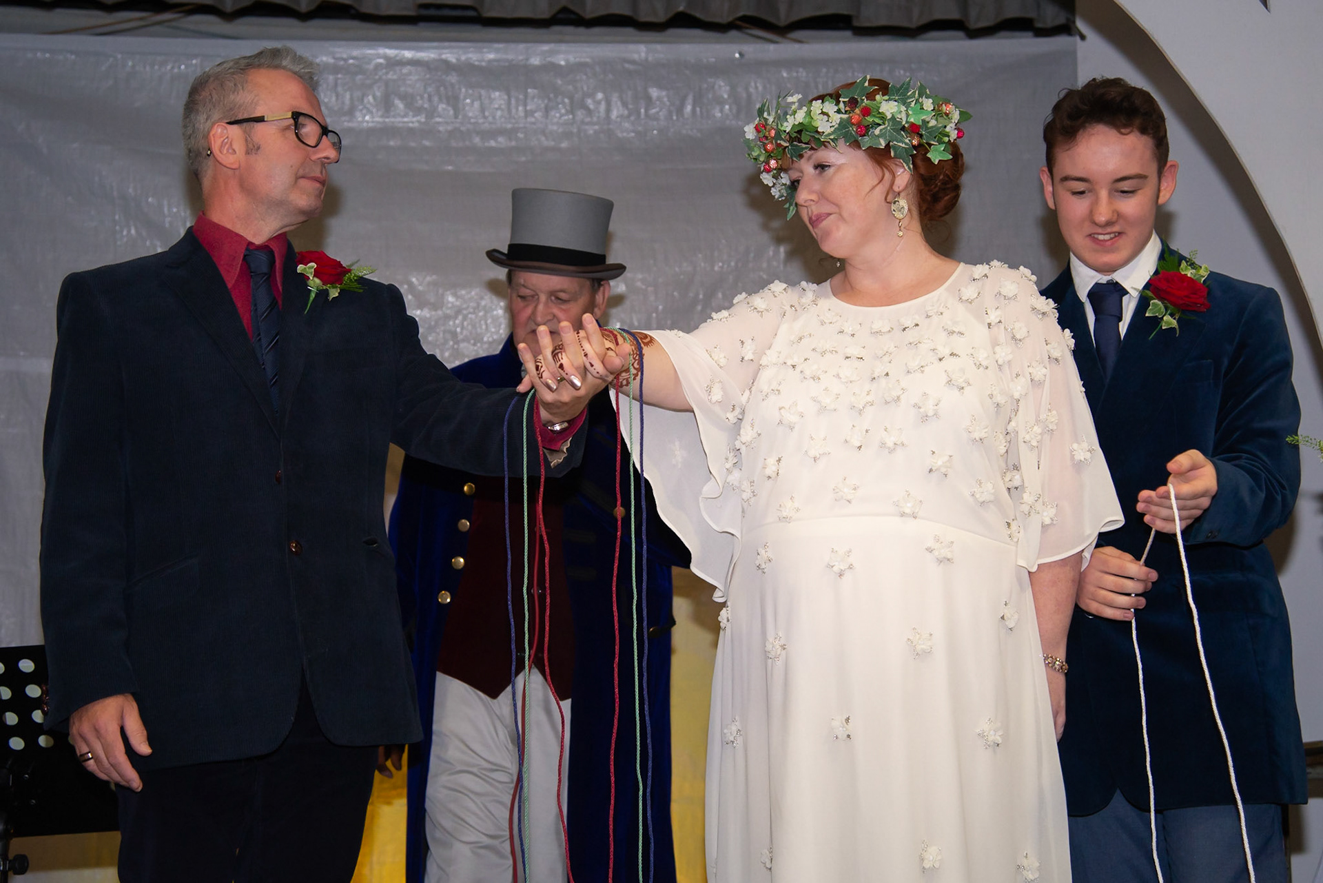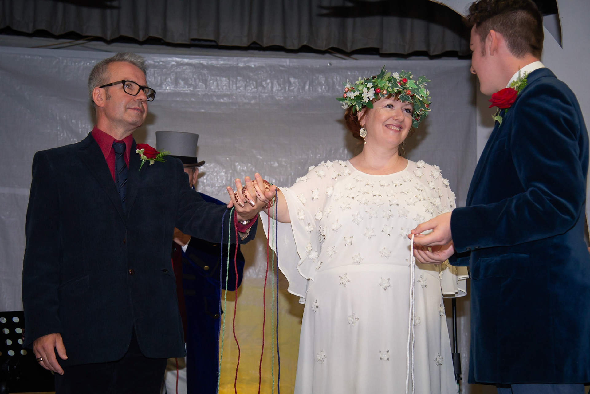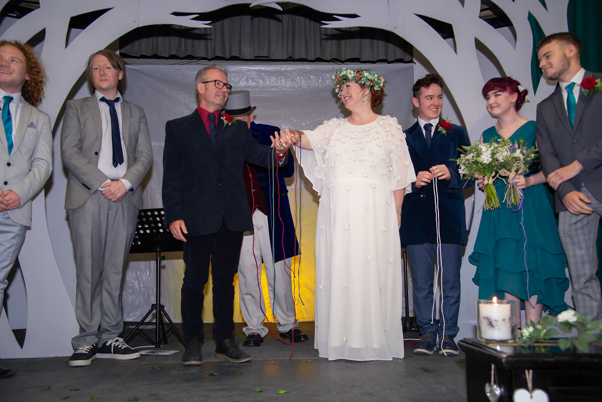 Sally-Ann arriving at the hall walking down the aisle to meet Paddy. The handfasting ceremony and Mike playing during the service.