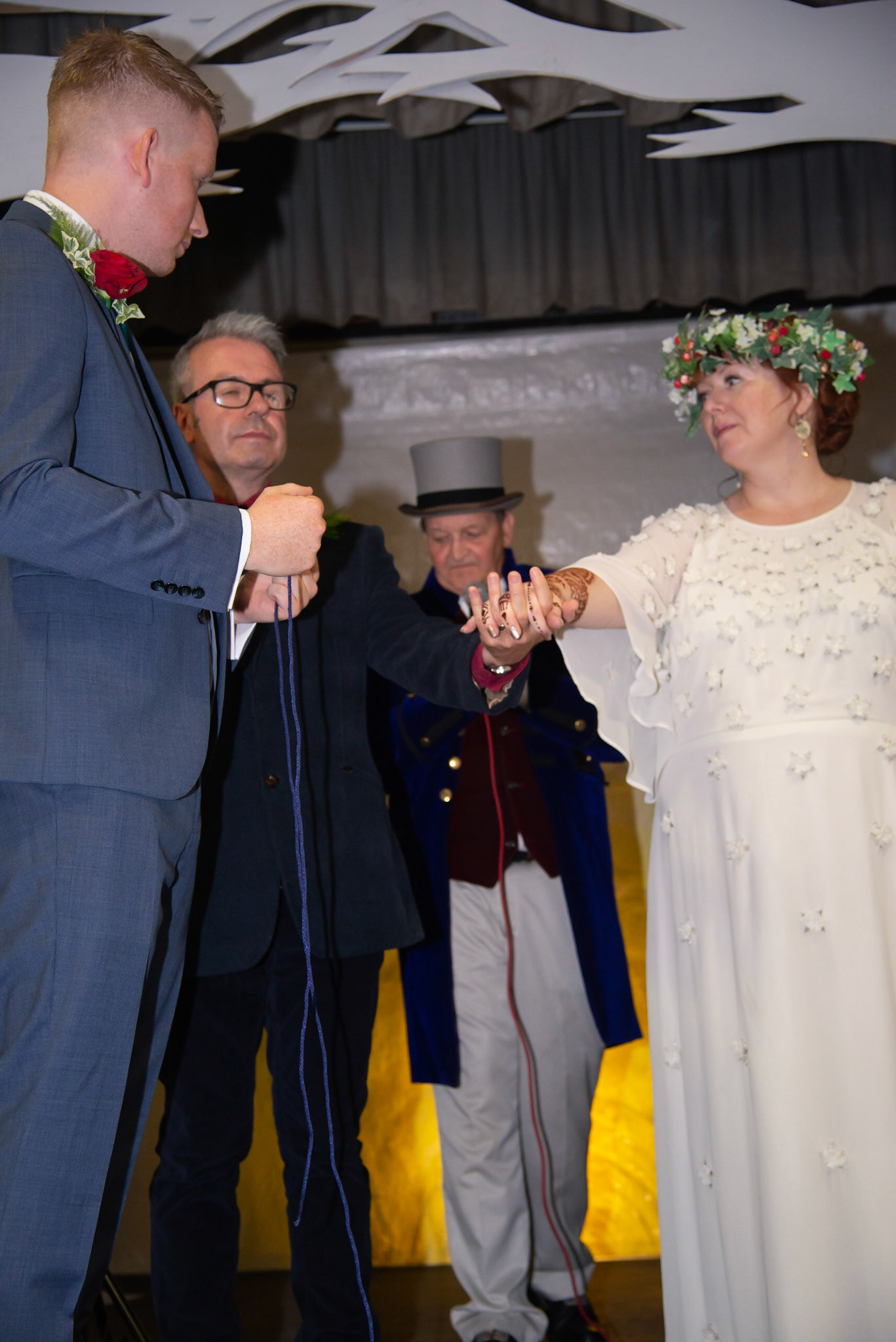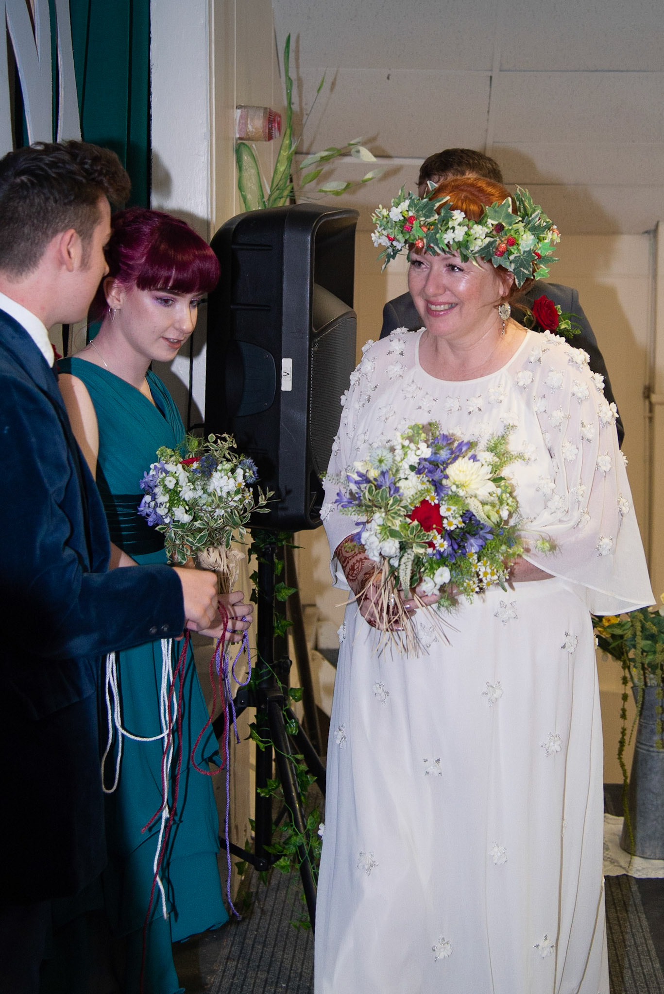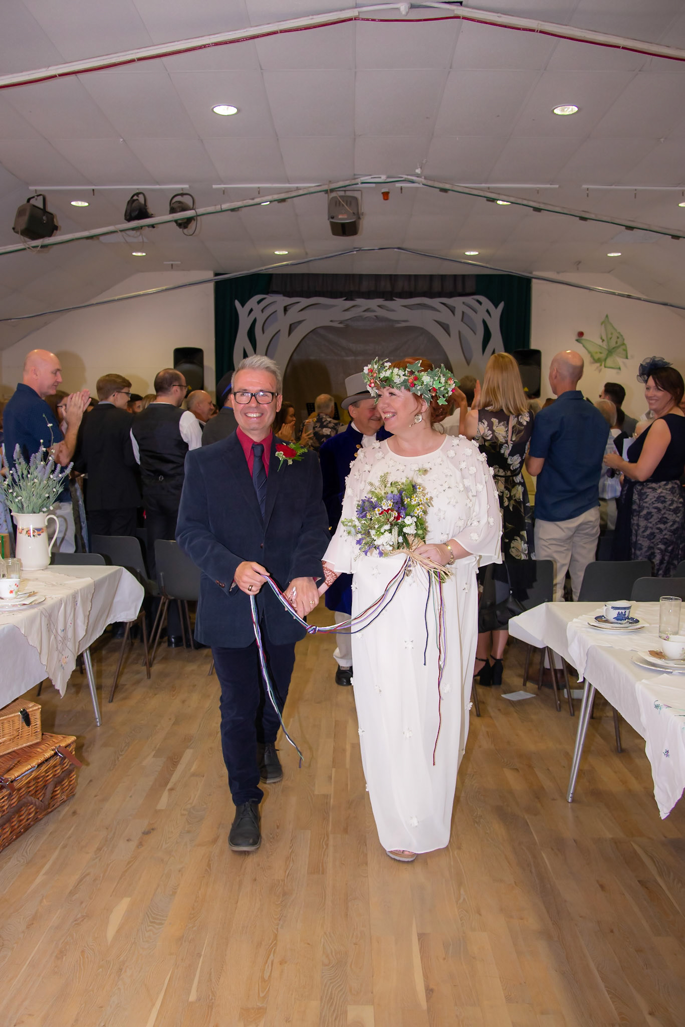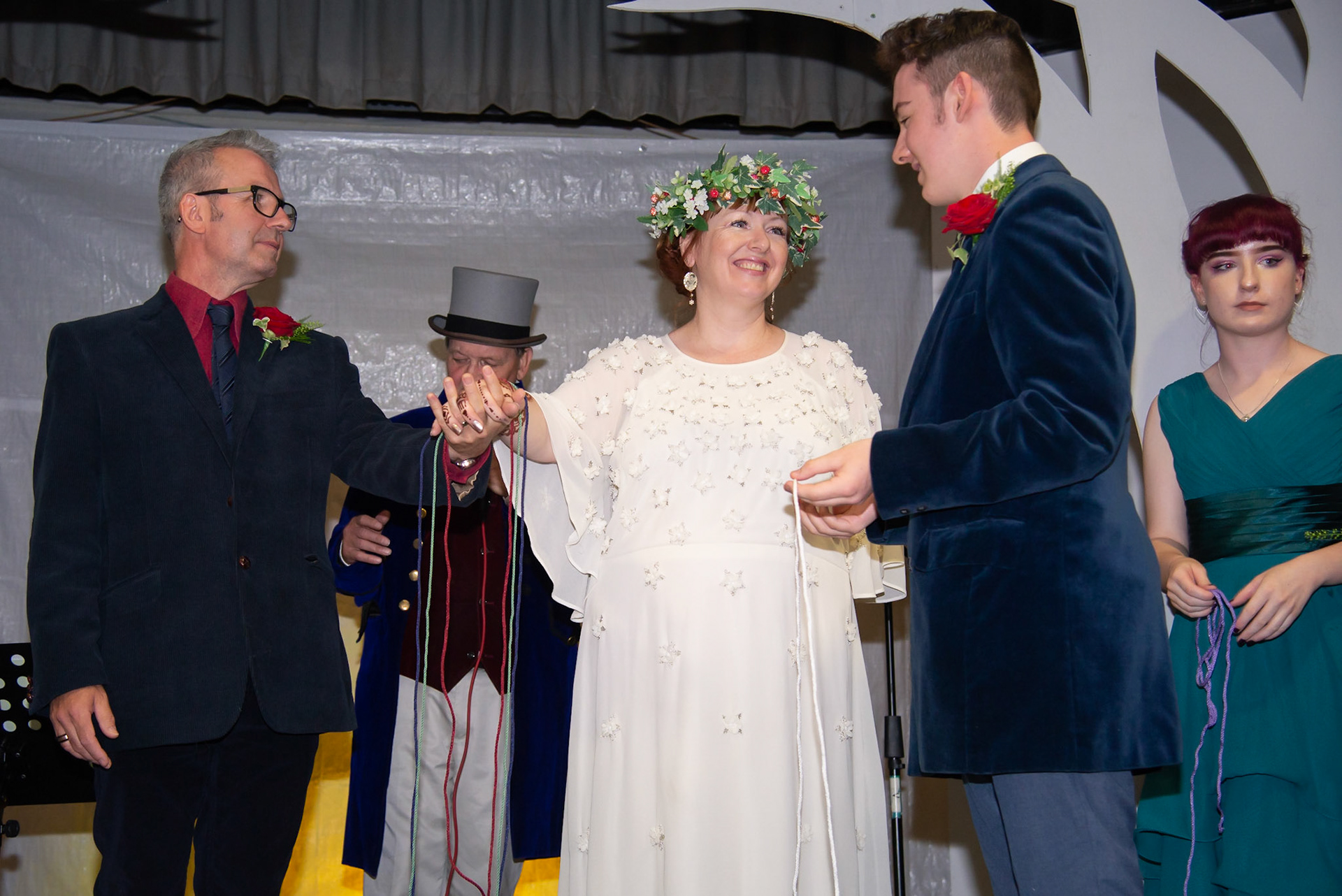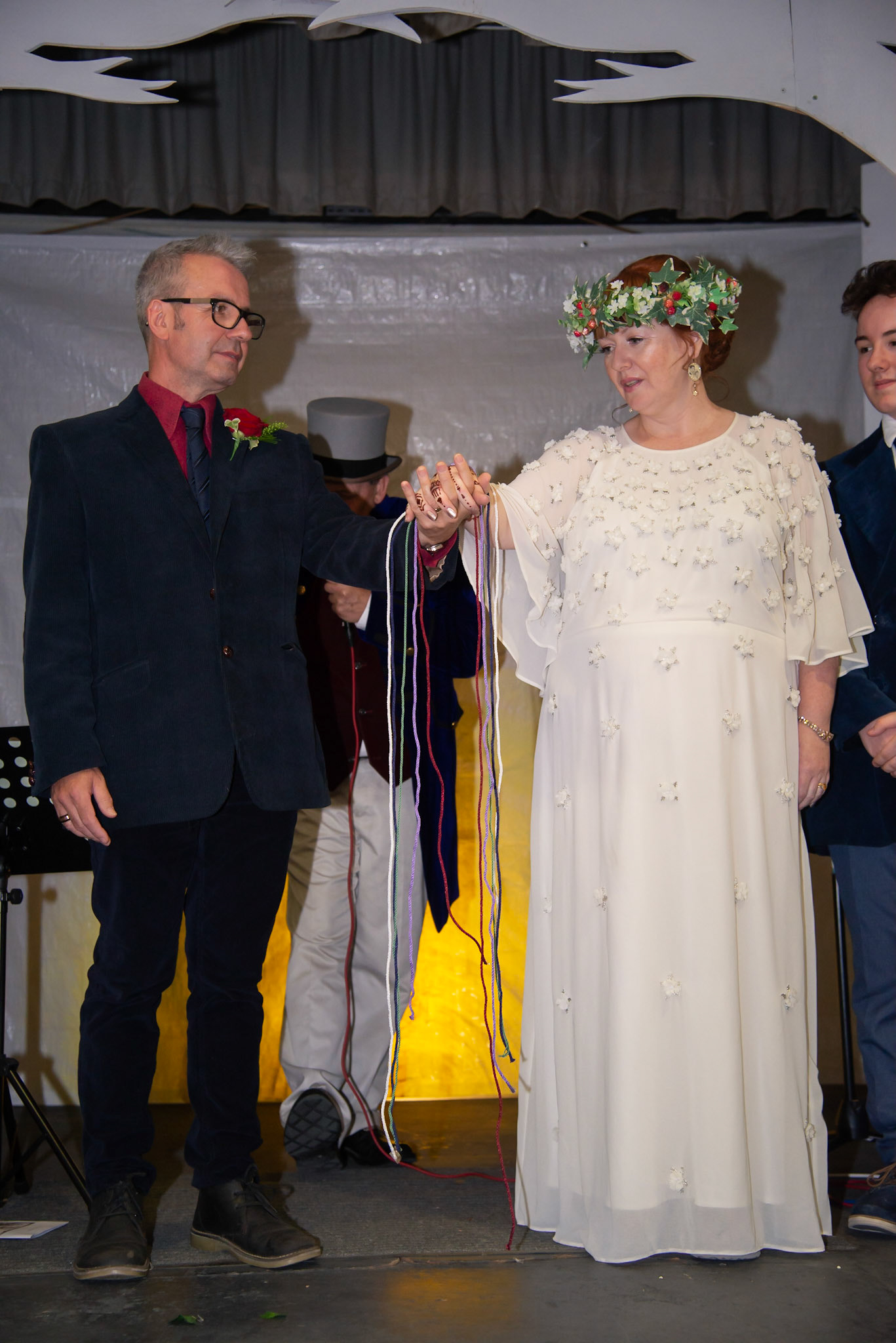 Sally-Ann arriving at the hall walking down the aisle to meet Paddy. The handfasting ceremony and Mike playing during the service.