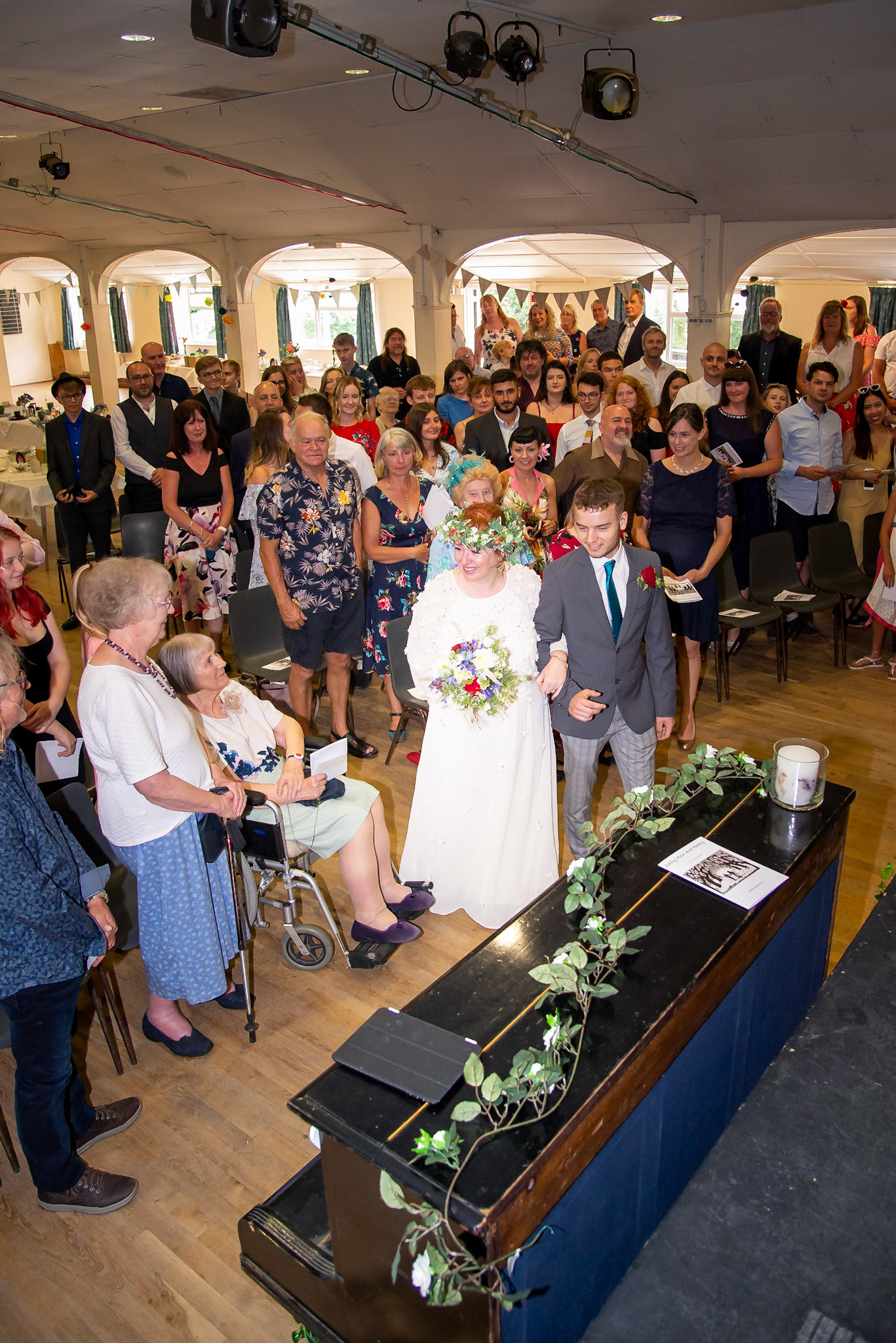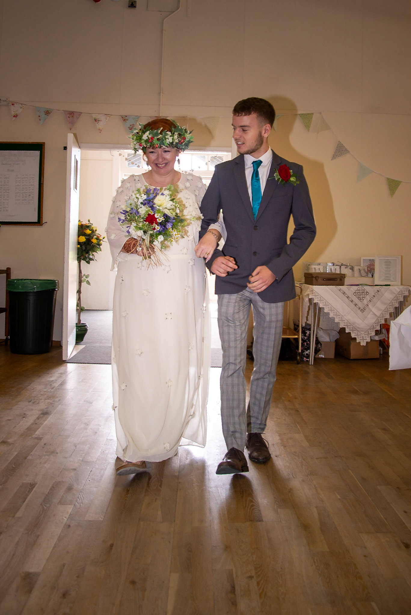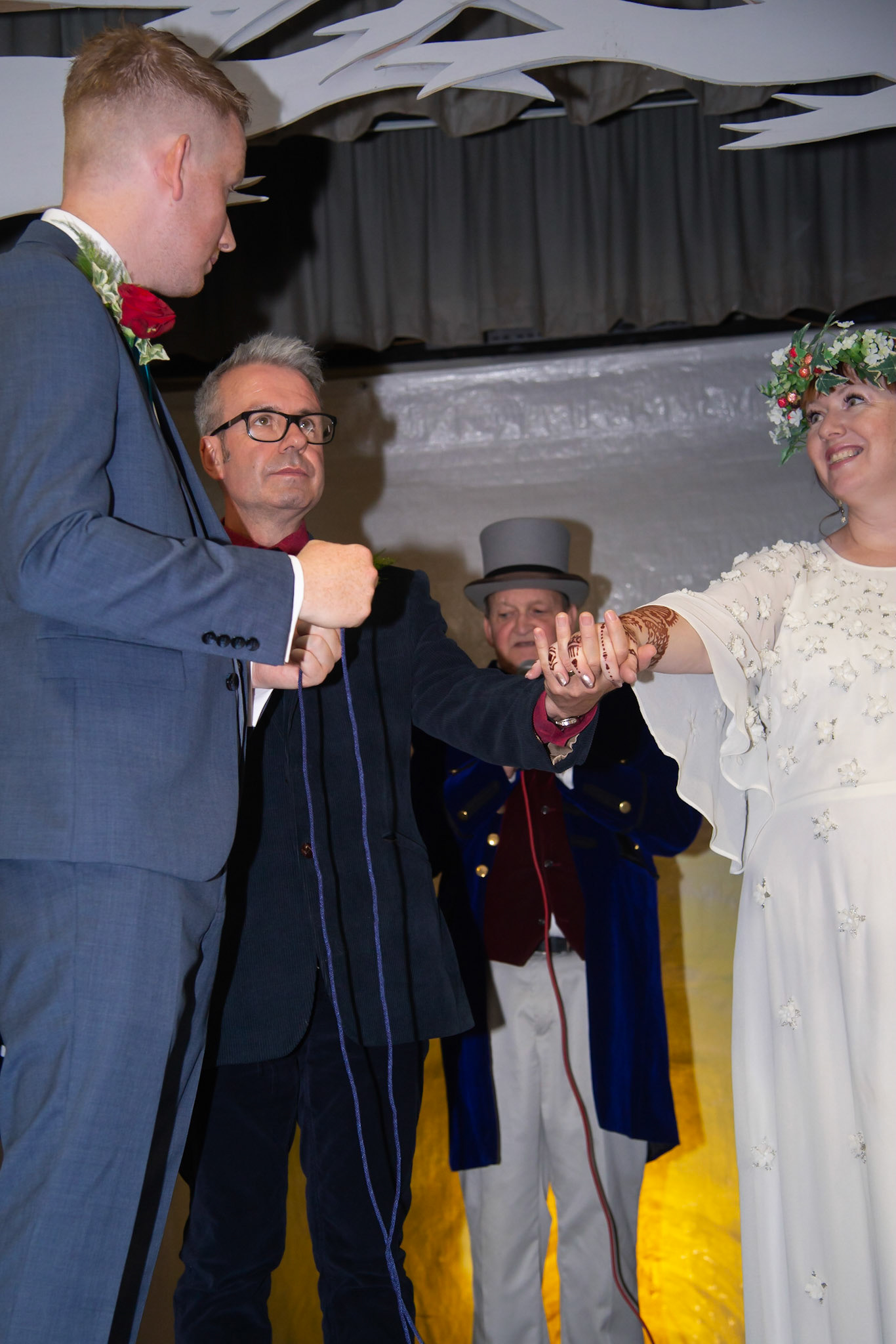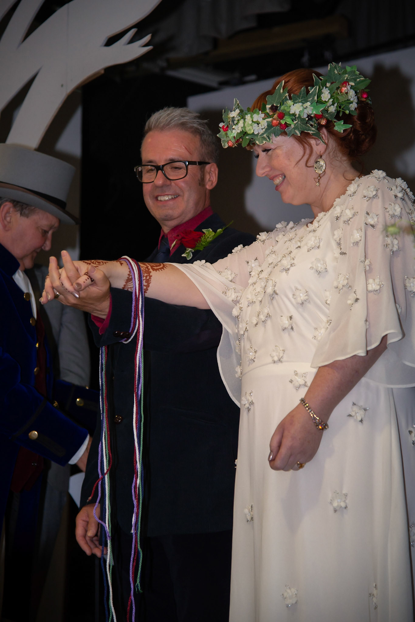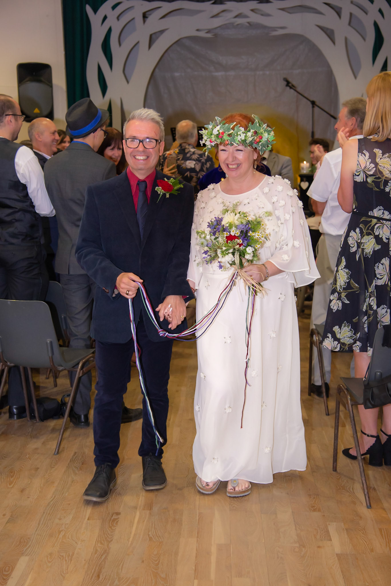 Sally-Ann arriving at the hall walking down the aisle to meet Paddy. The handfasting ceremony and Mike playing during the service.