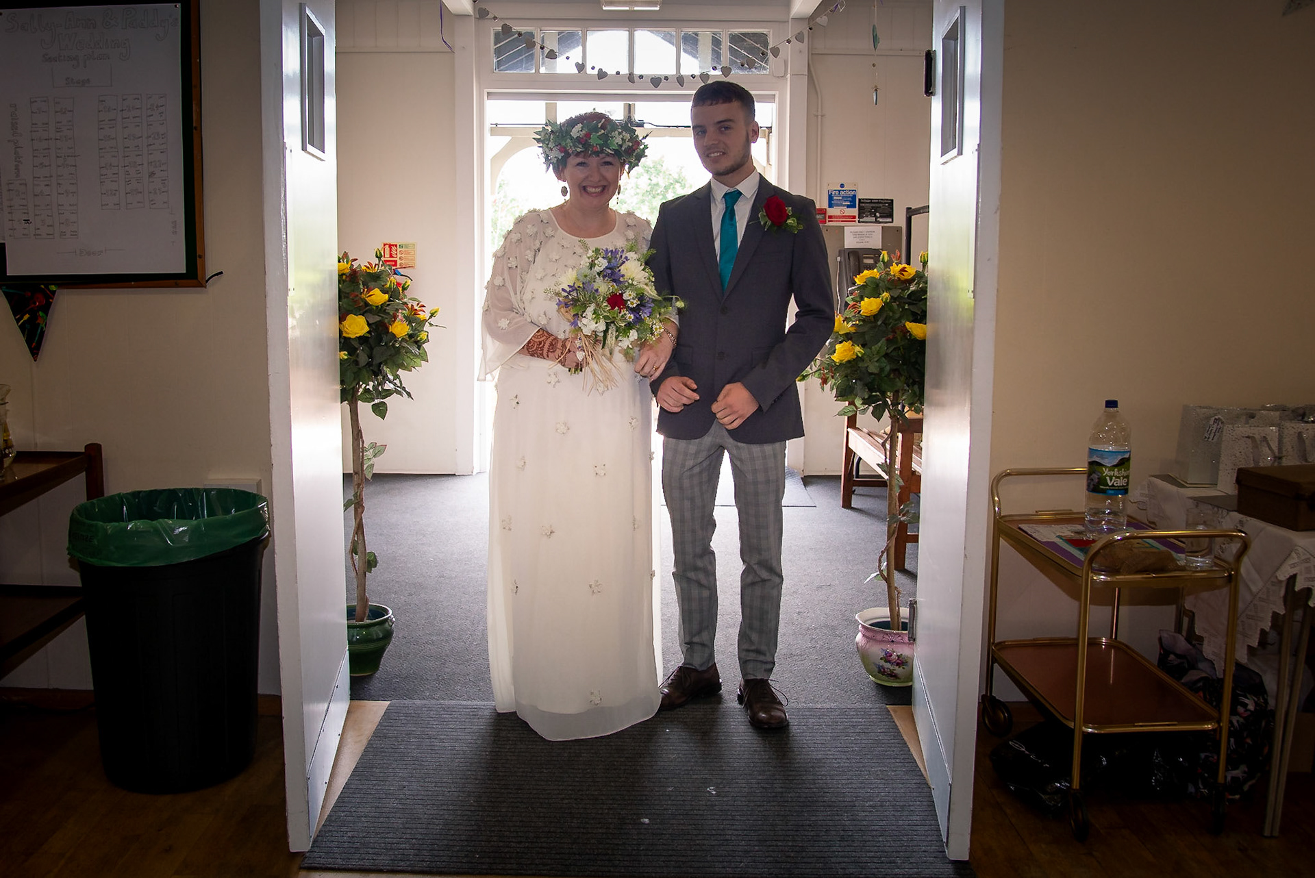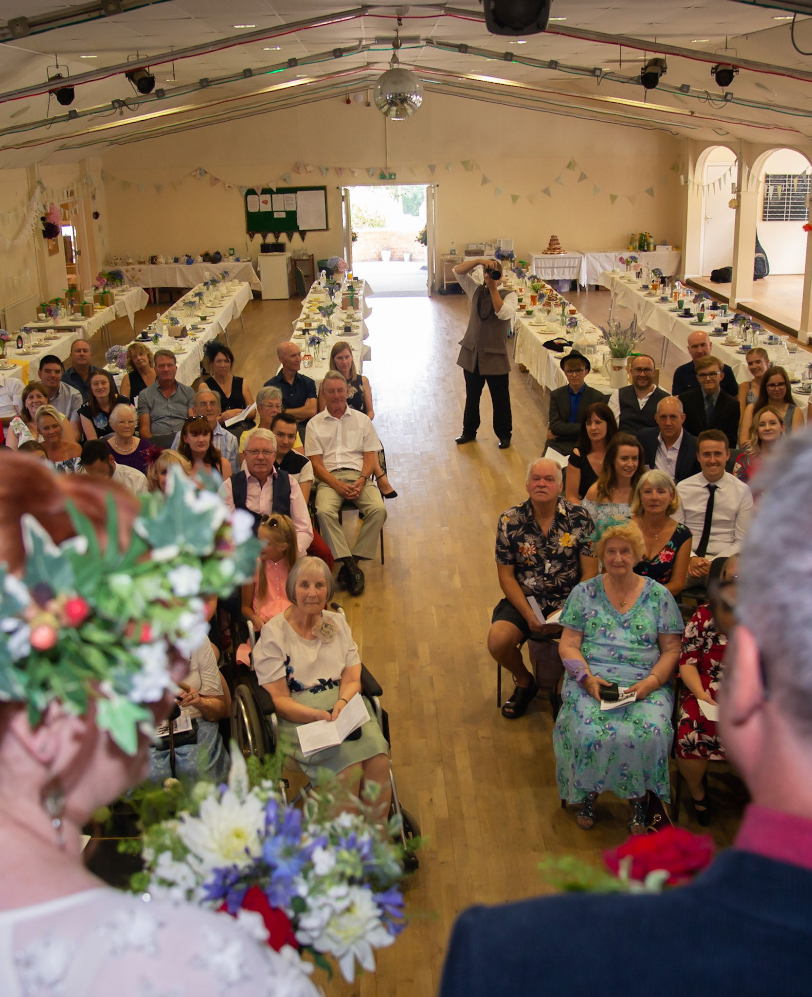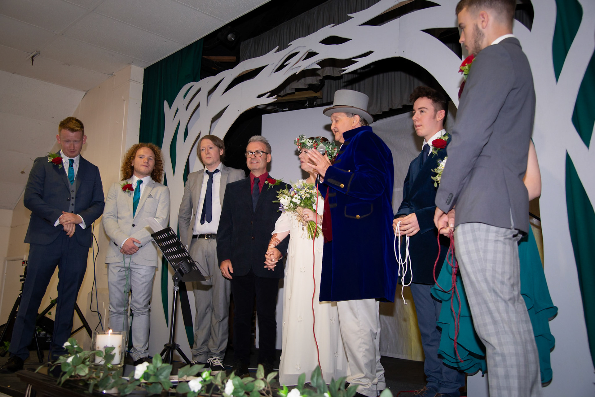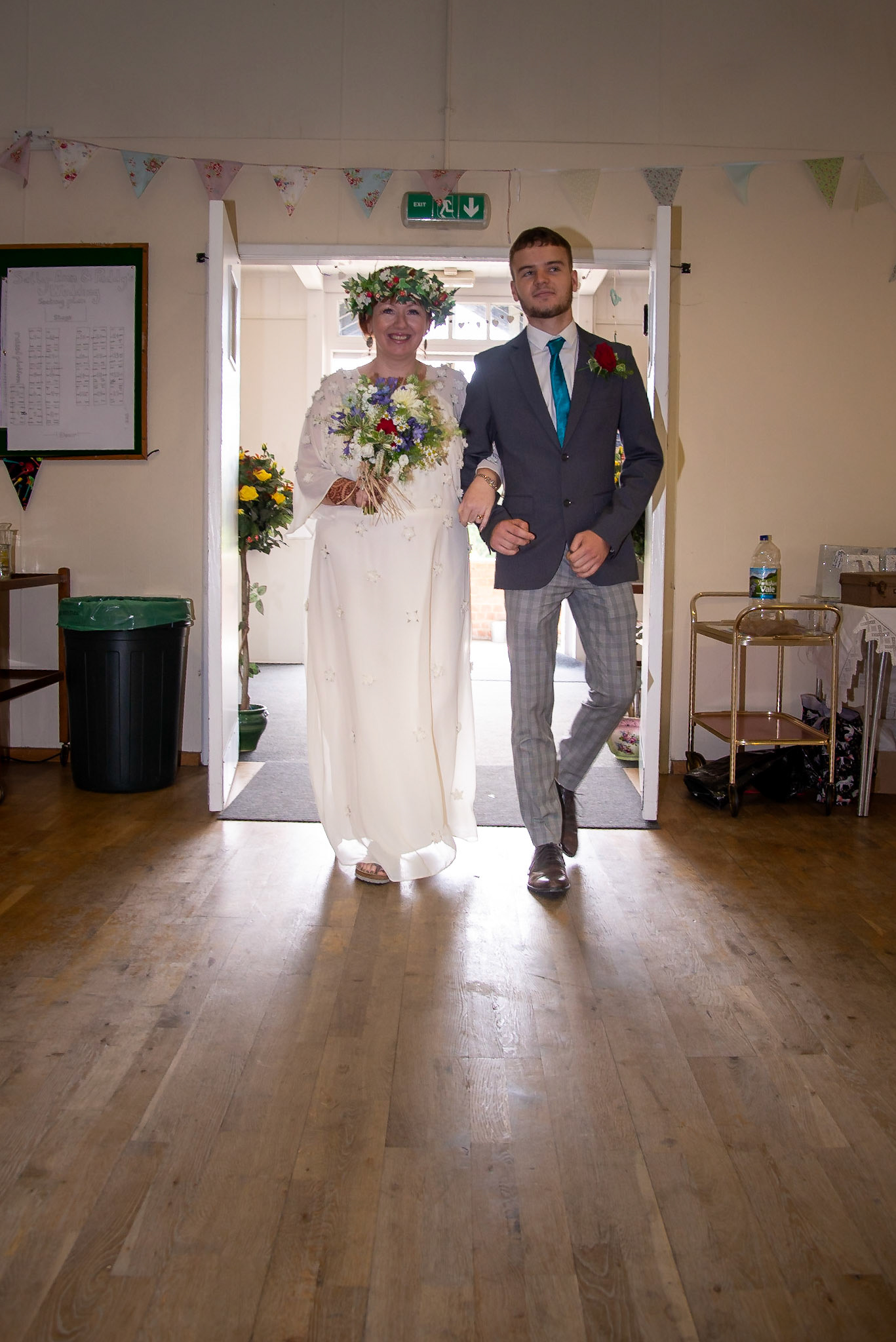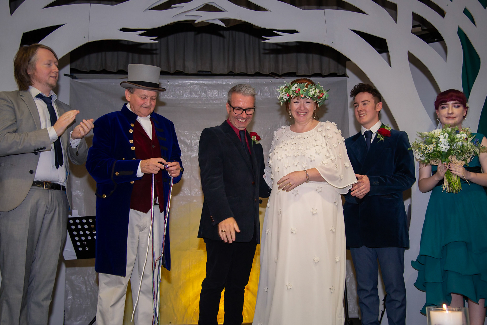 Sally-Ann arriving at the hall walking down the aisle to meet Paddy. The handfasting ceremony and Mike playing during the service.