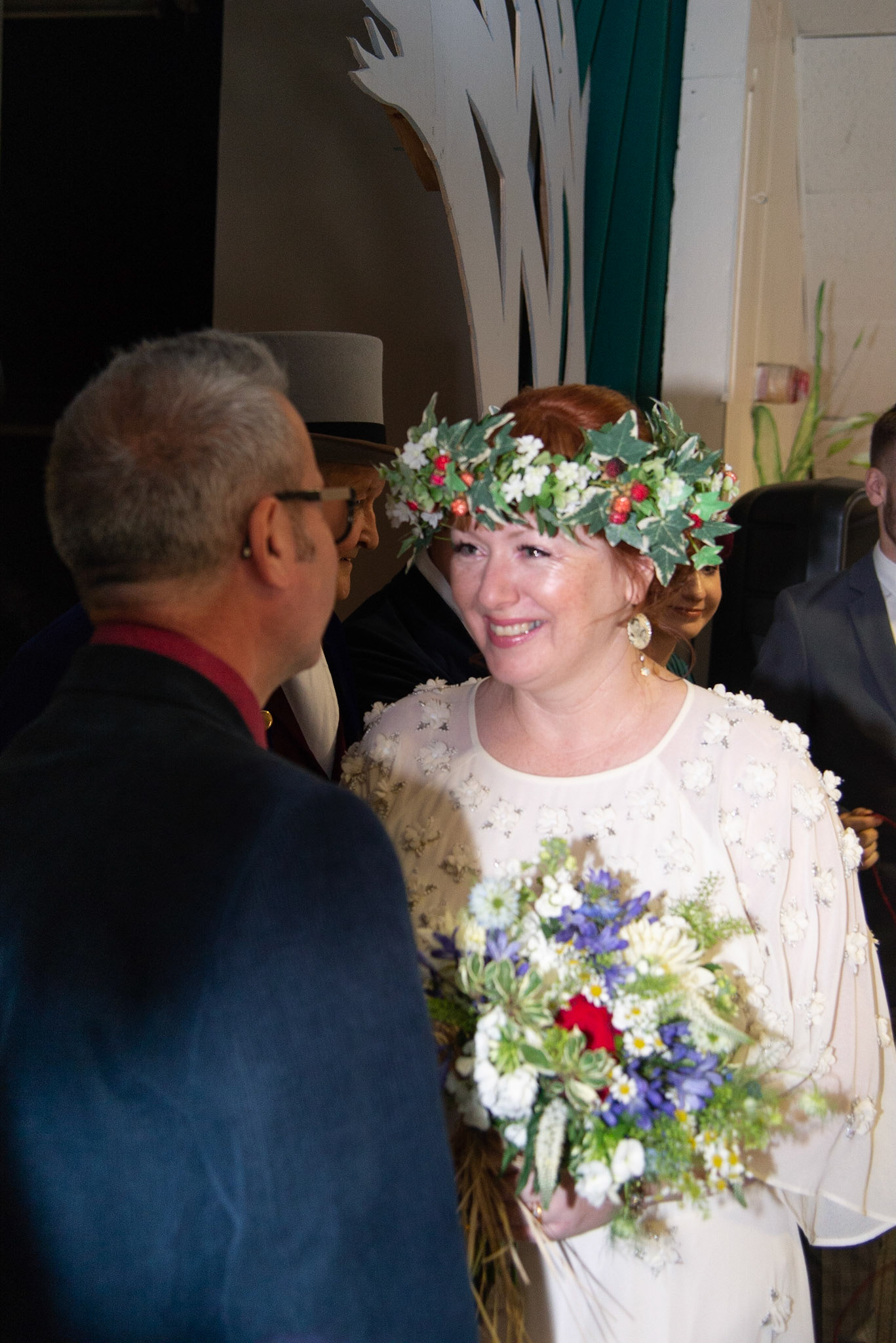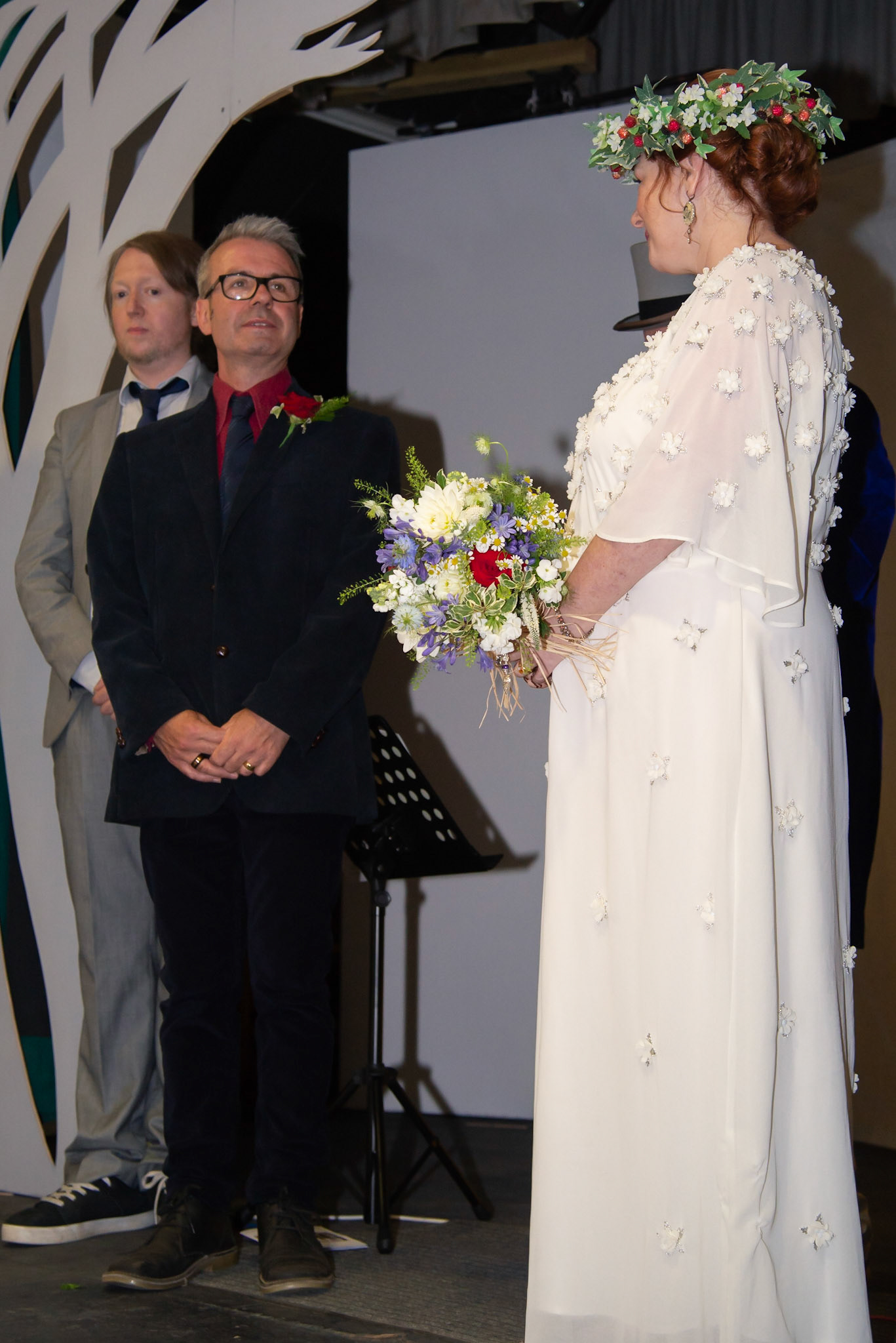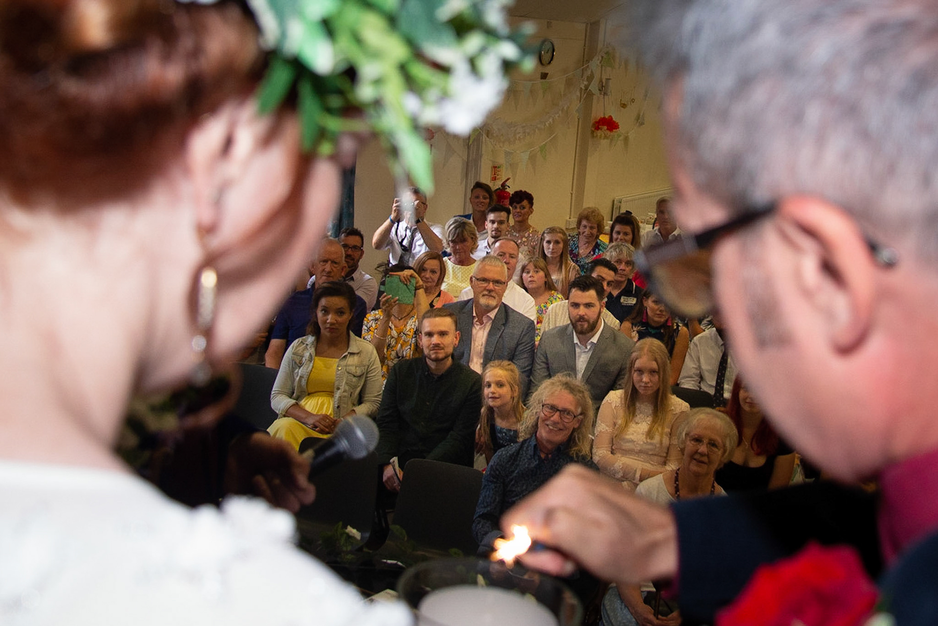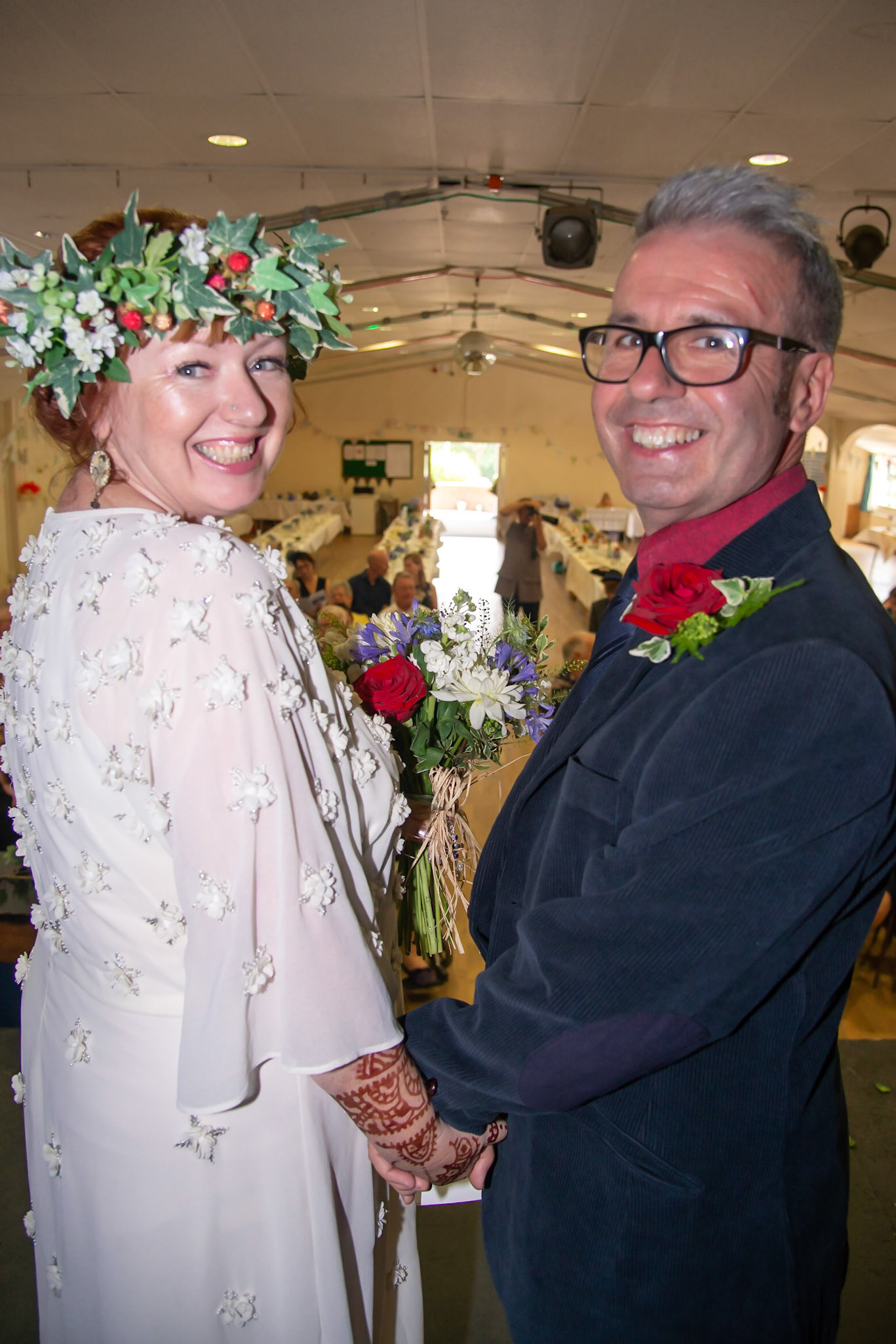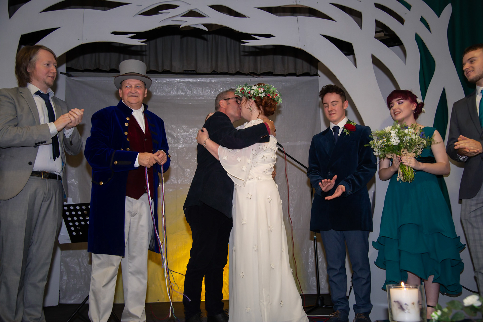 Sally-Ann arriving at the hall walking down the aisle to meet Paddy. The handfasting ceremony and Mike playing during the service.