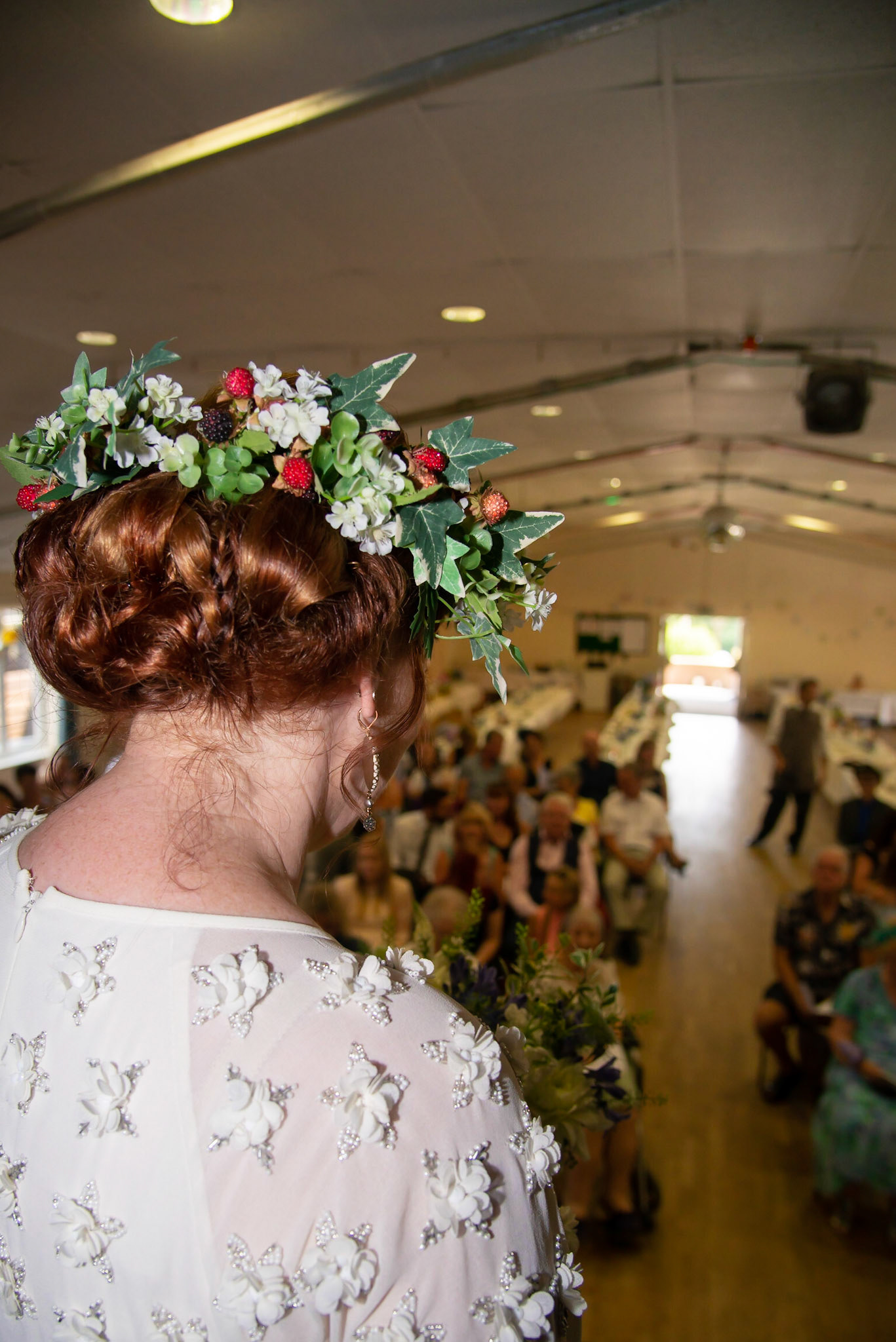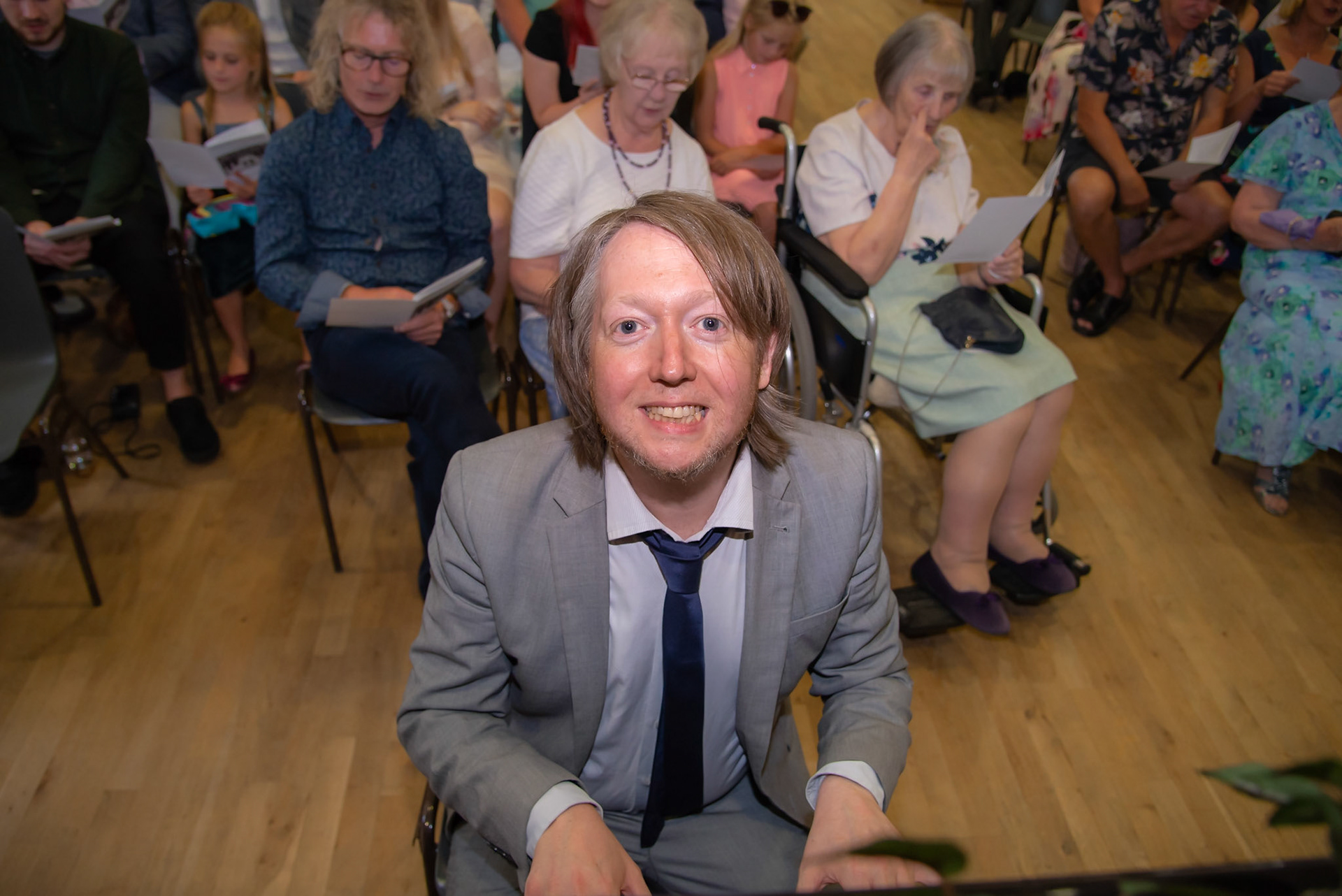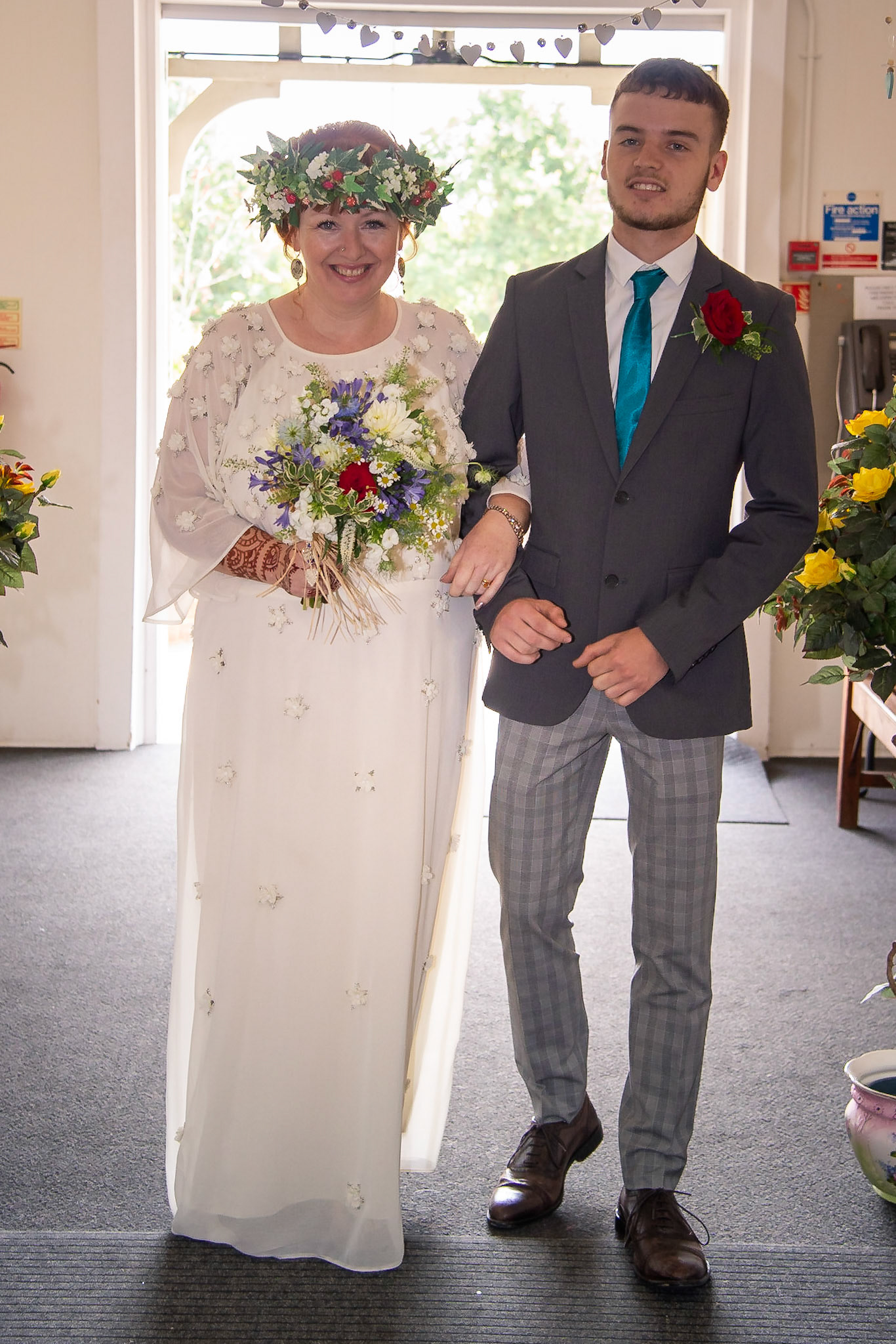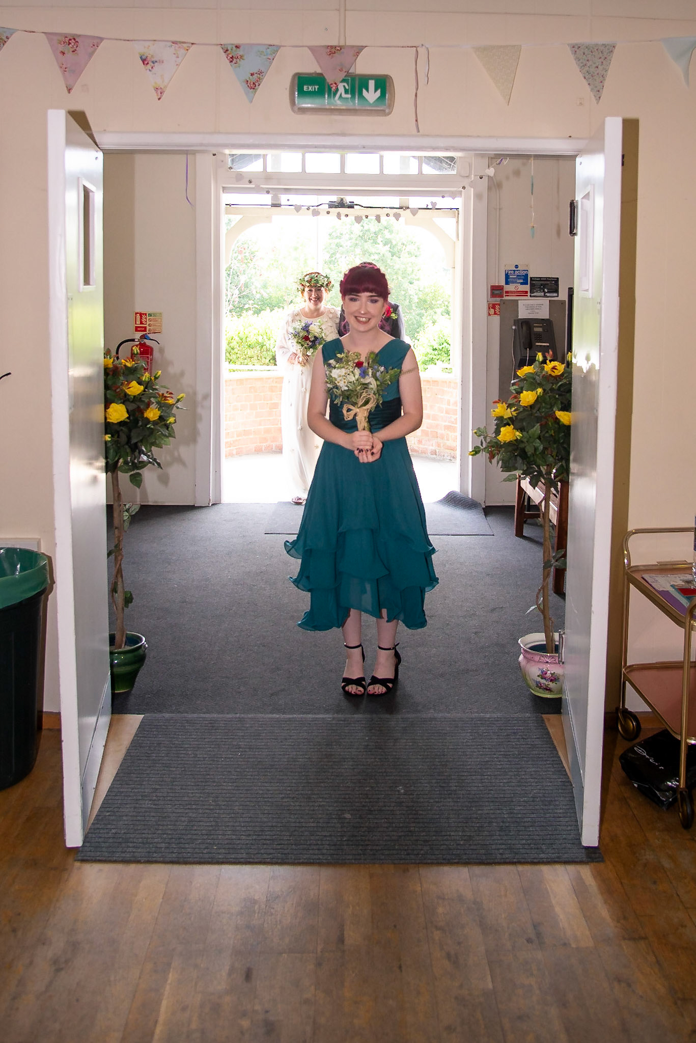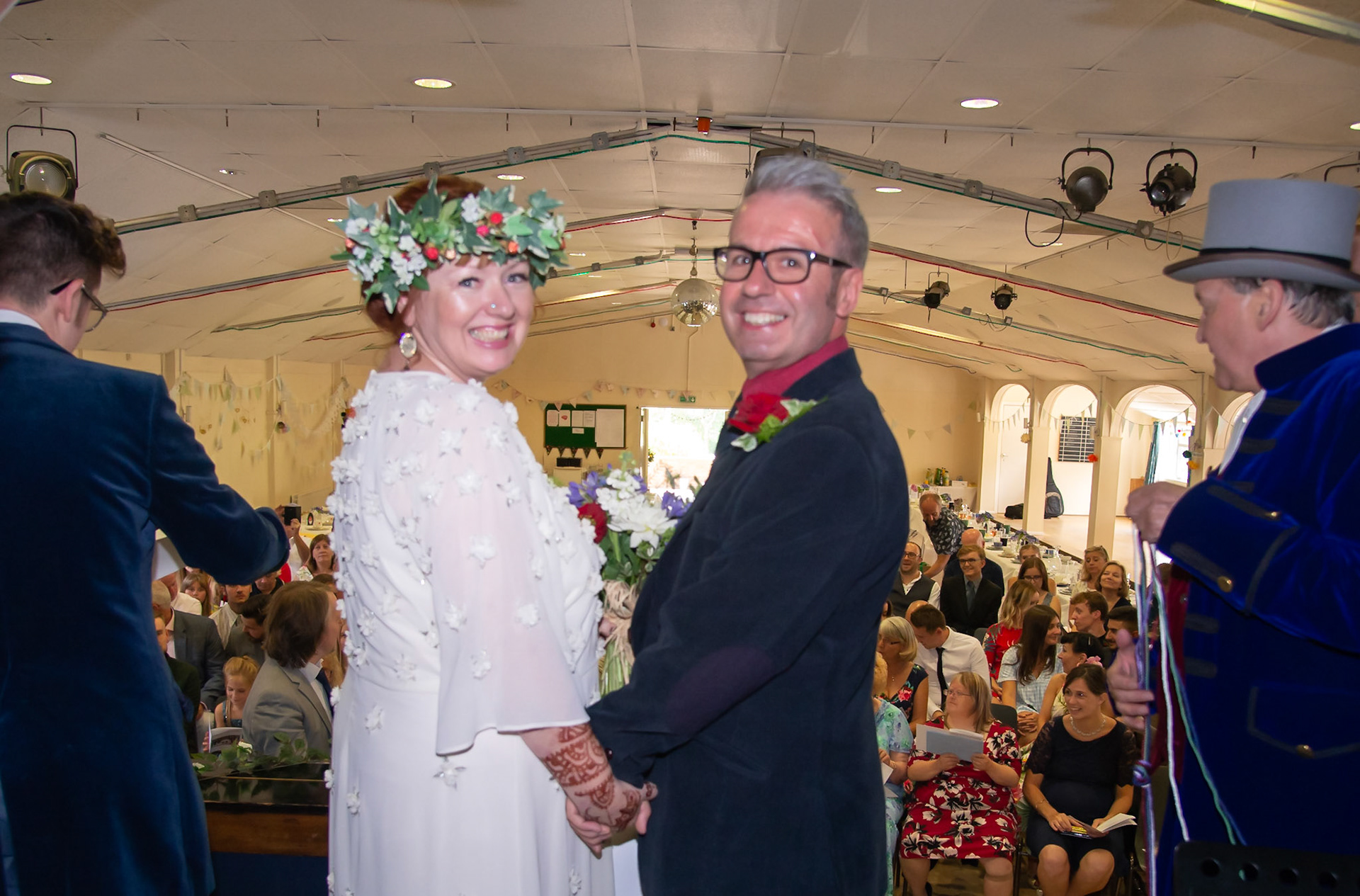 Sally-Ann arriving at the hall walking down the aisle to meet Paddy. The handfasting ceremony and Mike playing during the service.