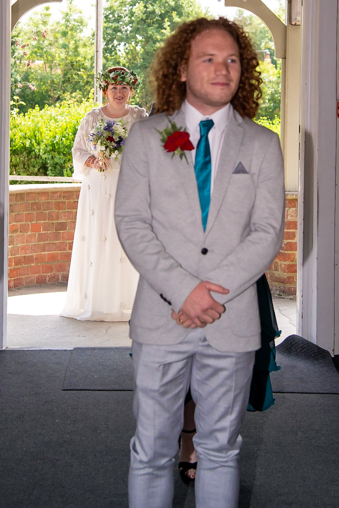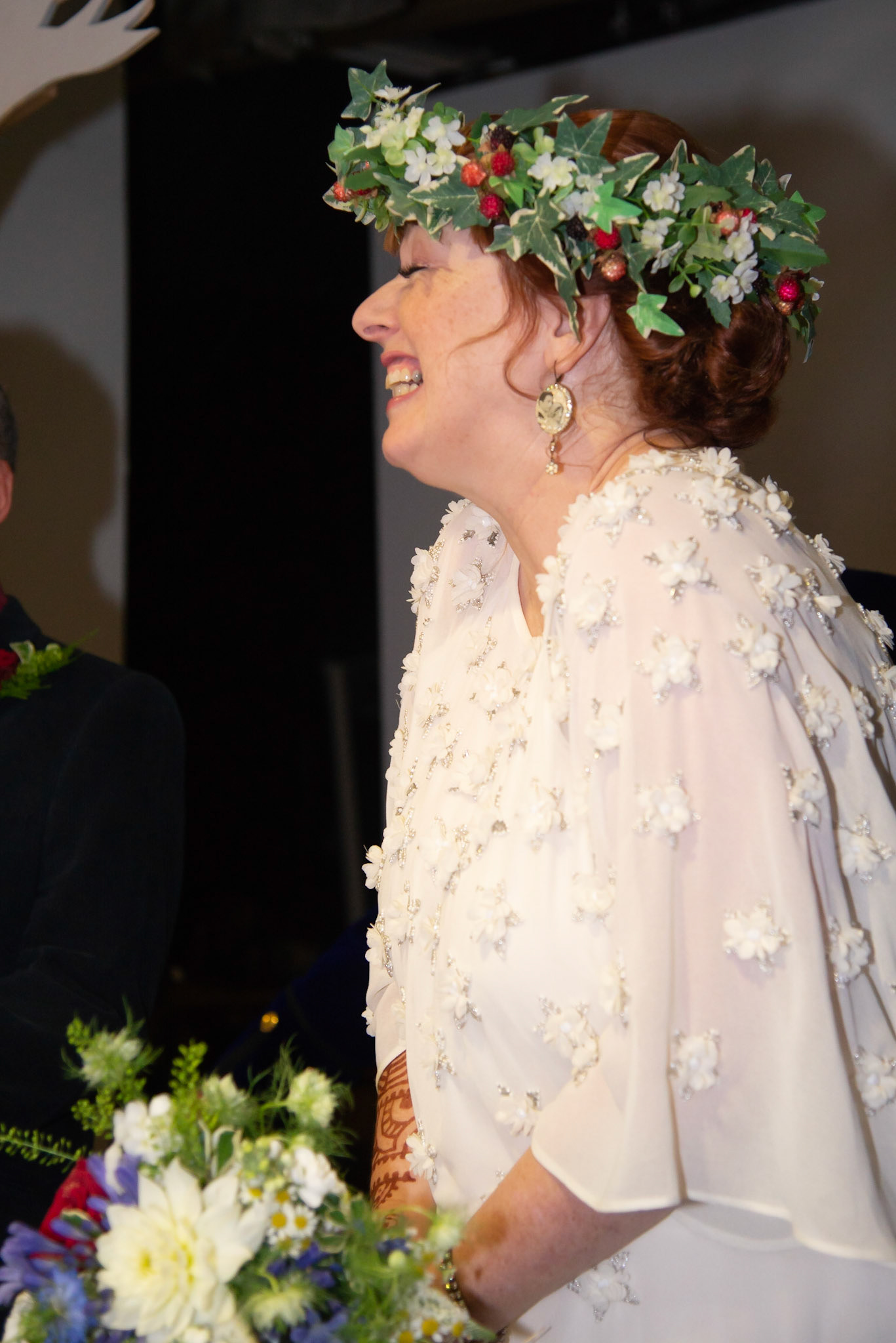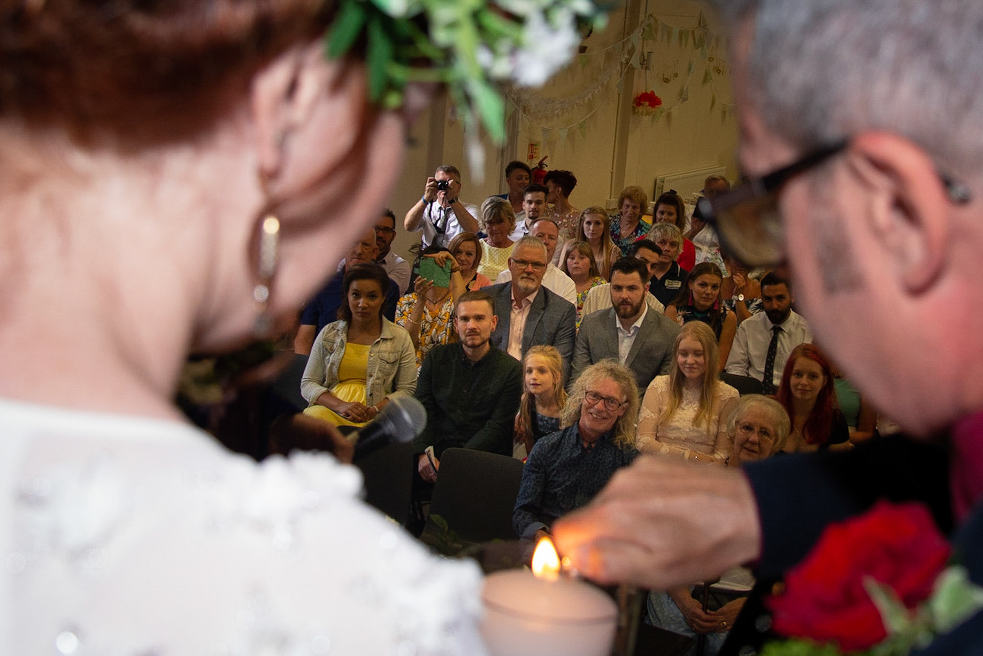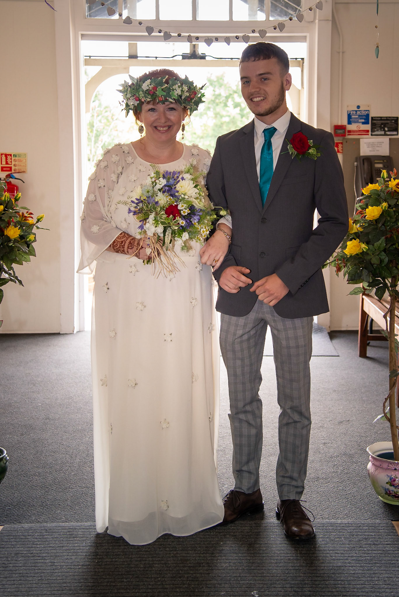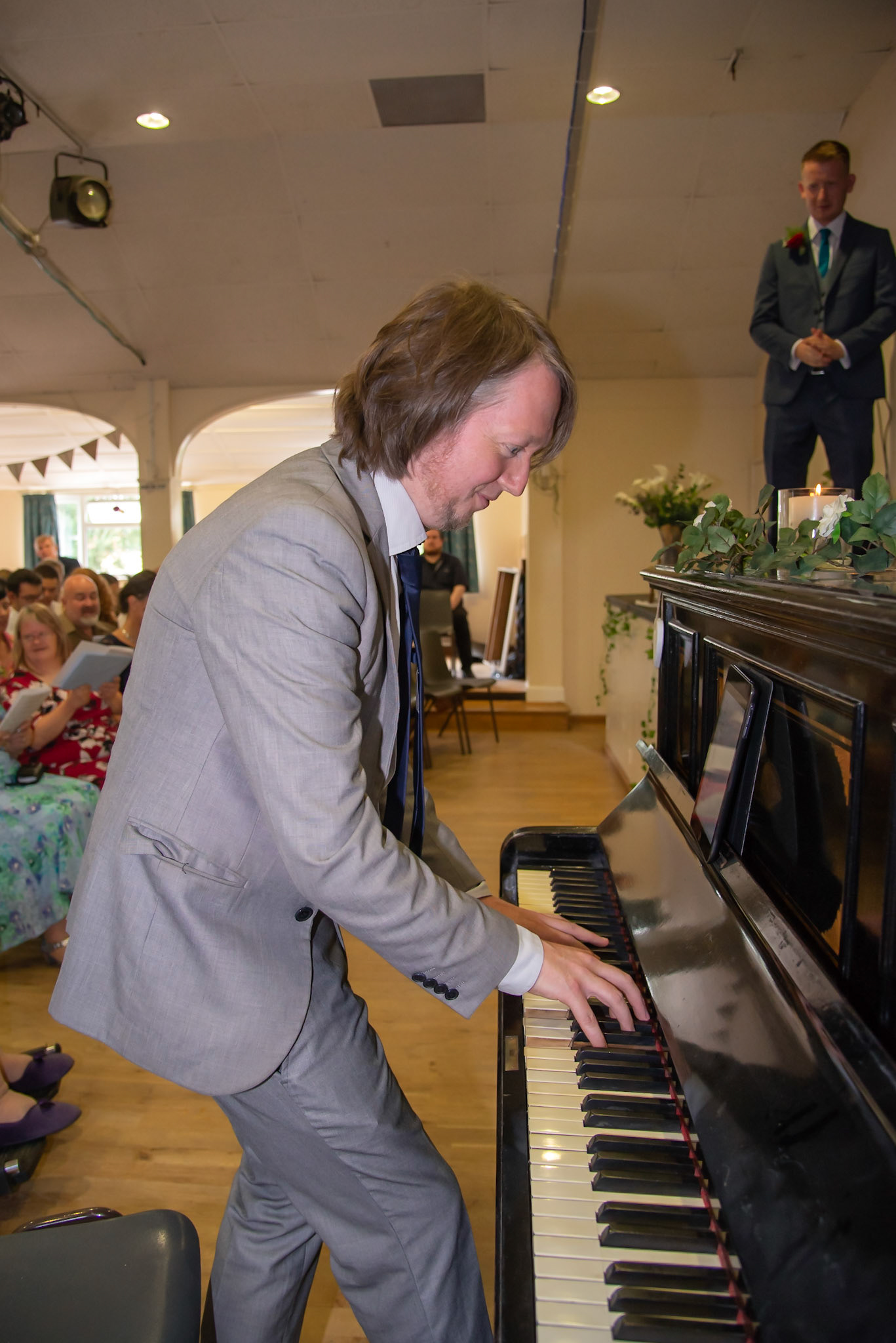Sally-Ann arriving at the hall walking down the aisle to meet Paddy. The handfasting ceremony and Mike playing during the service.