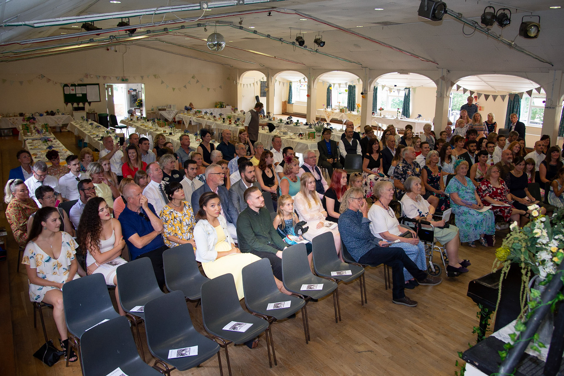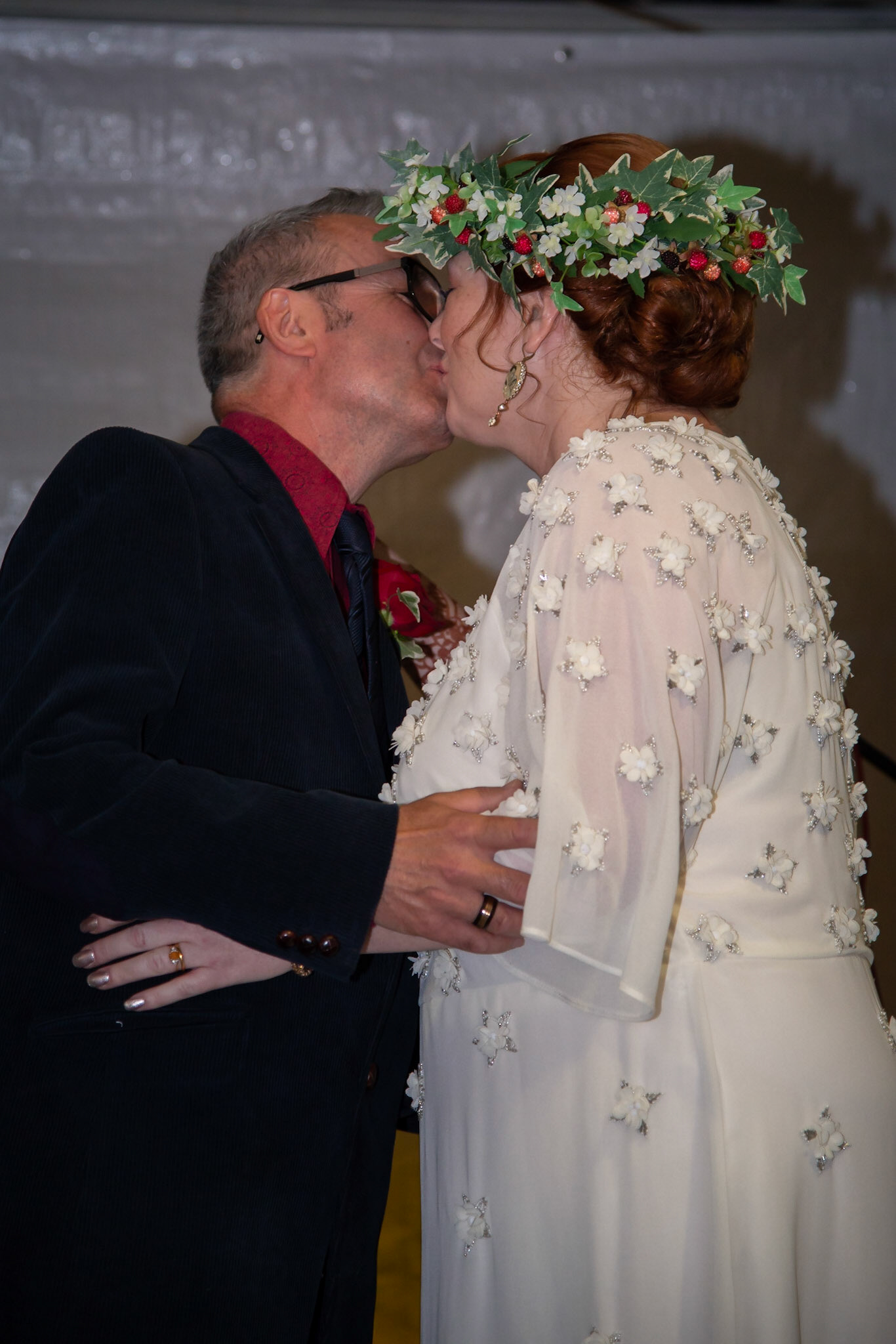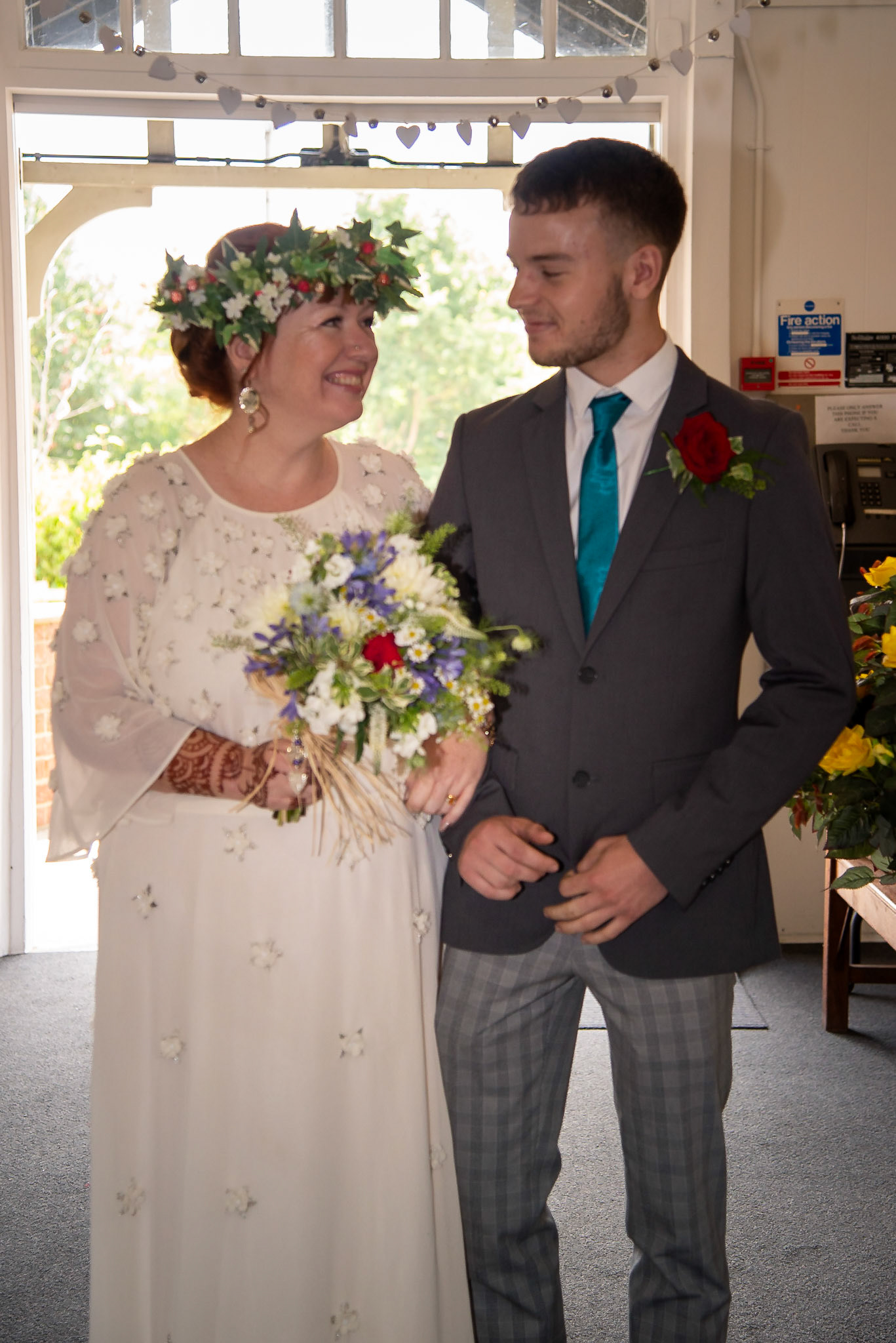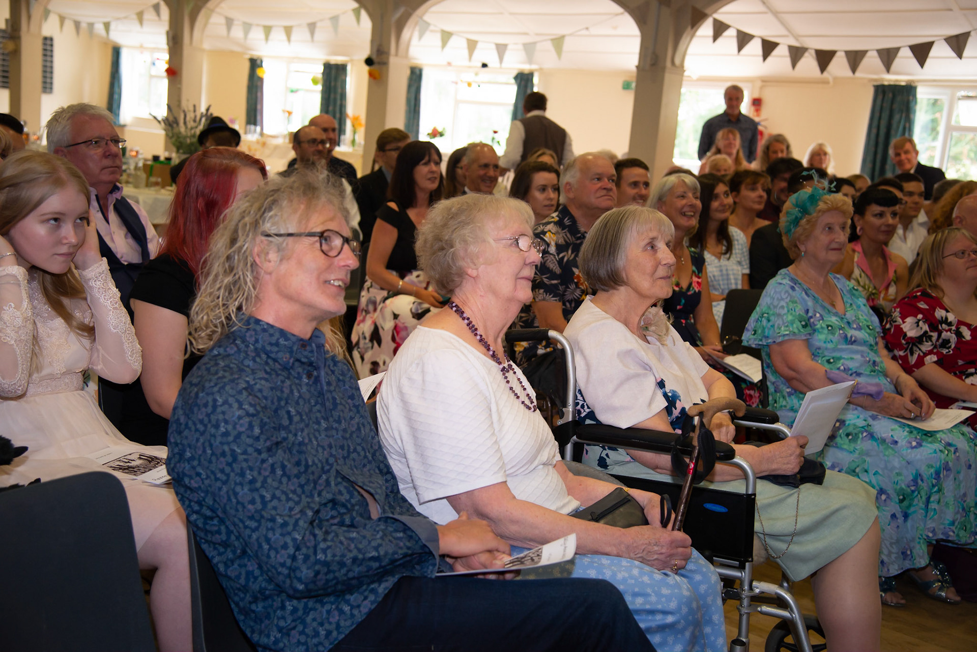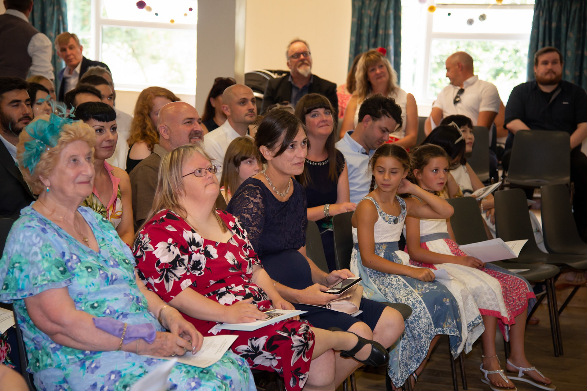 Sally-Ann arriving at the hall walking down the aisle to meet Paddy. The handfasting ceremony and Mike playing during the service.