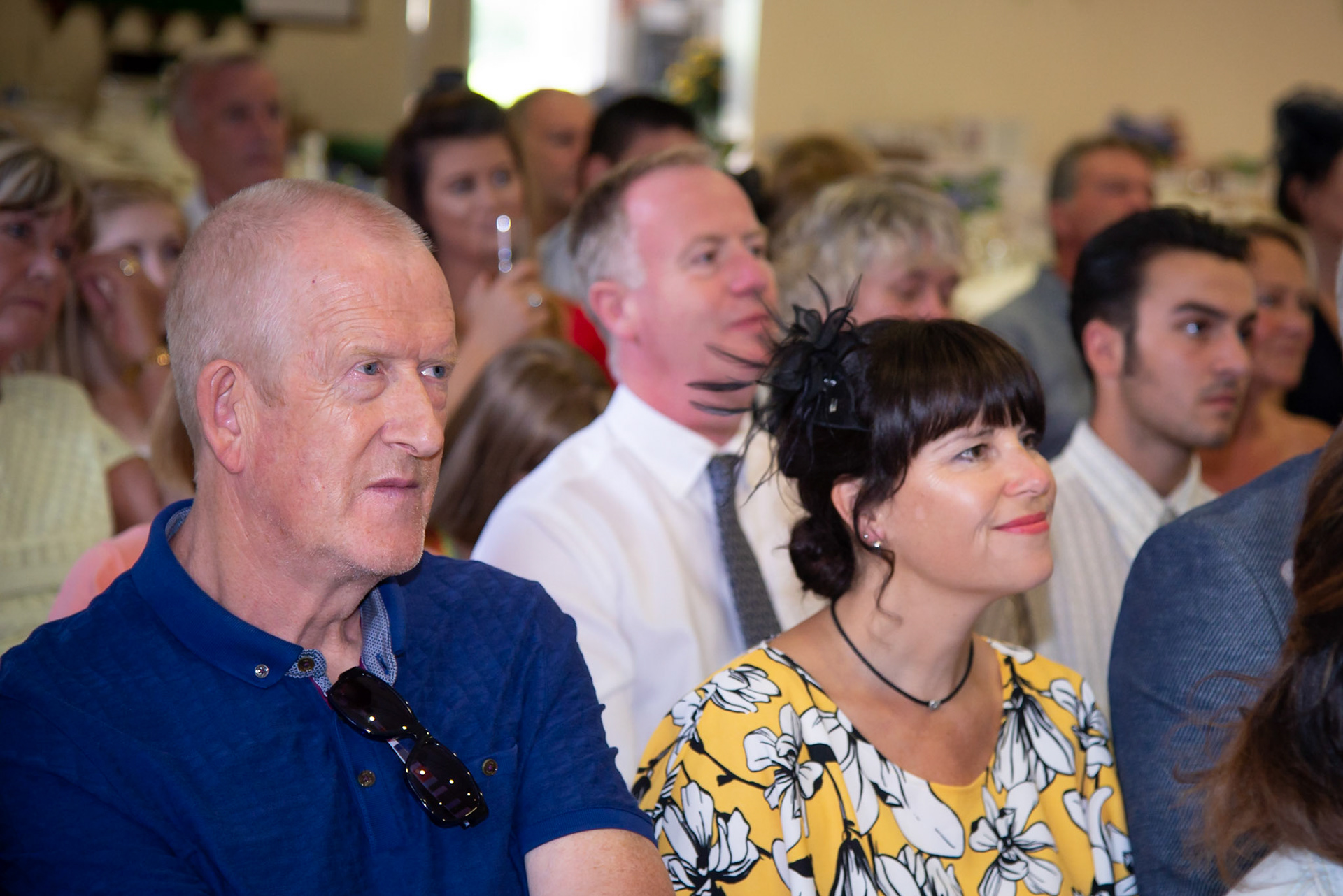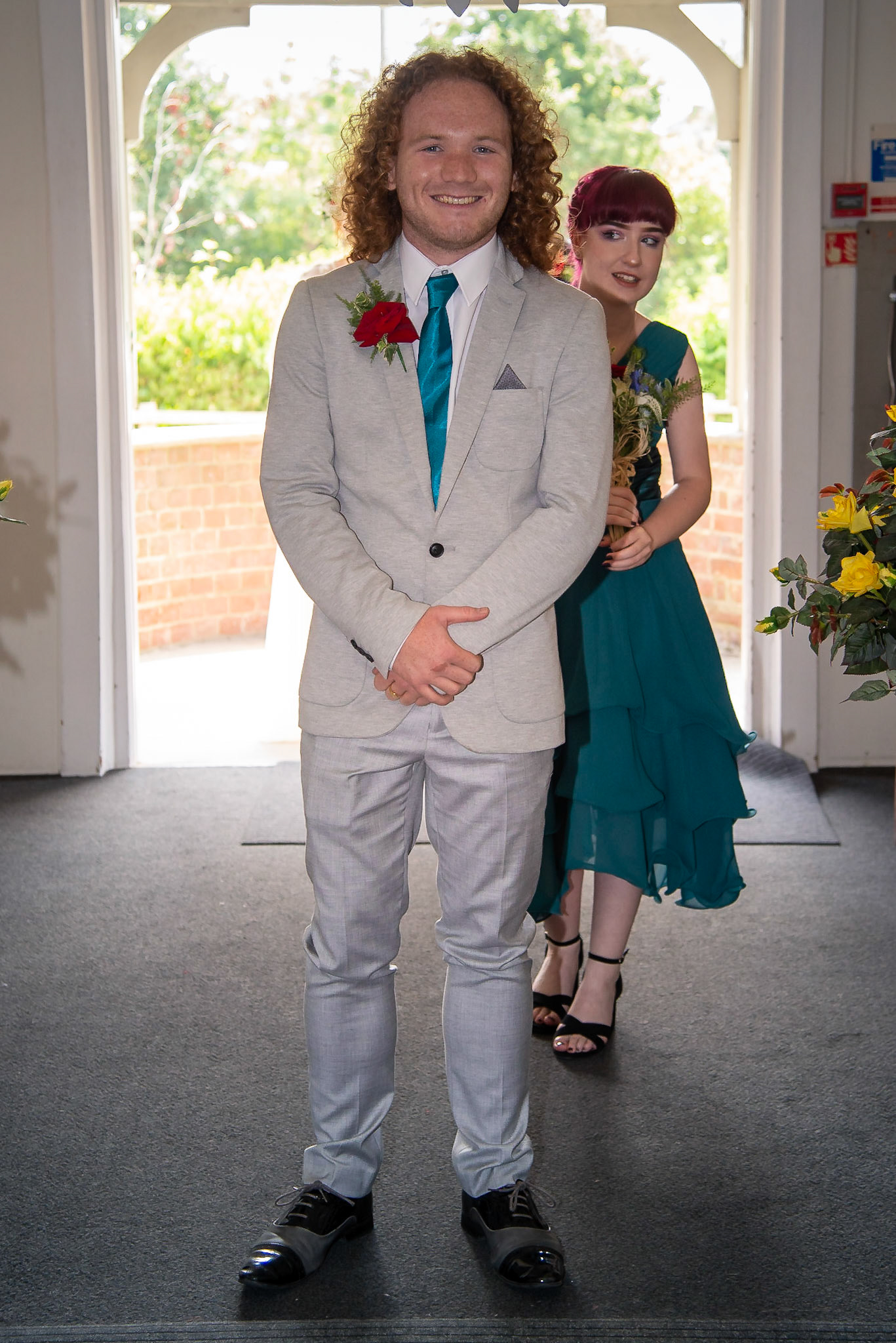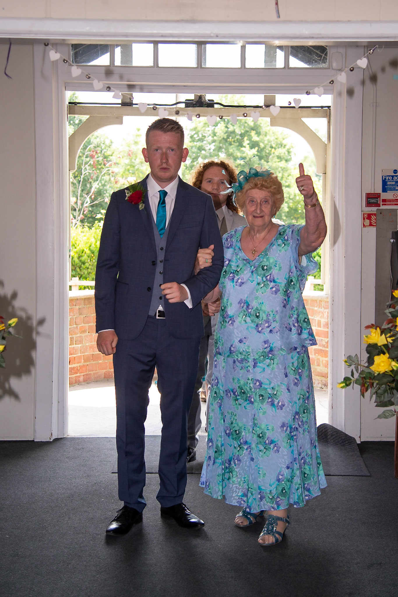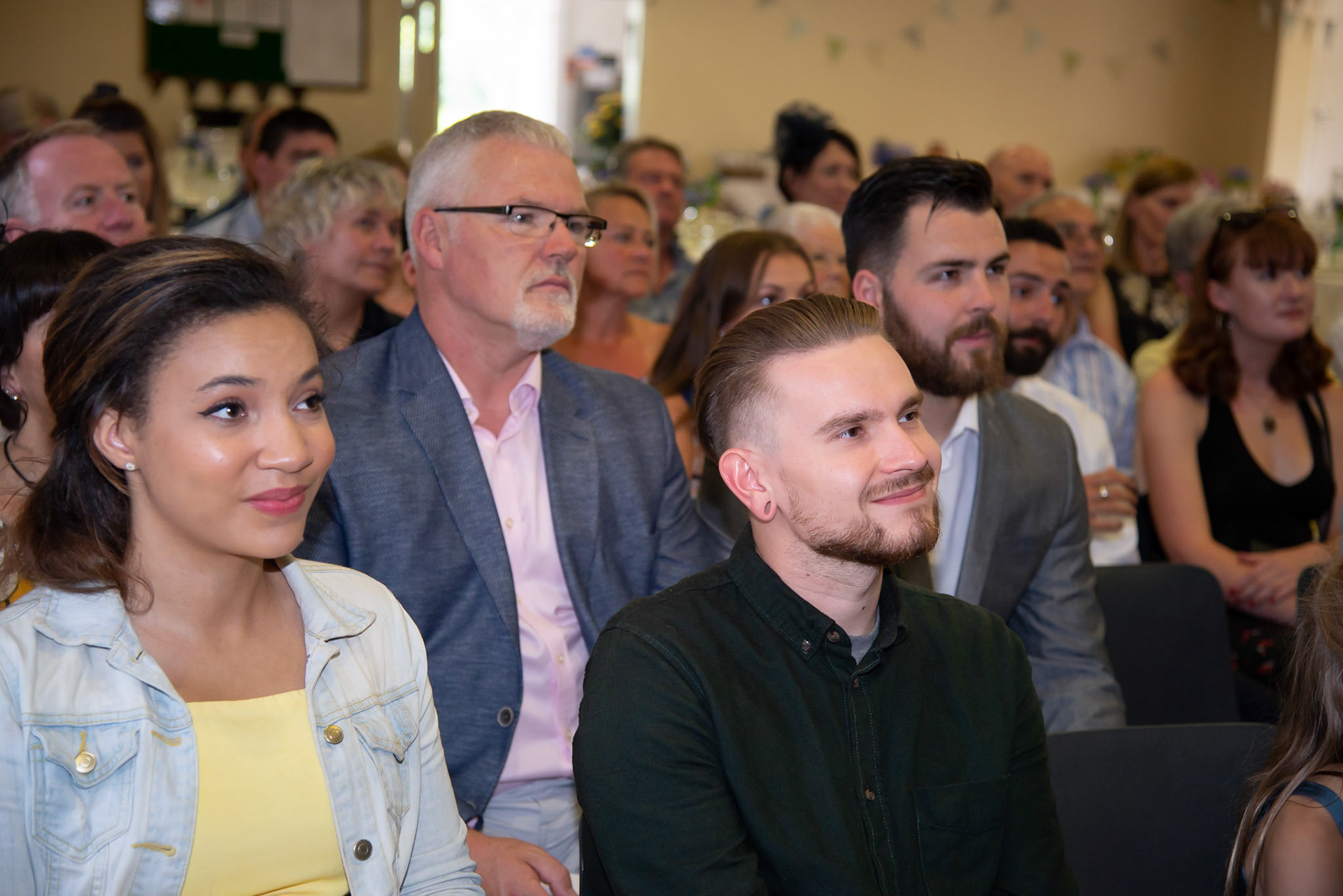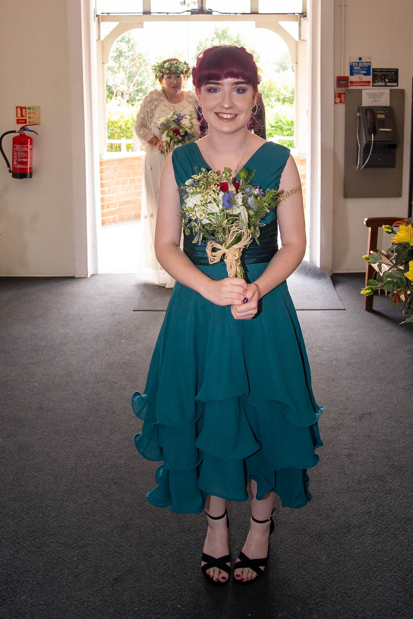Sally-Ann arriving at the hall walking down the aisle to meet Paddy. The handfasting ceremony and Mike playing during the service.