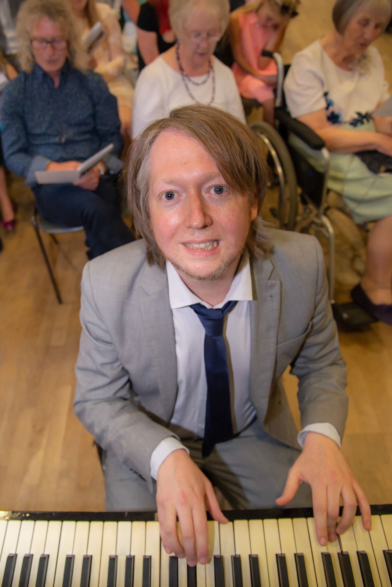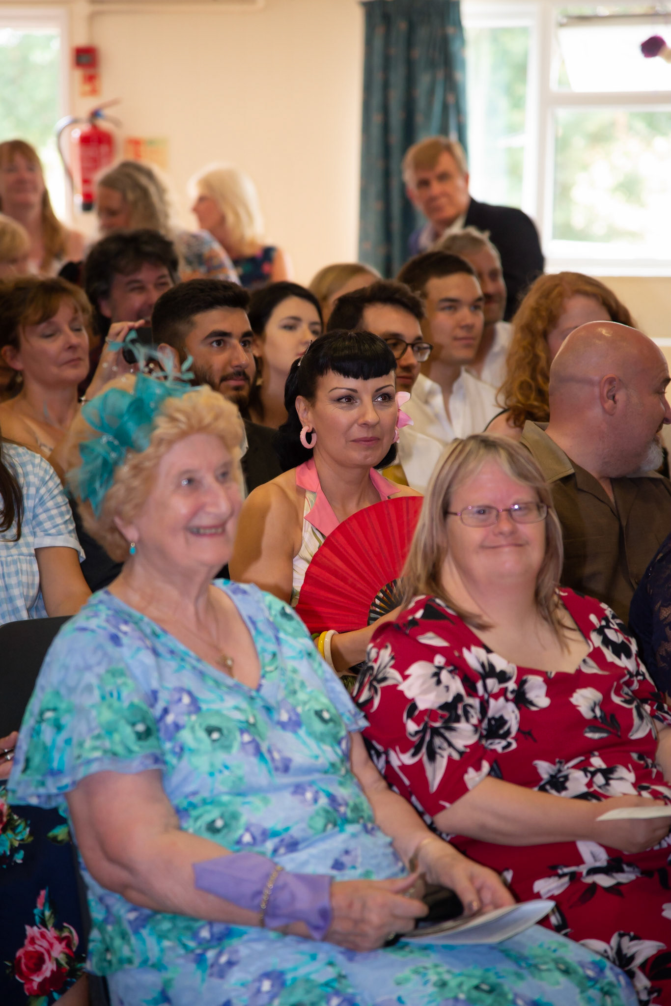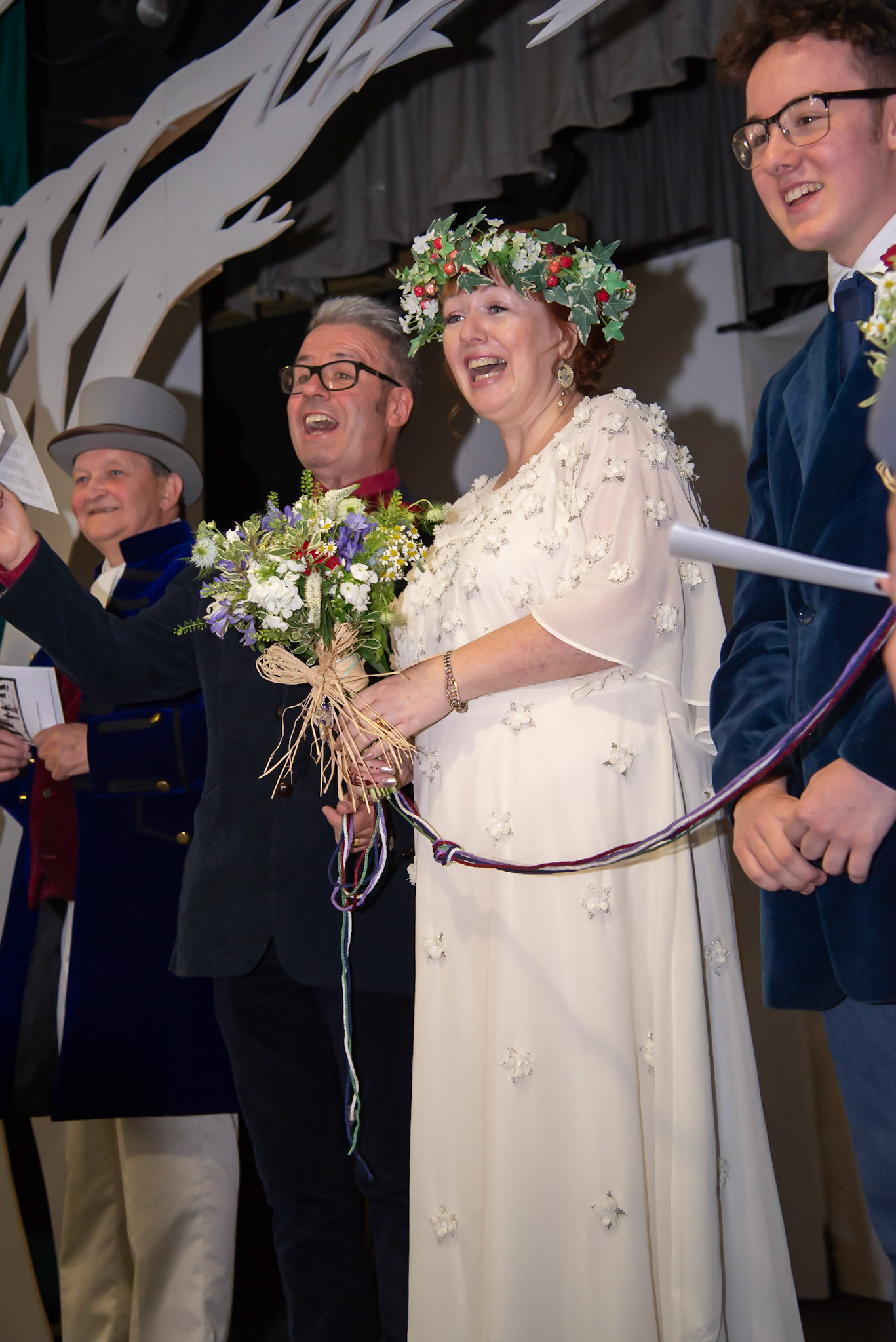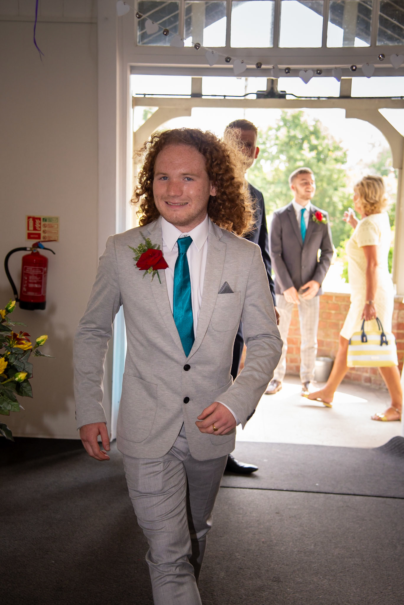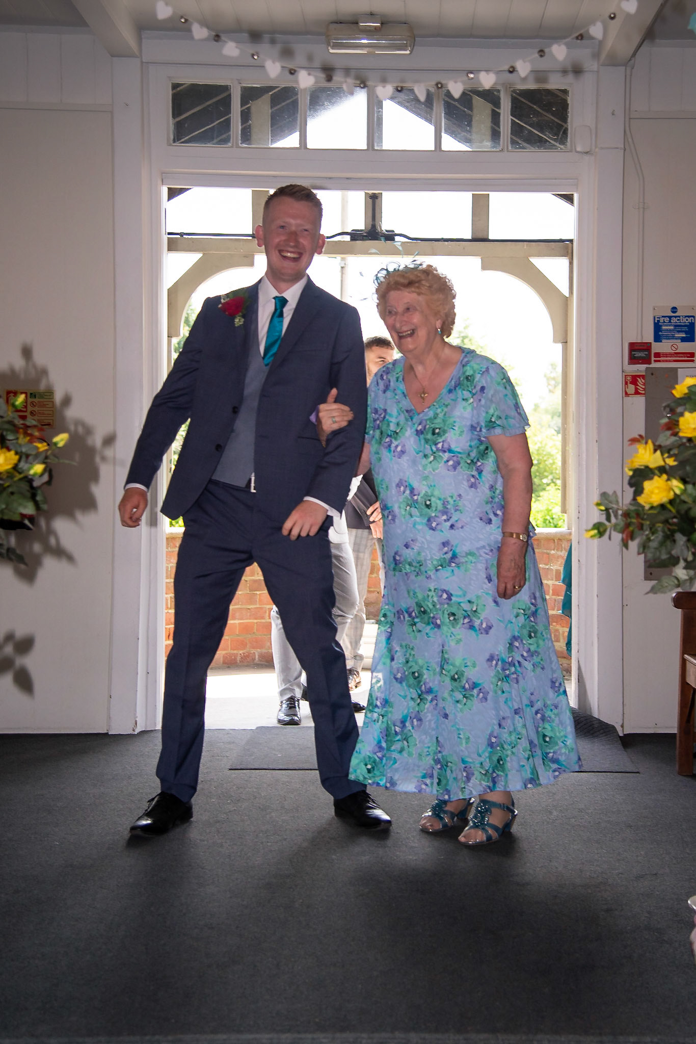 Sally-Ann arriving at the hall walking down the aisle to meet Paddy. The handfasting ceremony and Mike playing during the service.