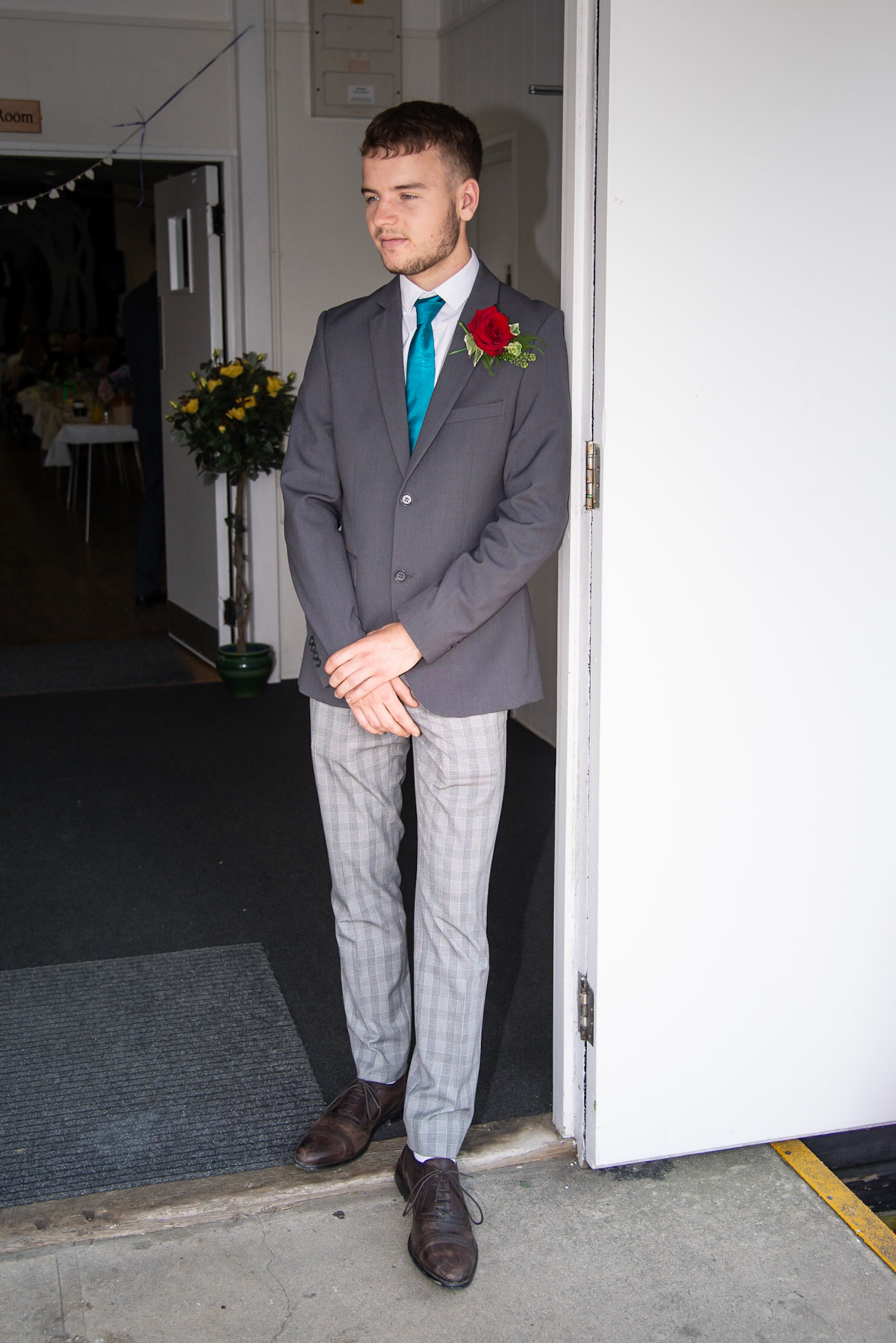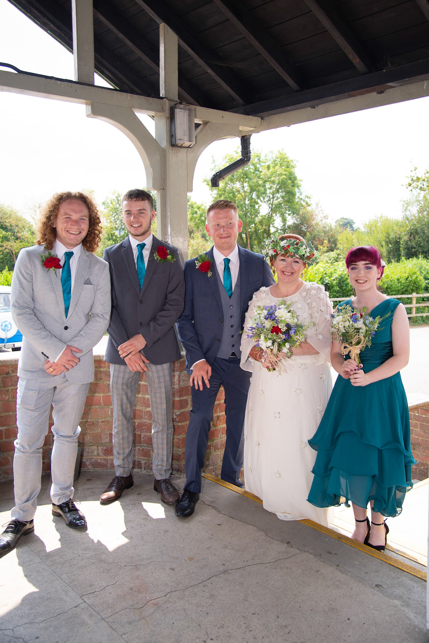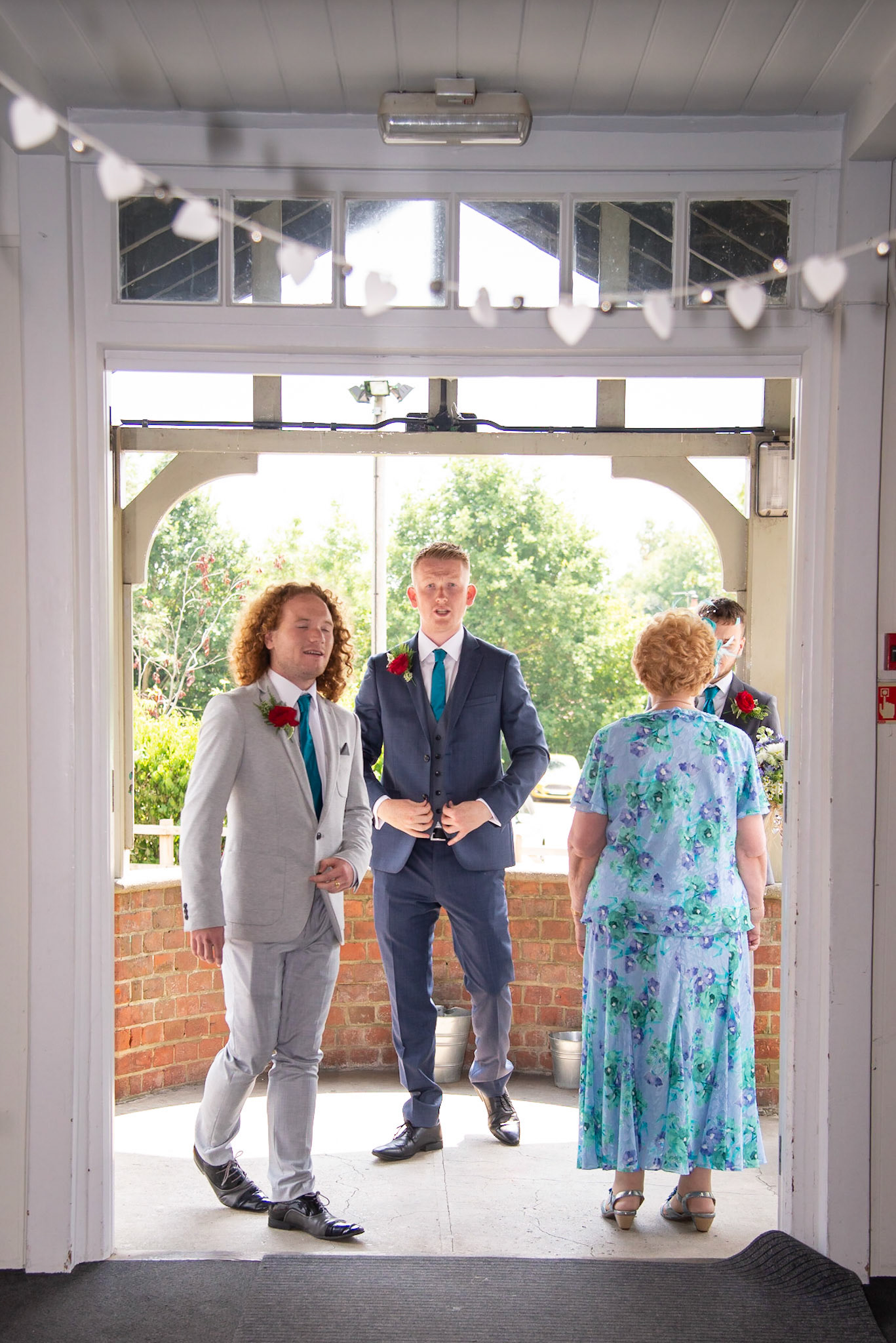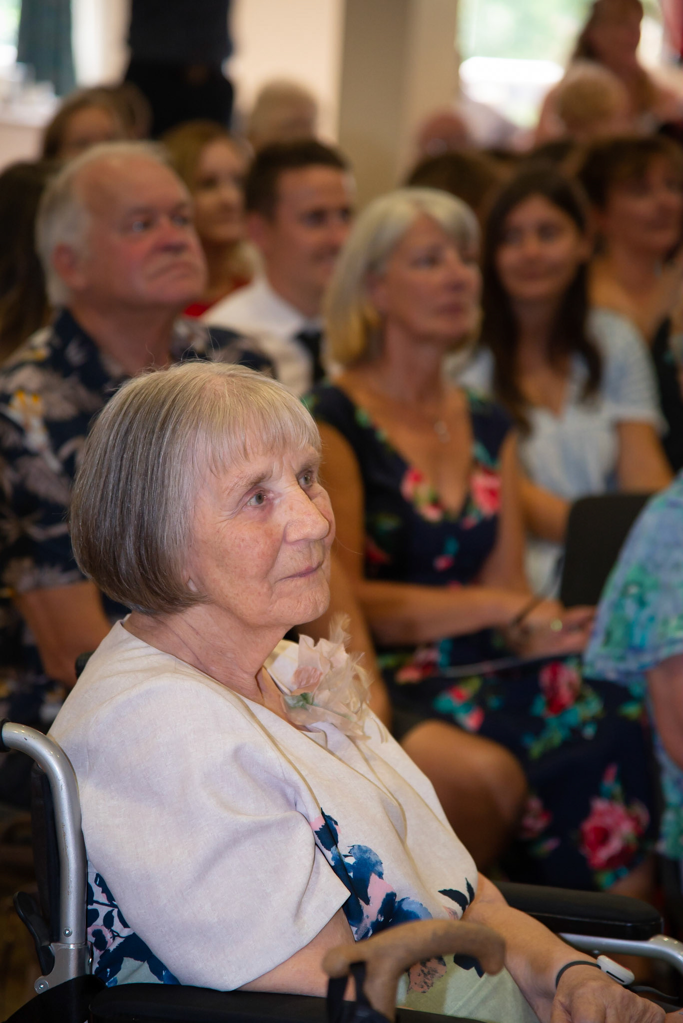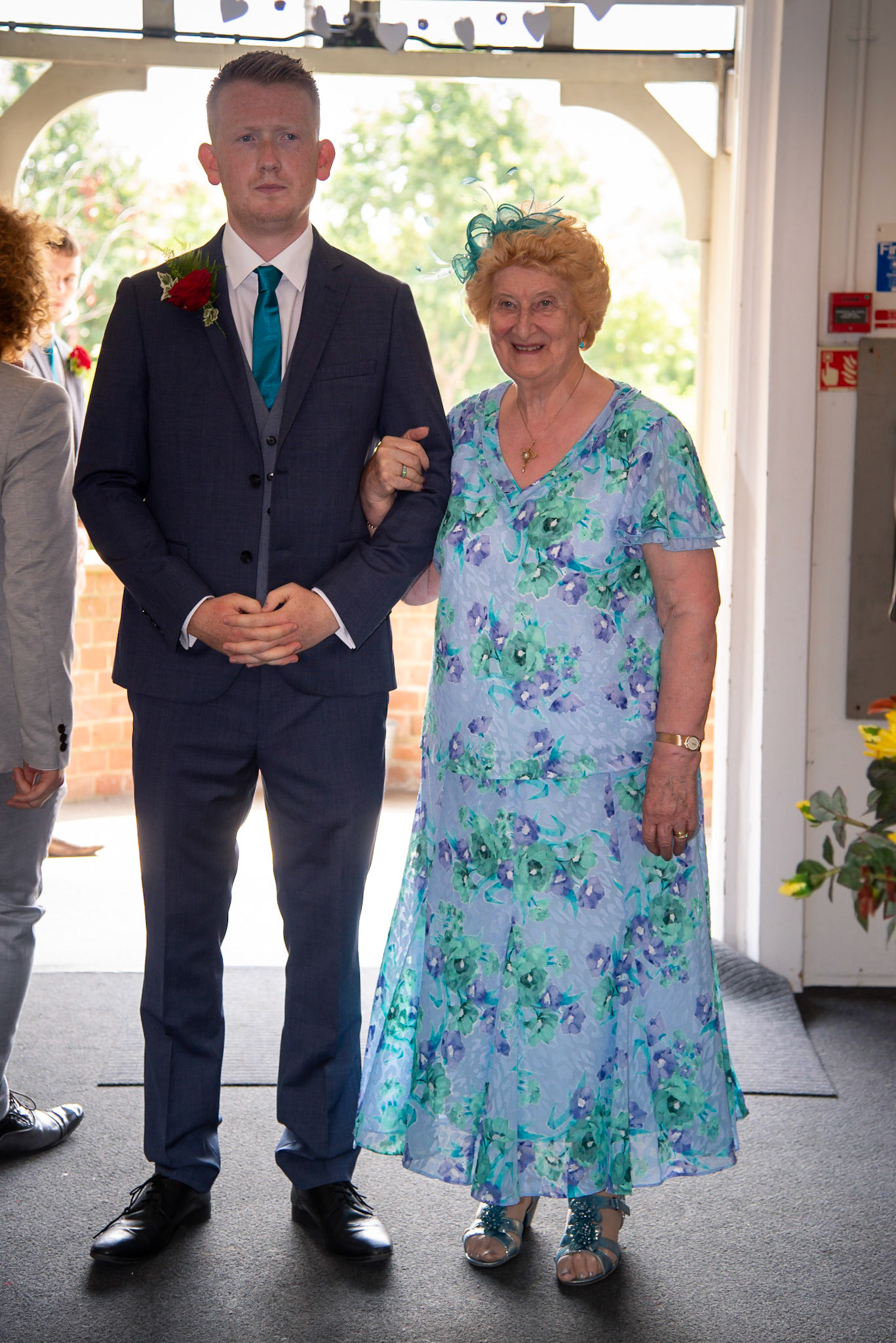 Sally-Ann arriving at the hall walking down the aisle to meet Paddy. The handfasting ceremony and Mike playing during the service.